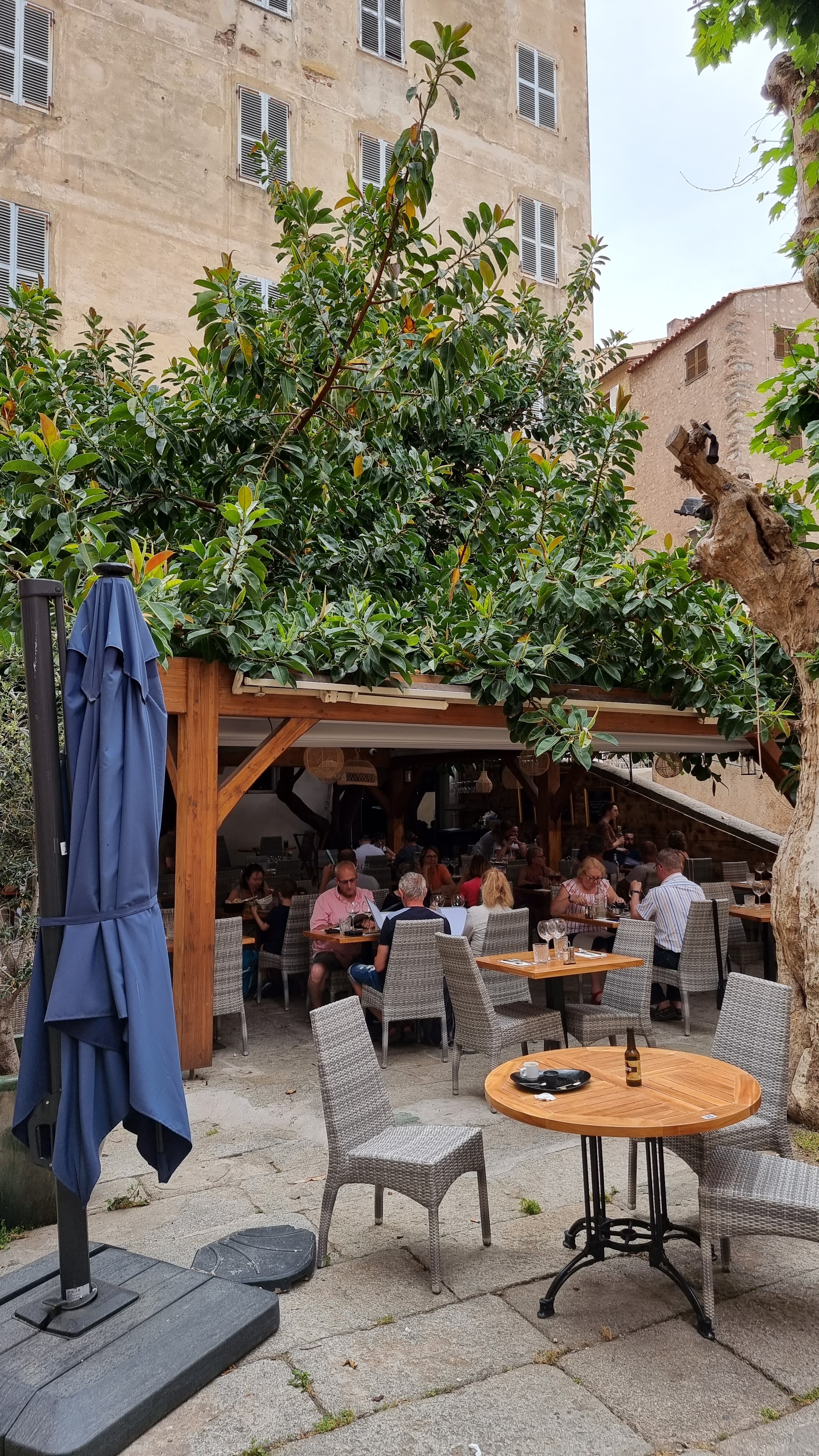 bien placé un peu à l'écart des rues piétonnes commerce, près d'une biscuiterie familiale (odeurs agréables!!), terrasse immense, ombragée par un ficus planté en 1937!! plats corses typiques, bien cuisinés, avec du goût, des saveurs et pas trop épicés. personnel aimable et efficient