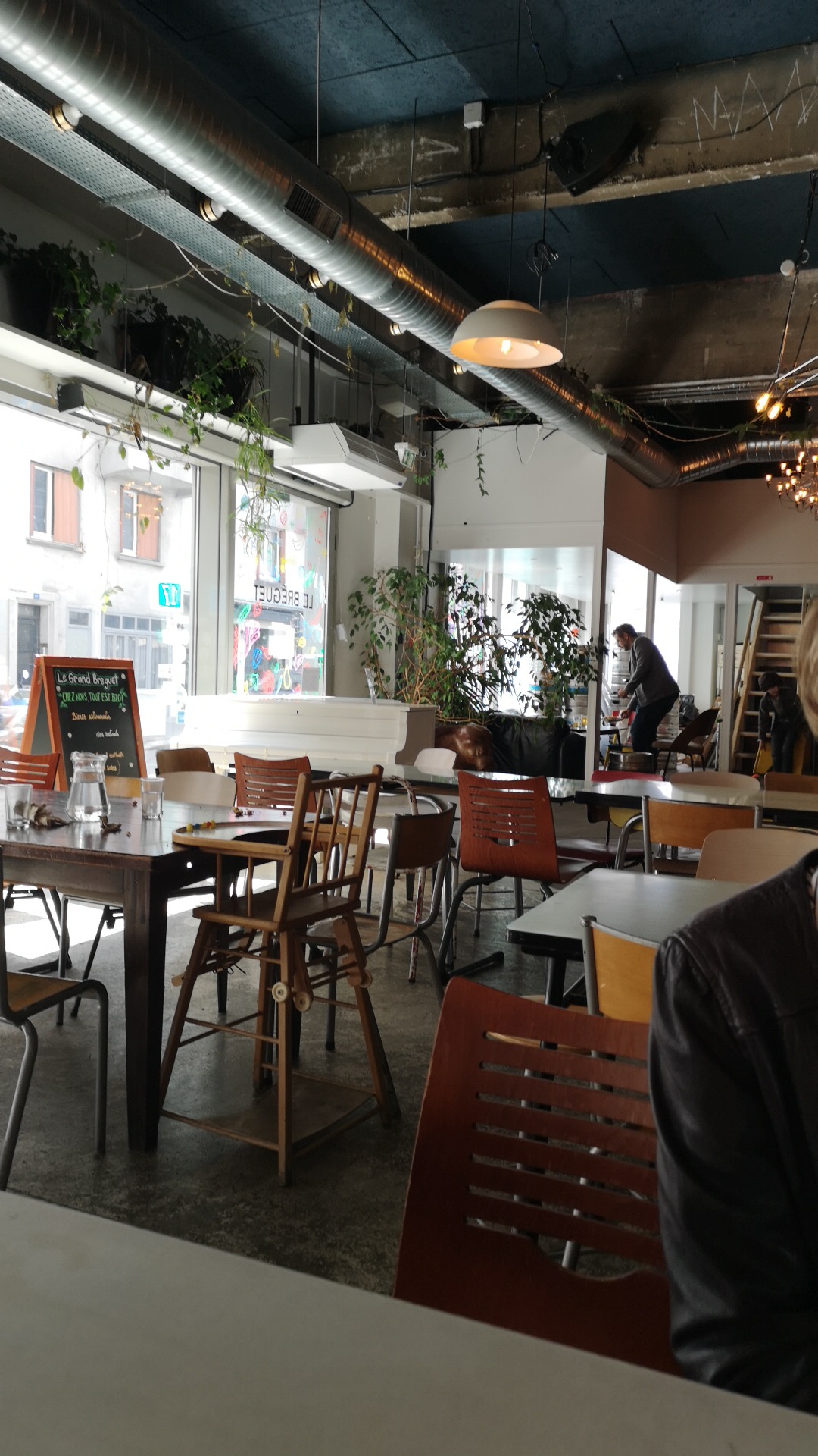 Grand espace bobo industriel sympa type ground control où les parisiens se retrouvent avec leurs gamins pour un brunch des familles ou pour bosser. Bon rapport qualité prix (bol avec base féculent + protéine (11€) ou veggie (9€), très bon succulent au chocolat).