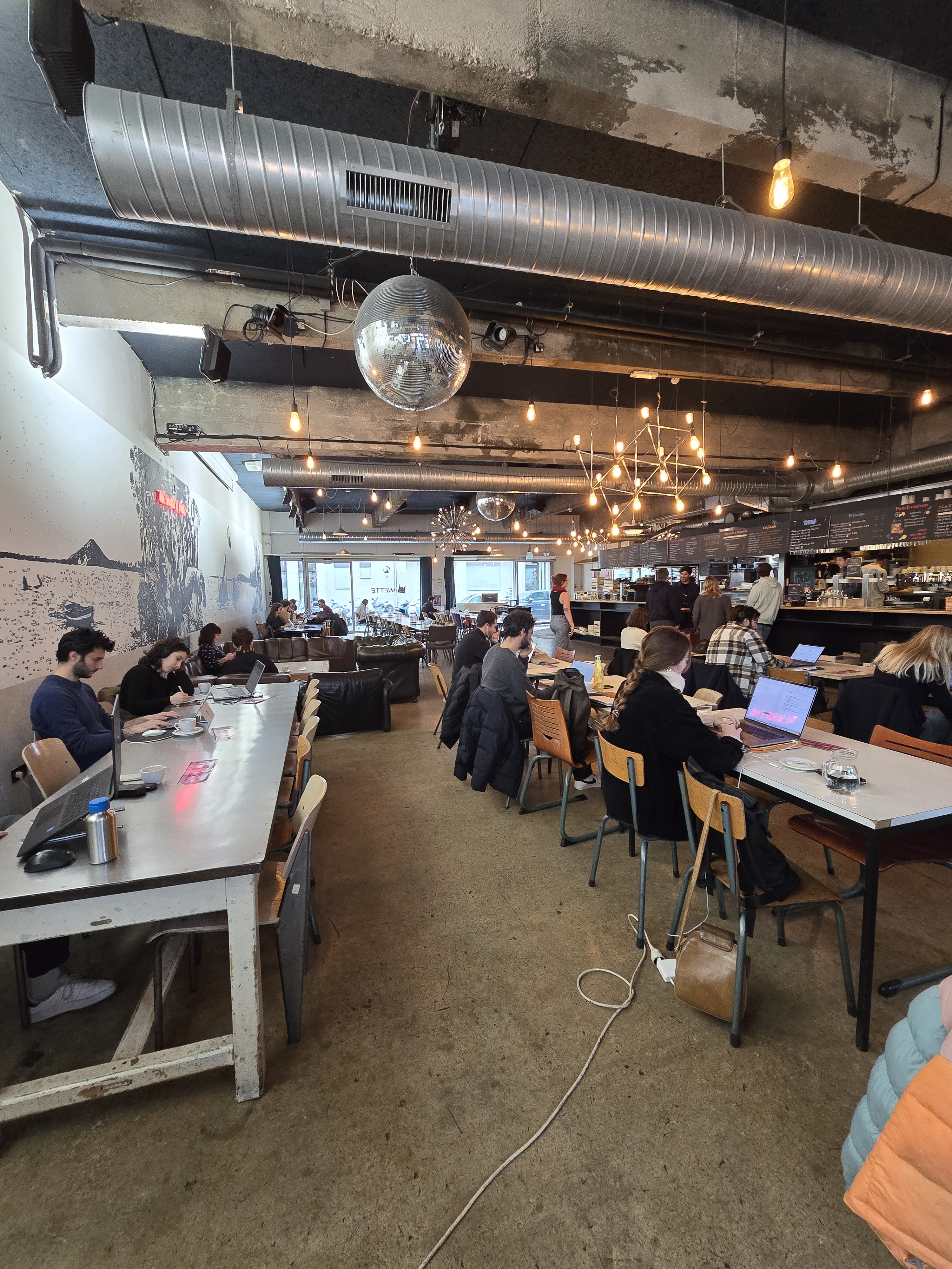 Ambiance parfaite, autant dans la lumière, l'ameublement et la playlist. Super endroit que ce soit pour parler avec des potes ou en coworking, ils font du super bon café, et à en juger à l'odeur la nourriture doit être tout aussi bonne