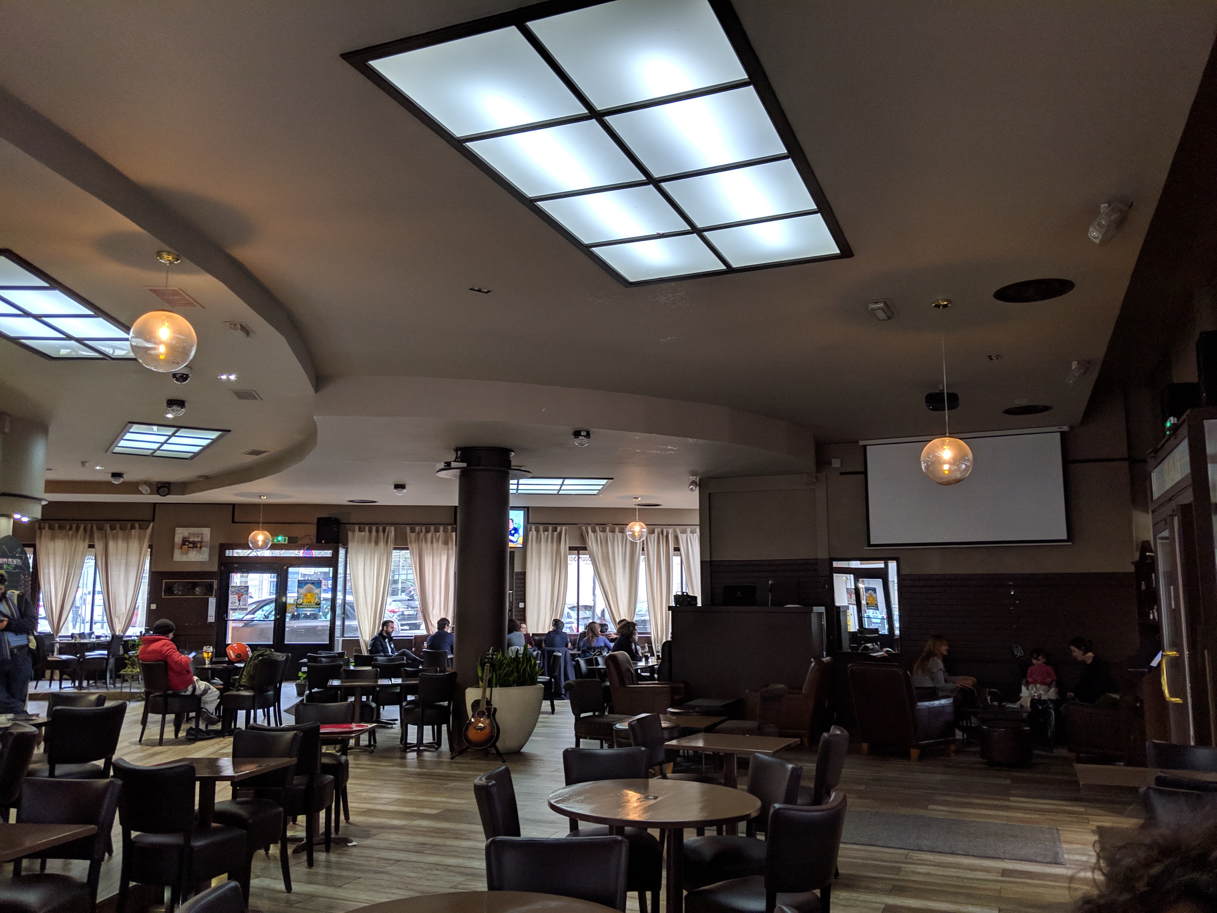 La carte des boissons, la nourriture, la décoration, tout est assez basique. C'est dommage car ils ont une clientèle fidèle (coucou Ubisoft), ils ont la possibilité parfois d'être sympathiques au service... Mais malheureusement tout le reste pêche. On a la sensation d'être dans une grande salle de bureau ou un bâtiment administratif qui aurait décidé de servir des bières en mettant des tables, sans une once d'effort sur l'ambiance. Les planchas ne sont pas recommandables, mais encore une fois, il y a un potentiel énorme dans ce lieu, j'ose vraiment croire que les choses changeront avec le temps. Refaites la déco, mettez plus de service à table. Éclairez davantage, stoppez les karaoké forcé (et pas vraiment calibré), faites de vrais plats, embauchez des bons cuistots, et on aura là un vrai lieu convivial.