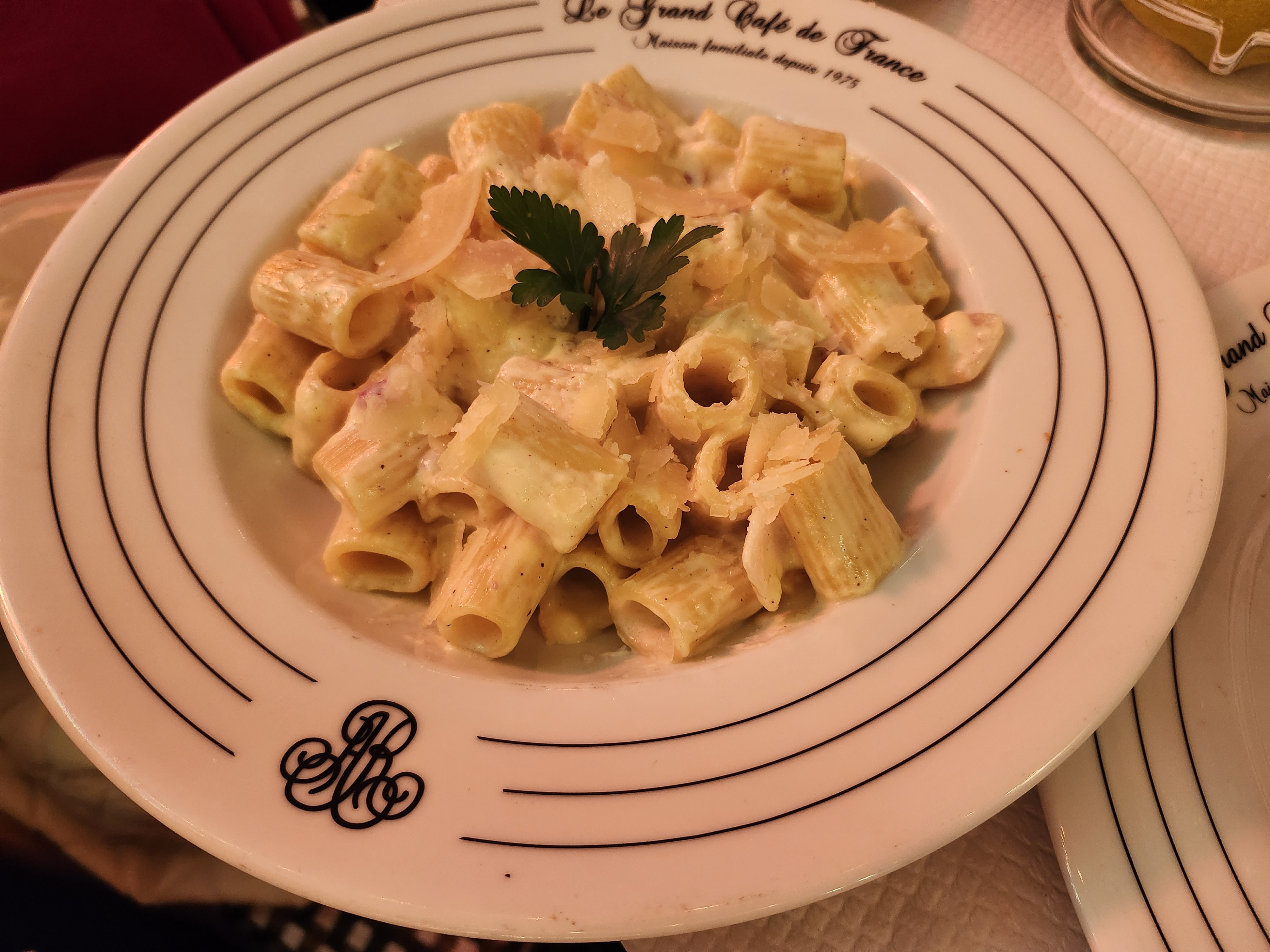Obligé de laisser un avis car Le Grand Café s'est vraiment démarqué tant par le service que par l'ambiance. Nous avons été accueillis si chaleureusement, si bien traités et accueillis avec des salutations amicales de la part de tous les employés. La nourriture était bonne, j'avais un steak frites et mon mari des pâtes. La vue côté rue était amusante et la terrasse romantique. J'ai oublié mon pull sur une chaise et le propriétaire (?) L'a immédiatement remarqué et m'a signalé. Je reviendrais pour le service !!