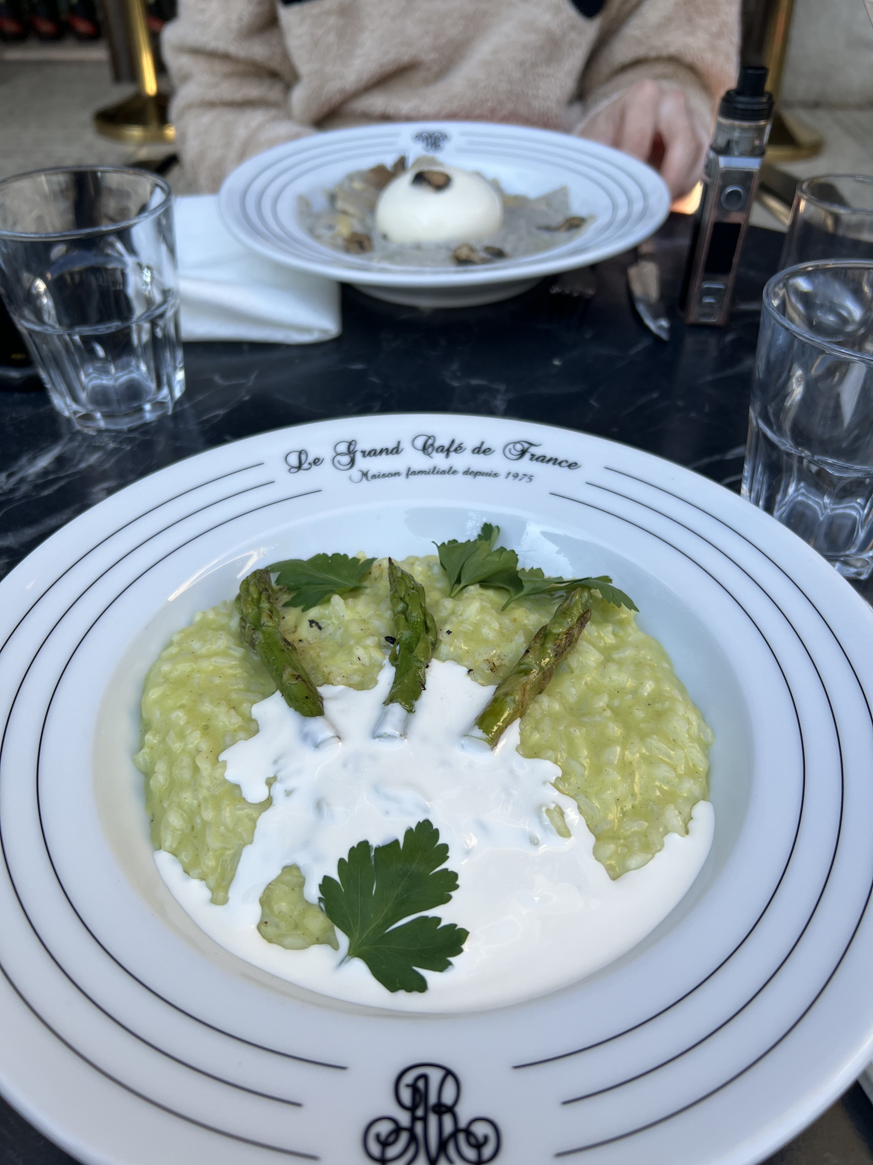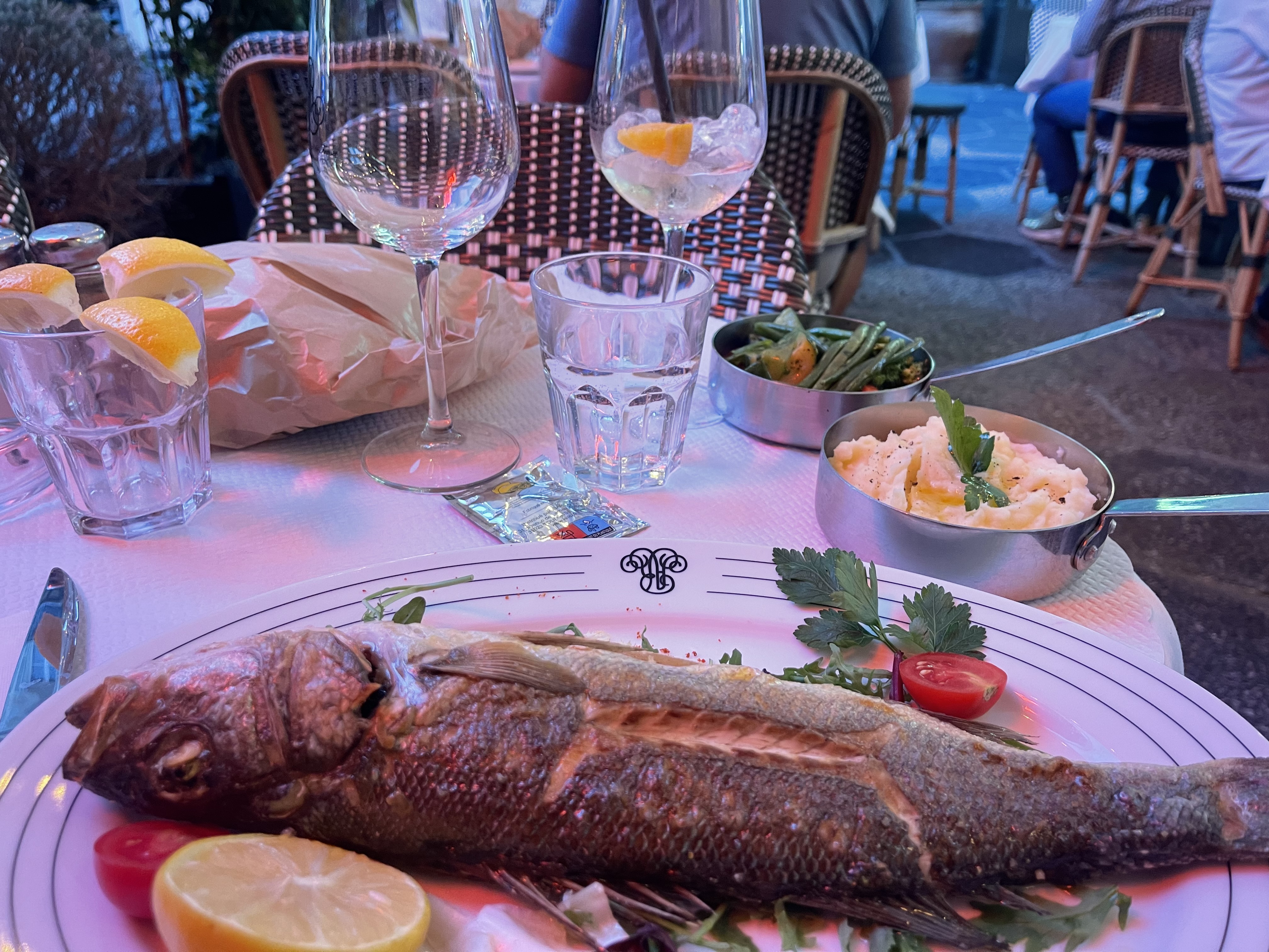 Moment fabuleux au Grand Café! Et c'est grand ? Nous avons commencé avec des cocktails, puis l'apéritif aux œufs à la diable avec une salade grecque. Le plat principal était le Branzino. Tout simplement délicieux😋Belle ambiance à l'intérieur comme à l'extérieur. Ils avaient même une salle à manger sexy sur le toit ! Le personnel était bien habillé et si gentil💖L'un des plus beaux restaurants que nous ayons visités à Nice🇫🇷