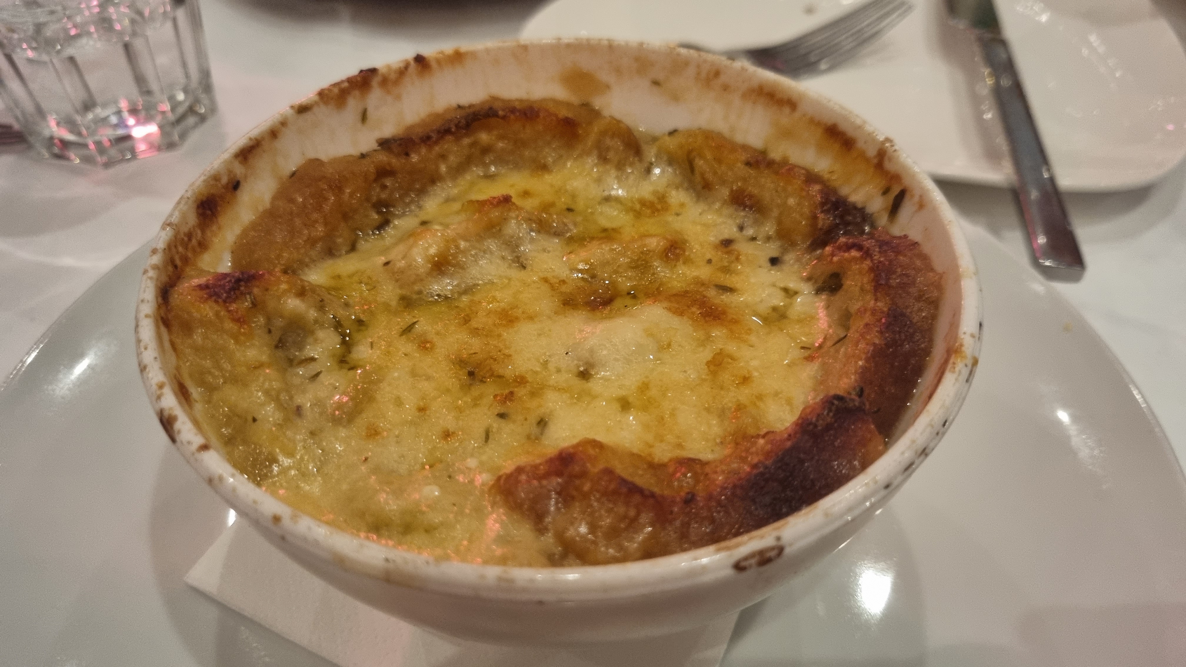 La soupe à l'oignon « française » n'était absolument pas assaisonnée. L'ambiance et le service étaient de premier ordre. Mais cette soupe… la plus surfaite (et peut-être la moins impressionnante) que j'ai jamais mangée