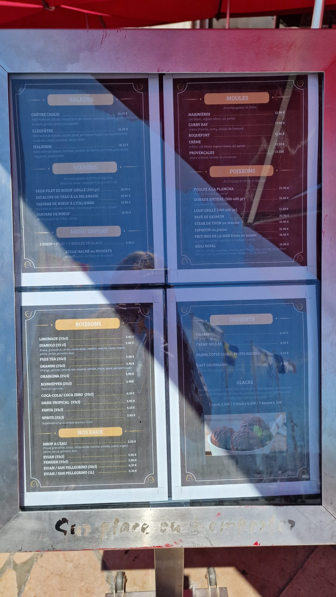 Continuez comme ça,et vous n'aurez,plus personne. À force de prendre les vacanciers pour des cons, c'est à te dégoûter de venir dans le sud. Moules crèmes infâmes, frites très sèches, une carafe de rosé qui n'est jamais arrivée malgré nos relances. 2 pour l'ambiance, car l'emplacement est sympa . 2 serveurs et serveuses se démènent et font ce qu'ils peuvent, mais je ne me ferai plus avoir, je regarderai les avis avant de m'attarder à une table !!!!! Et c'est bien dommage de ne pas pouvoir faire confiance et au final de te faire pourrir ta belle soirée de vacancier !