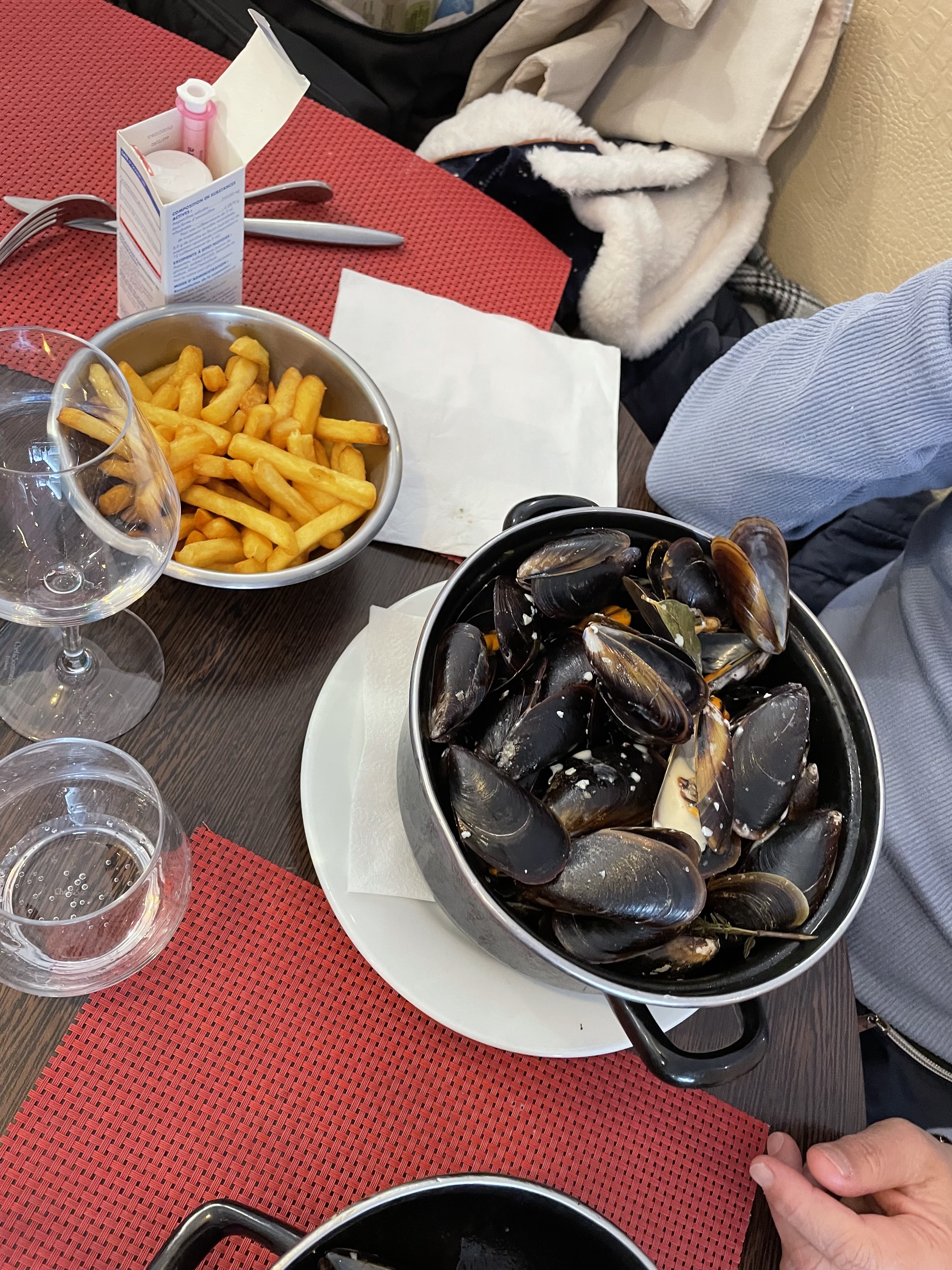 Moules à la crème (on la cherche quand même!!) mangeables mais loin d’être exceptionnelles et frites un peu sèches (frites surgelées). On a commandé du vin que nous attendons toujours !!! malgré 3 relances!!! Du coup, après le plat on est allé payer (prix plus chers que ceux affichés !!!) alors qu’habituellement nous prenons toujours un dessert au resto. Nous avons exprimé notre mécontentement à la serveuse qui a fait un geste commercial en nous offrant des desserts, seul point positif de ce resto avec l’emplacement. Je ne recommande absolument pas!!! Et je ne suis pas une personne qui a l’habitude de critiquer et encore moins de mettre des avis négatifs sur les réseaux. Je pense qu’il manquait au moins un(e) serveur(euse) et qu’il aurait fallu que le gérant enlève des tables pour que ce soit gérable pour les 2 serveurs.