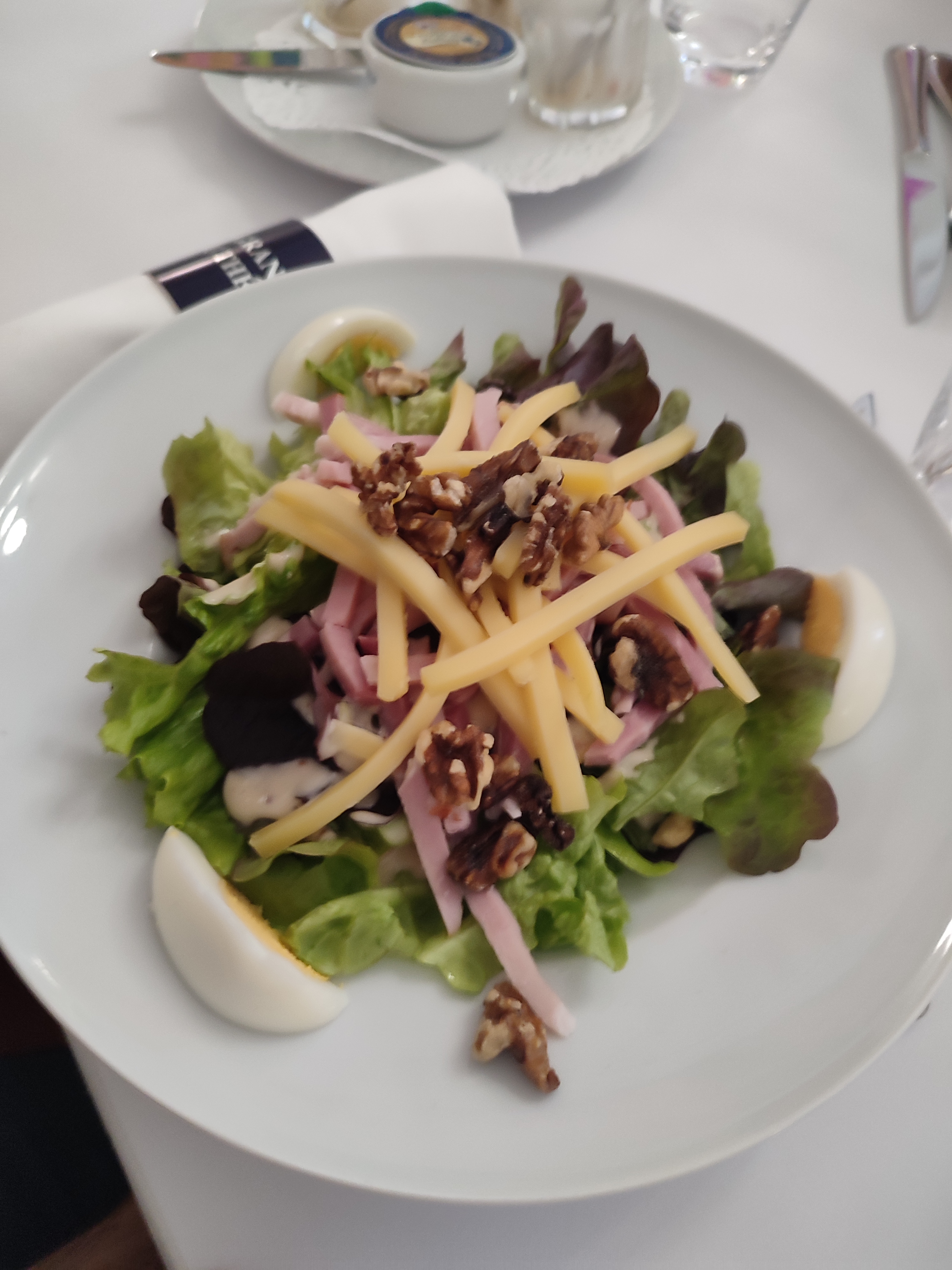 18,50 EUR 3 feuilles de salade sans sauce avec 5 lamelles de comté, de jambon et 3 pauvres cerneaux de noix, c'est quand-même abusé. Et c'est pas le petit cornet de frites servi avec qui change grand chose. Dommage le cadre est sympa et le service aussi.