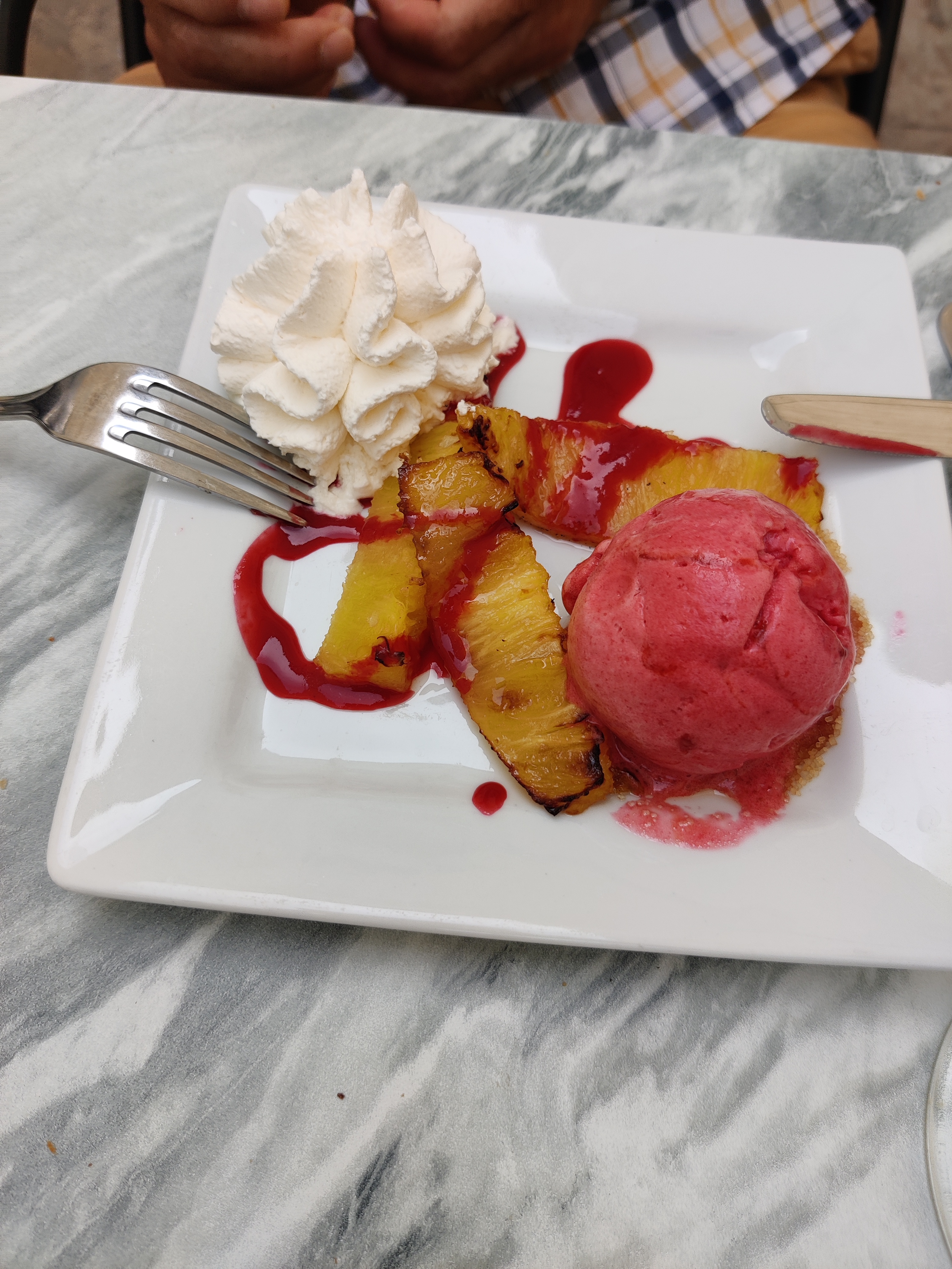 Très bel endroit. Bonnes glaces. Mais accueil déplorable. Arrivée à 16h en famille, le serveur nous a placé sur la terrasse en plein soleil car des tables étaient réservées pour le service du soir...soit 3 heures plus tard! Serveur débordé qui courrait déjà partout, je n'ose pas imaginer en plein service ce que ça donne. Jeune barman Très gentil en revanche, je lui souhaite bien du courage vu son collègue.