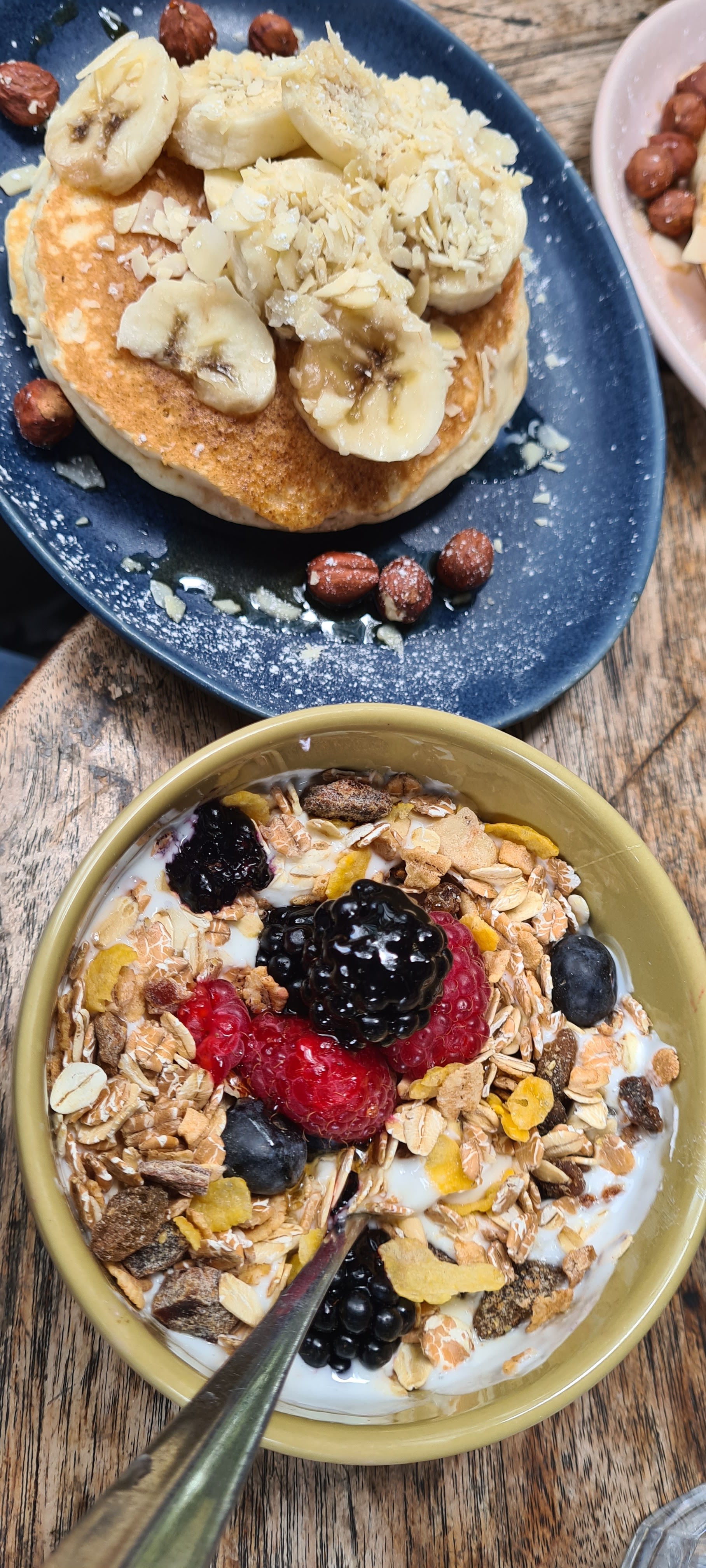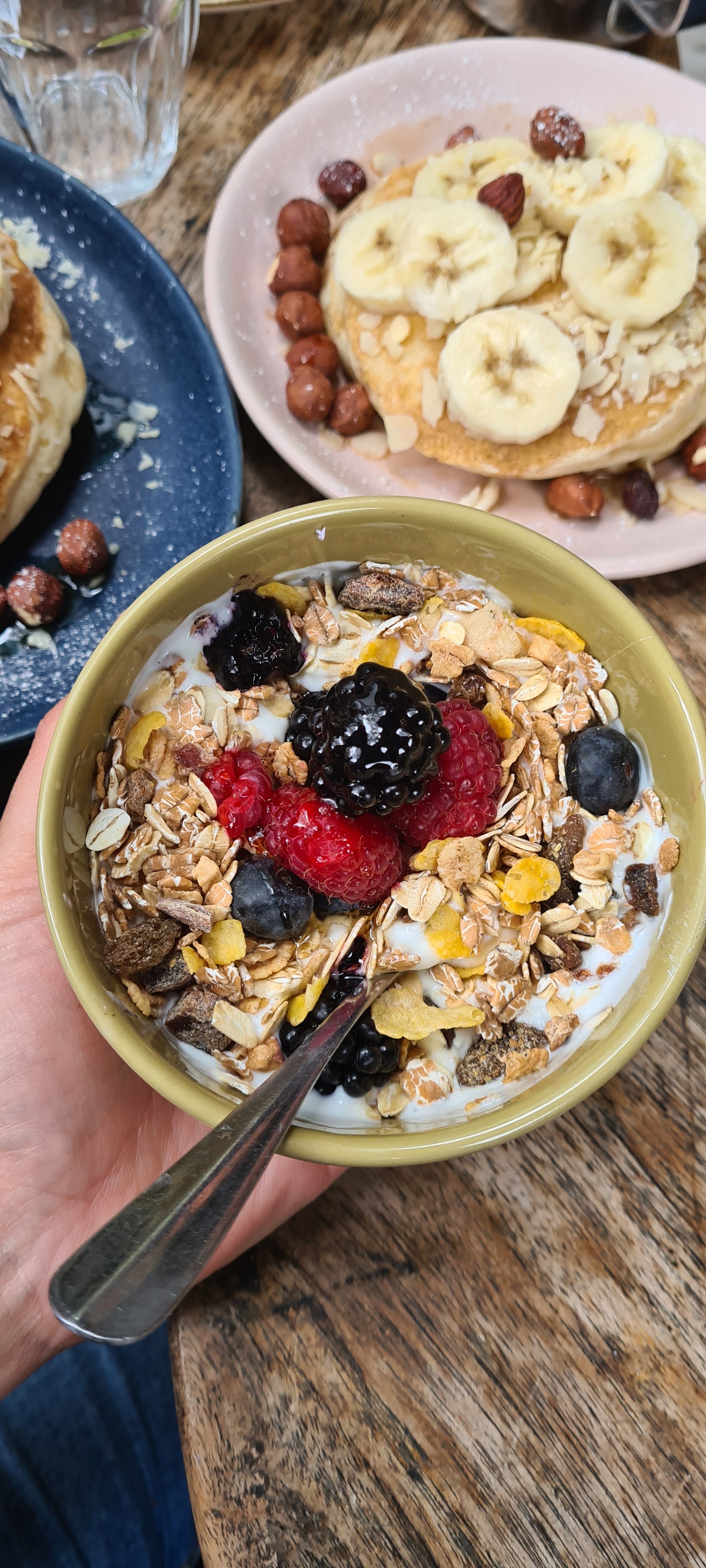 Ce n'était pas la première place sur notre liste mais je suis heureux que nous soyons arrivés ici. Très bonne affaire de petit-déjeuner et bel intérieur. Le petit-déjeuner n'a pas l'air très copieux, mais il est plutôt satisfaisant grâce à un grand bol de fromage cottage (qui ressemble en réalité davantage à un yaourt grec).