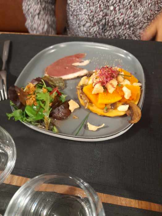 L'entrée (toast de mousse et lards snackées) manquait de goût, le toast était juste 1 tranche de pain de mie pas grillé, dommage.... Le plat (andouillette de canard avec quinoa). l'andouillette était bonne... Mais aucune originalité, peu de sauce Dessert (blanc mangé à la mangue) pas de goût,très très peu de coulis, dommage c'est le seul élément qui donnait du goût... L'ensemble manque cruellement d'originalité.. nous étions déçu de la cuisine malgré un bonne accueil.