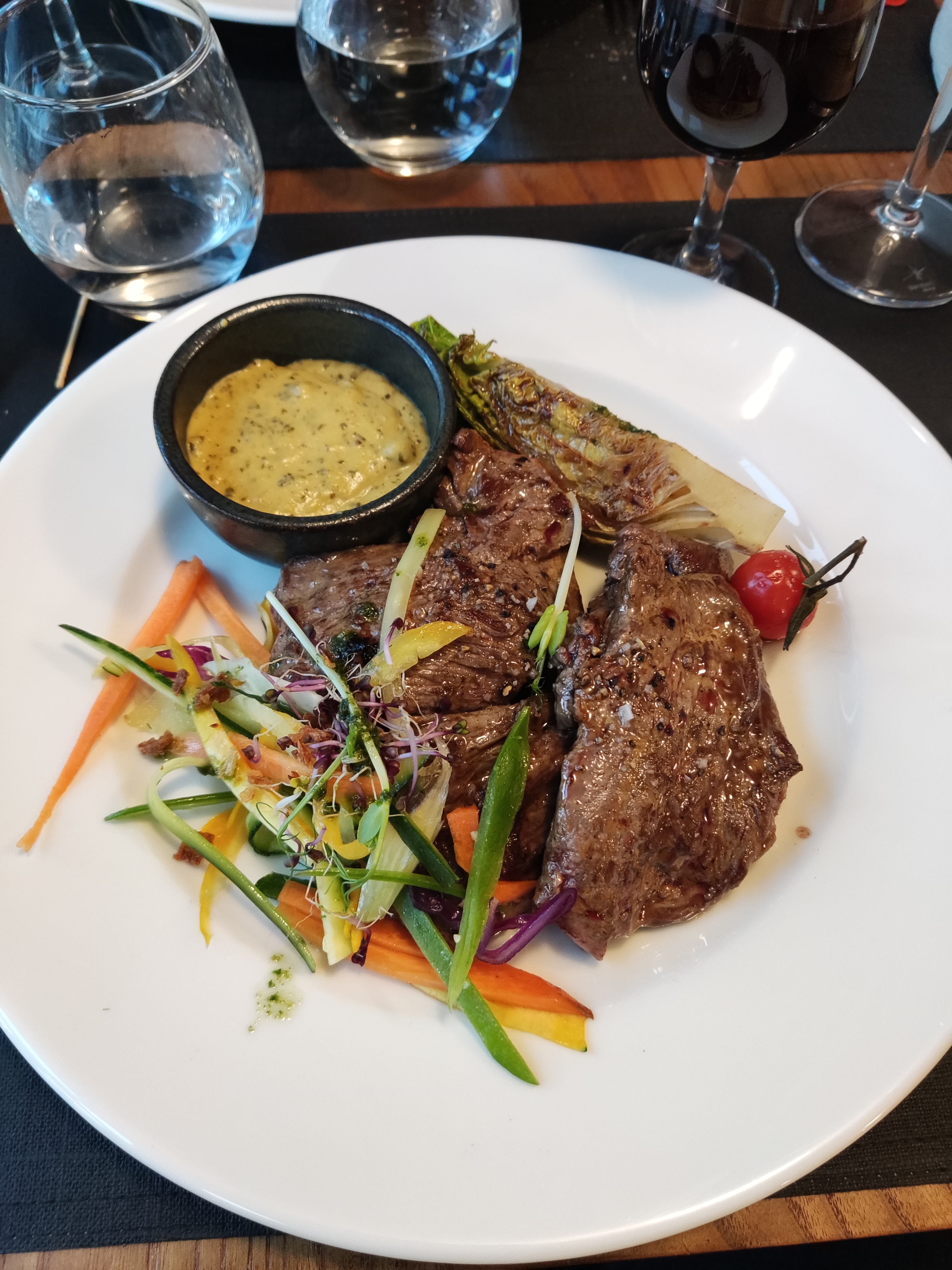 Que dire sur ce restaurant??? Et bien un menu à 29 € qui ne les vaut pas. Le wasabi complètement absent de la crème.....et pas assaisonné dommage . La viande était bonne un peu trop cuite ( limite à point alors que saignante demandé). Les légumes crus presque de trop ... Insignifiant... Le gratin darphin on sait pas ce qu il fait avec la viande... Le mi cuit au chocolat était lui très bon, mais pas surprenant.... Bref faites vous votre idée. Quand à la déco ben aucune âme.