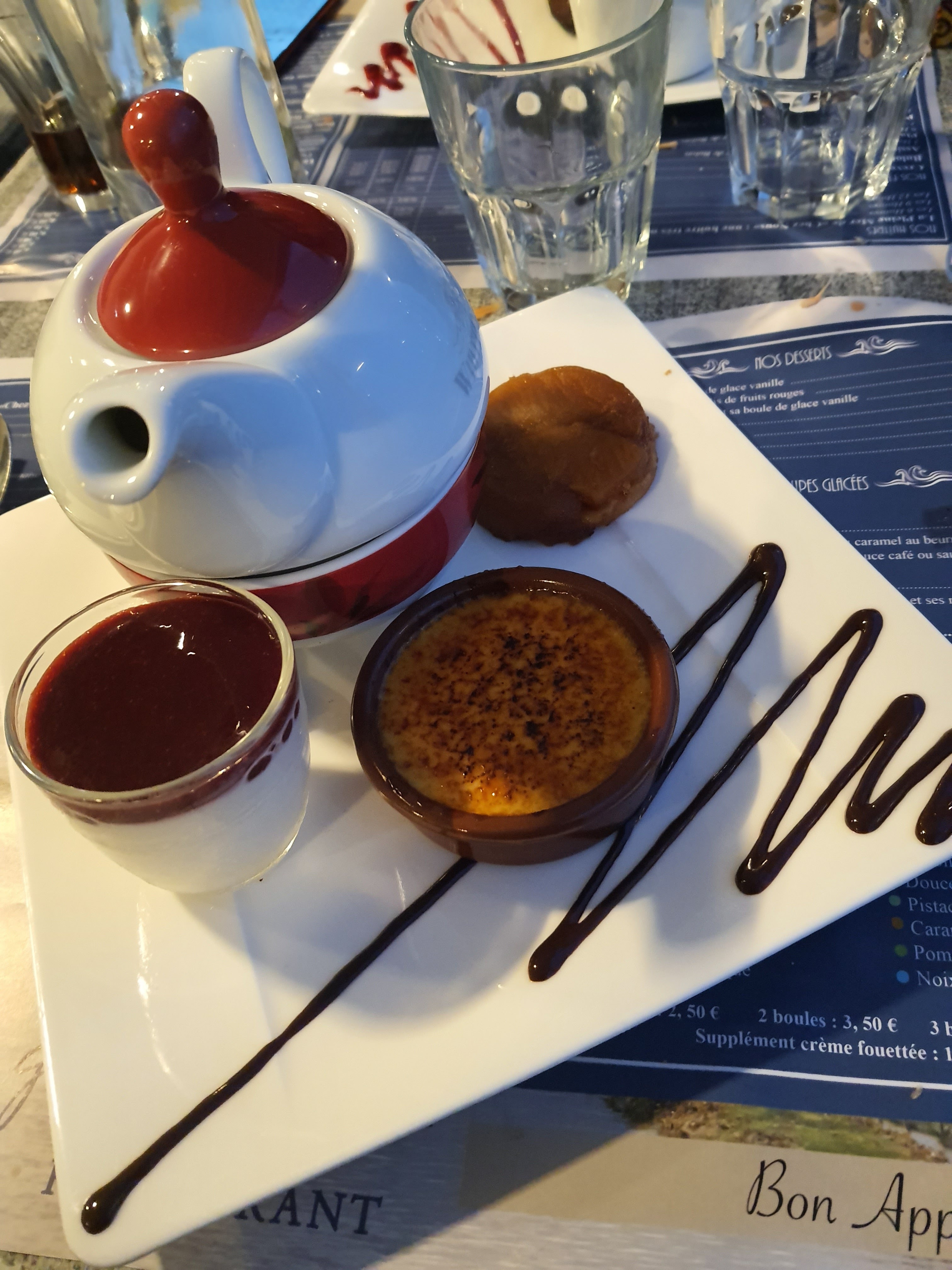 J'étais étonnée de manger des langoustines fades et des crevettes roses aussi car gorgées d'eau, au point que la chair s'était décomposée notamment celle des langoustines. Les crevettes étaient très petites aussi ! La soupe de poisson était fade, tiède et manquait de densité. Je me suis demandée si elle n'était pas diluée. Et les croutons sont des petits croutons industriels. Et attention, la serveuse avait oublié de porter son masque qui était accroché à son poignet et qui touchait l'assiette du dessert. Le steak du burger était un bon steak et les frites étaient bonnes et chaudes. Le café gourmand était bien gourmand et très bon : crème brûlée avec une crème bien vanillée, une pannacota au coulis de fruits rouges avec un bon goût et une bonne texture et une bouchée de tarte tatin. La vue est belle mais je ne retenterai pas l'expérience !