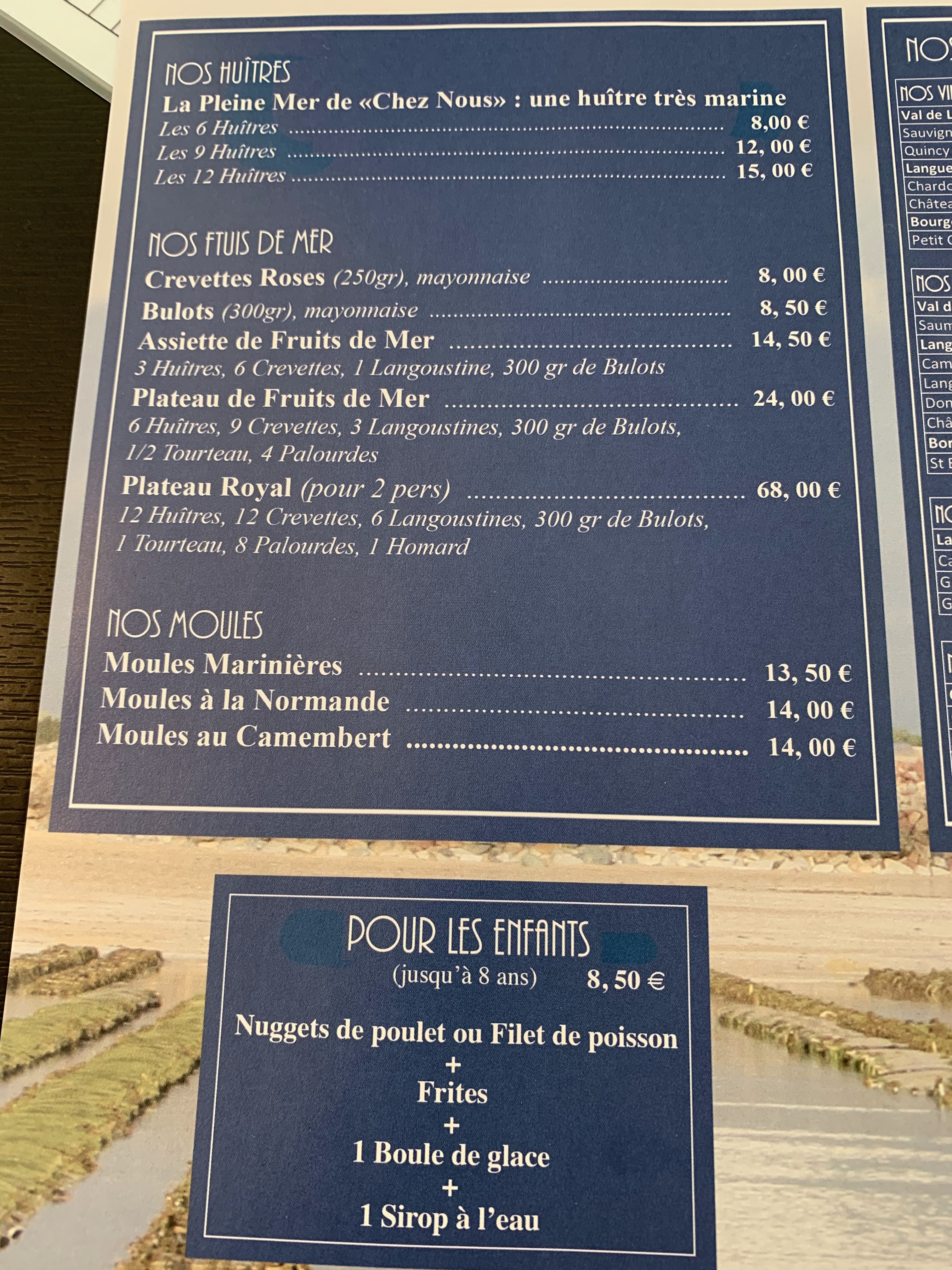 Avoir la sensation de manger les pieds dans l'eau même en étant à l'intérieur. Carte simple mais très bon.