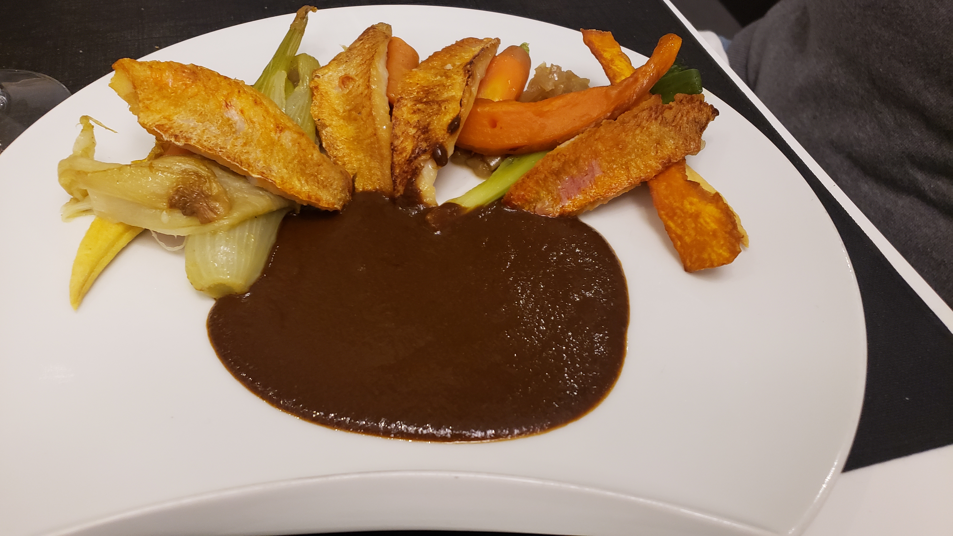 Le chef propose une suggestion terre mer avec des st Jacques bardés de magrets de canard mais il a dû perde le goût car le plat n'a aucun goût juste la sauce !! Pour un plat à 32 euros!! Ma femme a prix à St Pierre poisson noble trop cuit et un accompagnement qui ne donne pas envie de manger et le dessert mont blanc est un bloc de sucre mais où est passée notre gastronomie sûrement perdu dans l'océan. Pour une note de 135 euros là c'est inadmissible !!!