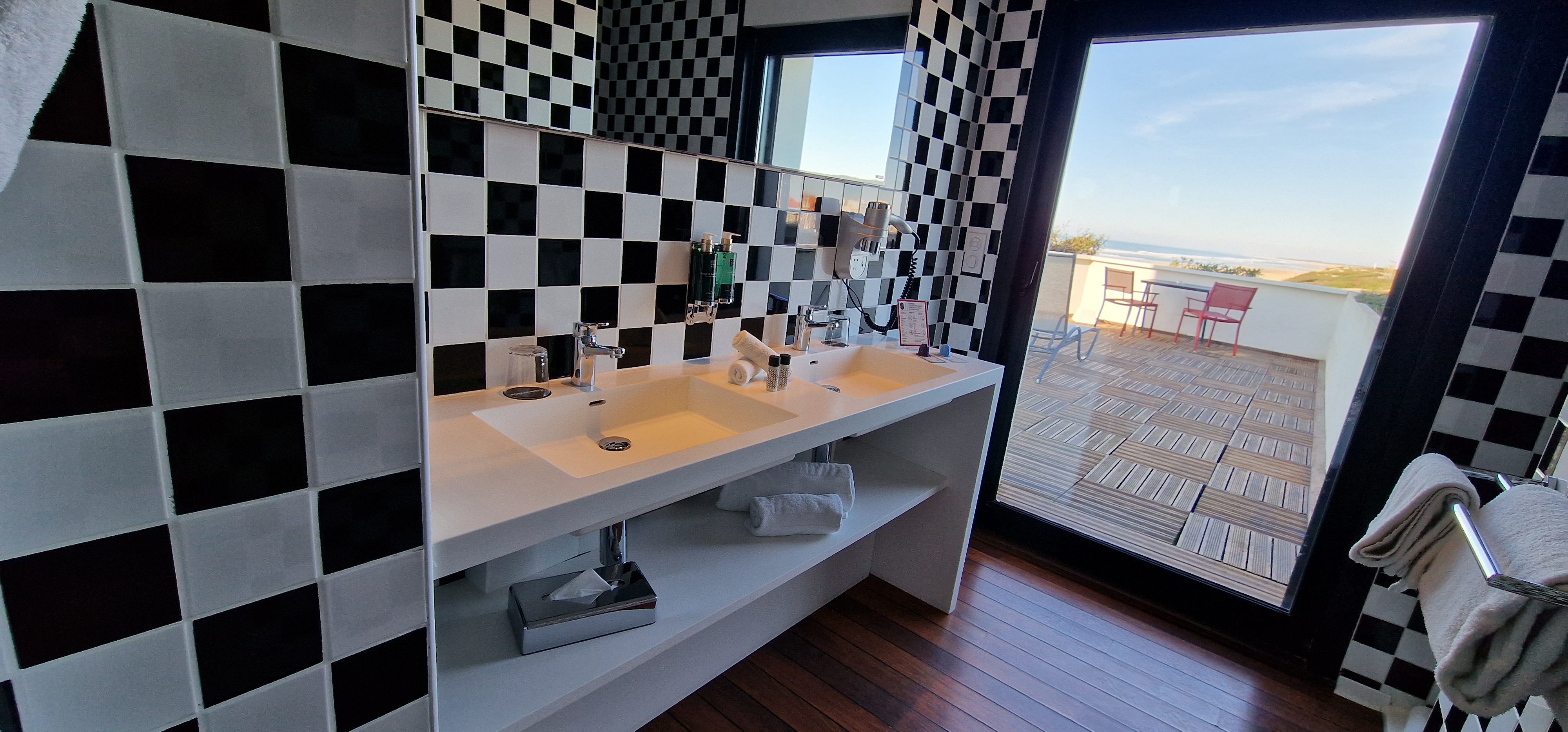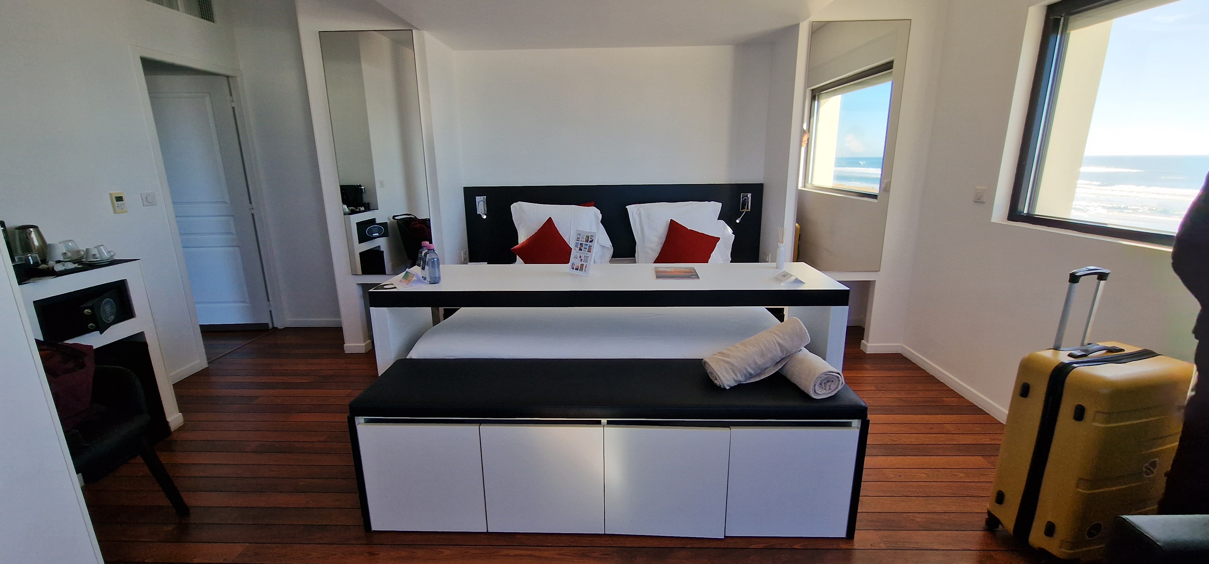 Accueil au top, parking privé sécurisé, terrasse du restaurant en bord d'océan... l'arrivée promet déjà... et la suite... Un rêve ! Que dire... en entrant dans la chambre, Premium avec terrasse vue mer, j'en avais les larmes aux yeux tellement la vue est à couper le souffle ! L'océan par une fenêtre panoramique en face, l'océan par la baie vitrée donnant sur la grande terrasse privative, l'océan par la porte fenêtre de la salle d'eau ! Un magnifique parquet style bateau, une baignoire à pattes de lion, dommage, on ne voit pas l'océan quand on est dedans, personnellement j'aurai créé une petite estrade pour la surélever et là le pied aurait été total ! Le lit en 180 plein de coussins, la télé avec Canal+ Canalsat, une petite machine à café et du thé à disposition et un frigo mini bar bien rempli... La salle d'eau pleine d'attentions aussi : kleenex, sels de bain, petite boîte avec cotons tiges, coton démaquillants, necessaire de couture et bonnet de bain, et des capsules d'aromatherapie pour la douche ! Petite précision importante : lorsqu'on est dans la douche, si on ouvre la baie vitrée, à galandage comme celle de la chambre, on peut regarder l'océan en profitant de l'eau aromatherapisée. Nous n'avons pas manger au restaurant de l'hôtel. Le petit-déjeuner, offert avec la chambre, peut-être pris dans la salle du restaurant jusqu'à 10h30. La salle est tout en fenêtres permettant de profiter de la magnifique vue sur l'océan, tout en profitant du buffet de mets chauds et froids, salés ou sucrés (viennoiseries, cannelés et autres bonnes choses), pain avec grille pain, etc... Le seul petit bémol que j'émettrai, c'est la pression de l'eau dans la douche le matin, ainsi que la température de l'eau, tout juste tiède même à fond, ce qui m'a un peu gâché le plaisir de mon bain... Mais sinon, tout était parfait !