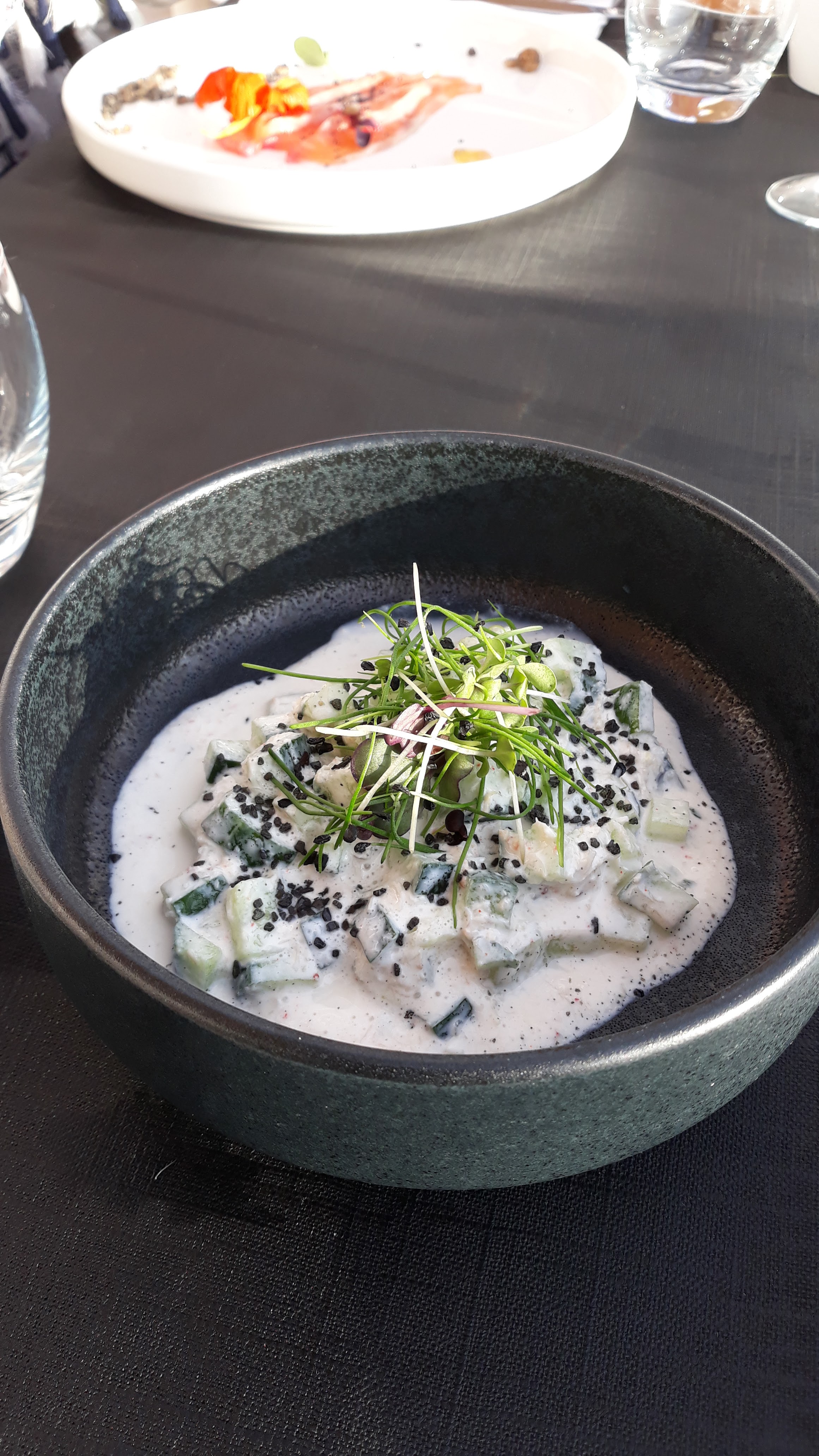 Superbe cadre, accueil très souriant et serveurs attentifs mais 1h30 d’attente (en arrivant à midi avec juste 4 tables de prises au total) juste pour l’entrée qui était vraiment petite et le plat idem. Pour le prix les plats se veulent recherchés mais ne le sont pas, mal ou pas assaisonnés. On est reparti en ayant faim ... on a du complété le repas ailleurs. Conclusion problème d’organisation en cuisine et rapport qualité prix très décevant