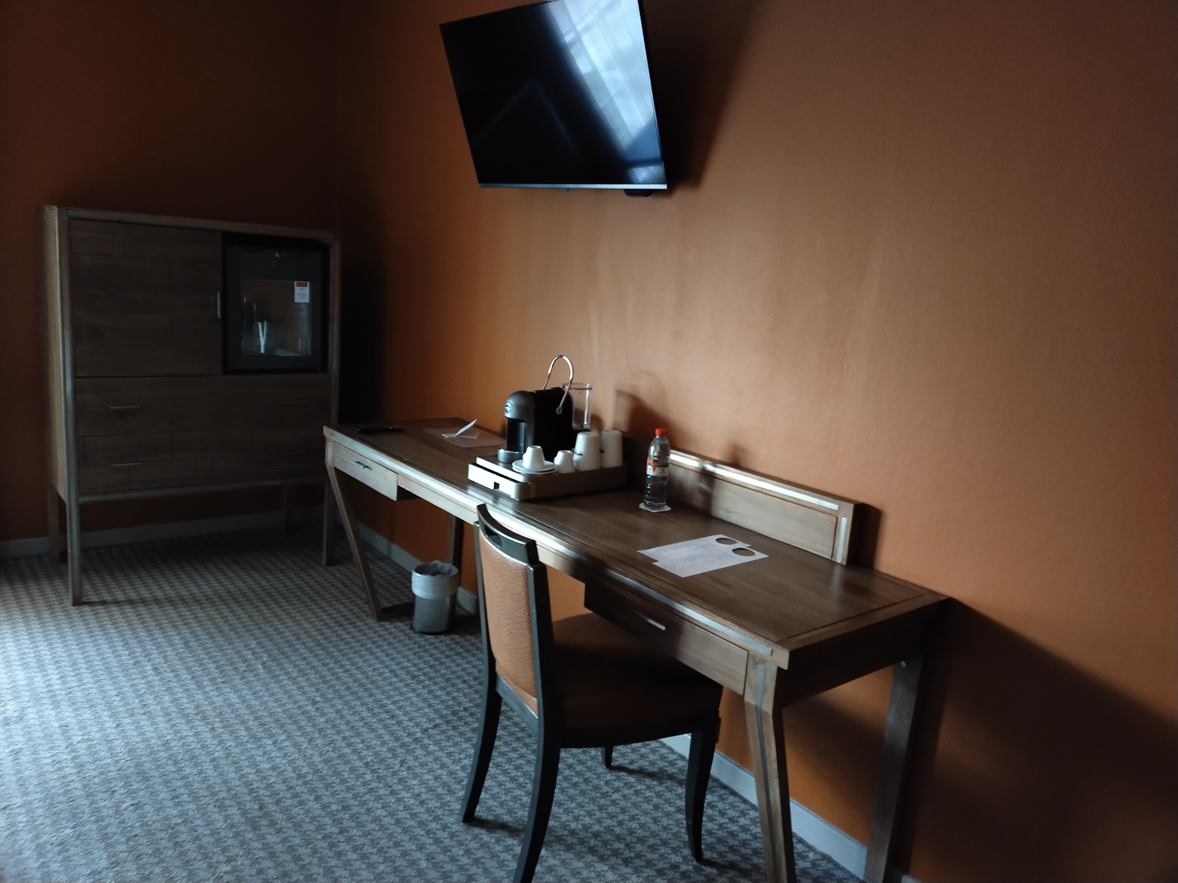Chambre cosy à éviter vraiment pas à l’image d’un hôtel 4 étoiles En gros on nous a expliqué que tout l’hôtel a été rénover sauf le 4e étage qui n'est pas à la hauteur de l’hôtel Pas d’air conditionné, un radiateur d’appoint au milieu de la chambre , frigo fonctionne par donc pour les boissons fraîche direction le bar, prise qui tienne plus , carrelage de la baignoire complètement décoller et sans compter les nombres de tâches sur la moquette au sol … Déçu de la chambre , sinon très belle hôtel et très bon restaurant personelle sympathique .