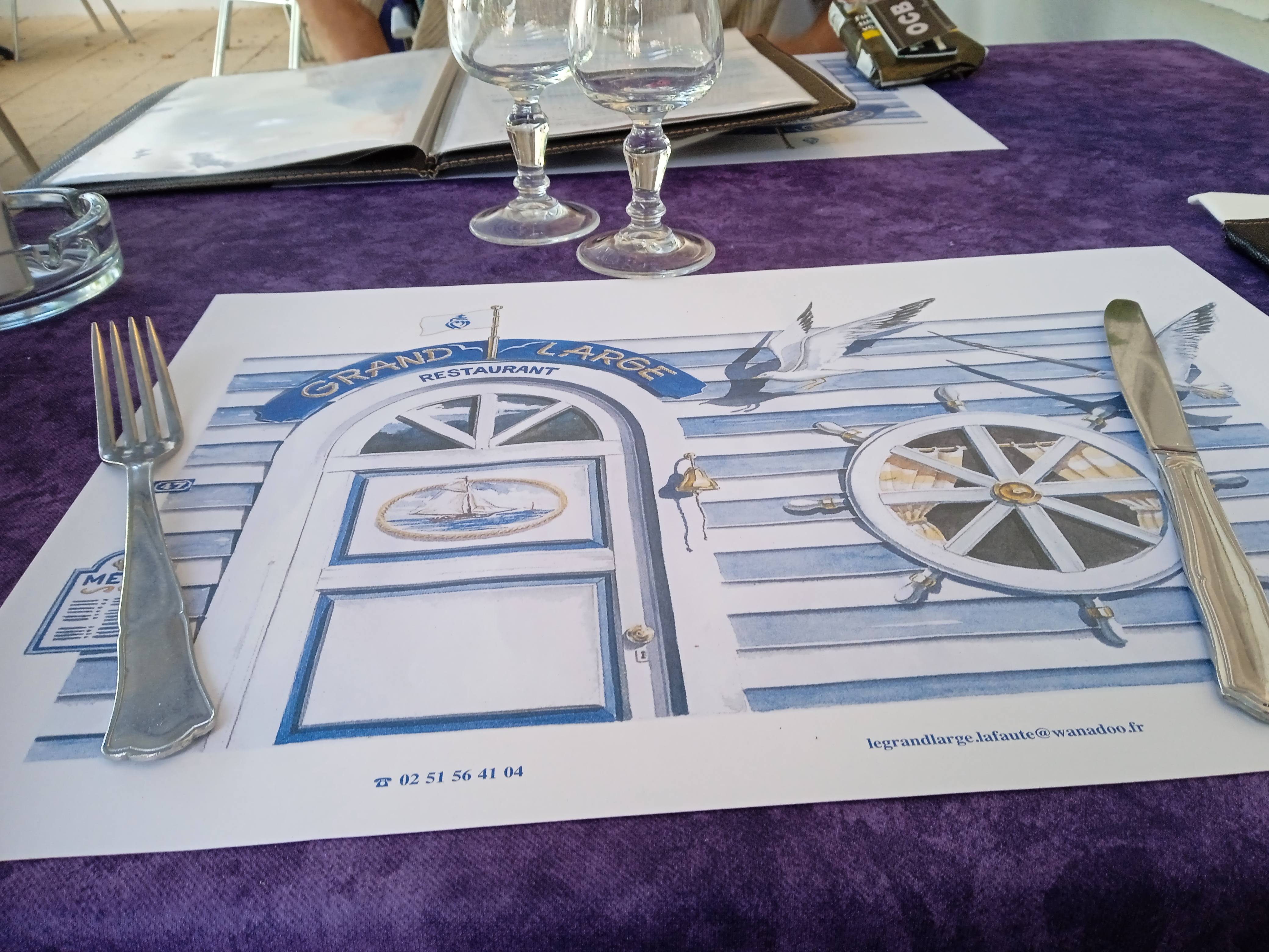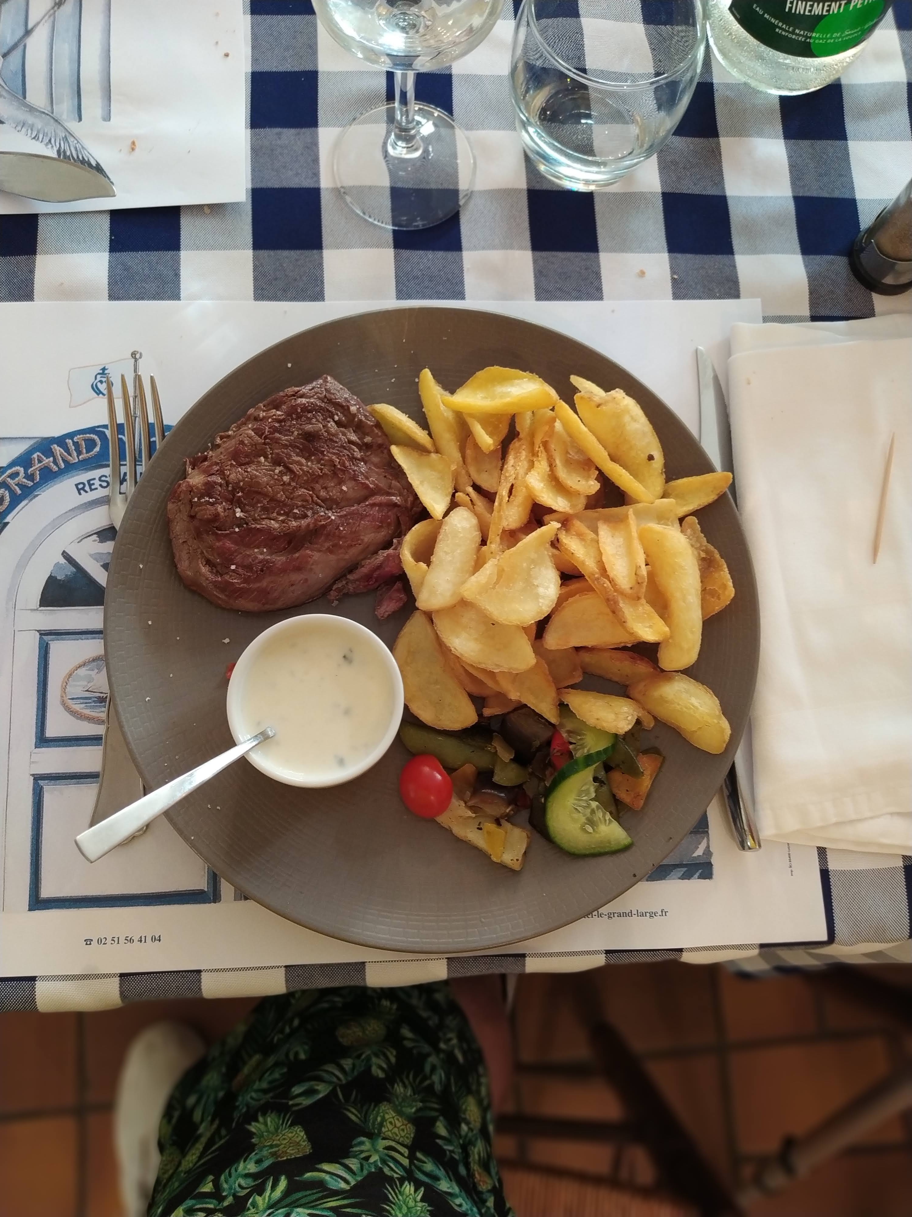 Le restaurant est top. Le grand large n'a pas, vue sur mer mais une terrasse ombragée. Le grand large c'est dans l'assiette, 18 euros le menu ou plus, une sacrée brise de saveurs. Qualité, gentillesse, rosé au pichet. j'embarque pour ce vaisseau quand vous voulez. Merci pour cette escale.