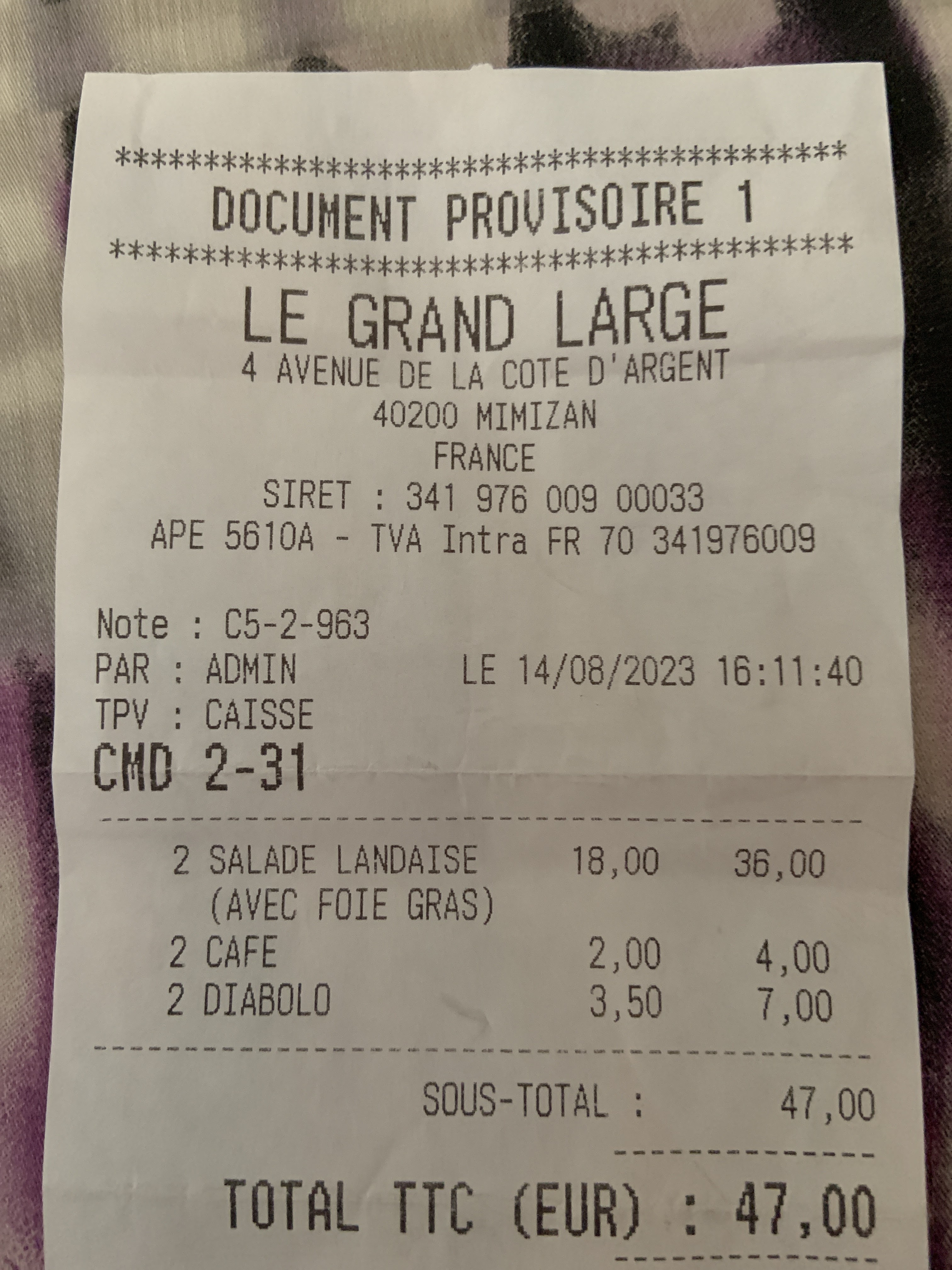 Le Grand Large ! Je n'avais jamais vu un croque monsieur si petit ! à 9€ sans garniture waouhhh ayant faim (c'est bien pour manger que je me suis arreter dans ce snack !) Je prends donc une salade verte en + ... un bol de salade verte pour 4 € fabuleux ! Ils se fichent de la tête des gens tout simplement. On paie la vue sur la mer ? Non, on a la vue sur une rue puis des clients qui mangent de l'autre côté de la rue ha ! Oui en penchant la tête je vois un peu l'océan. La serveuse était très souriante et professionnelle. C'est une honte, passez votre chemin d'autres restos à gauche respectent leurs clients. Jamais plus !!