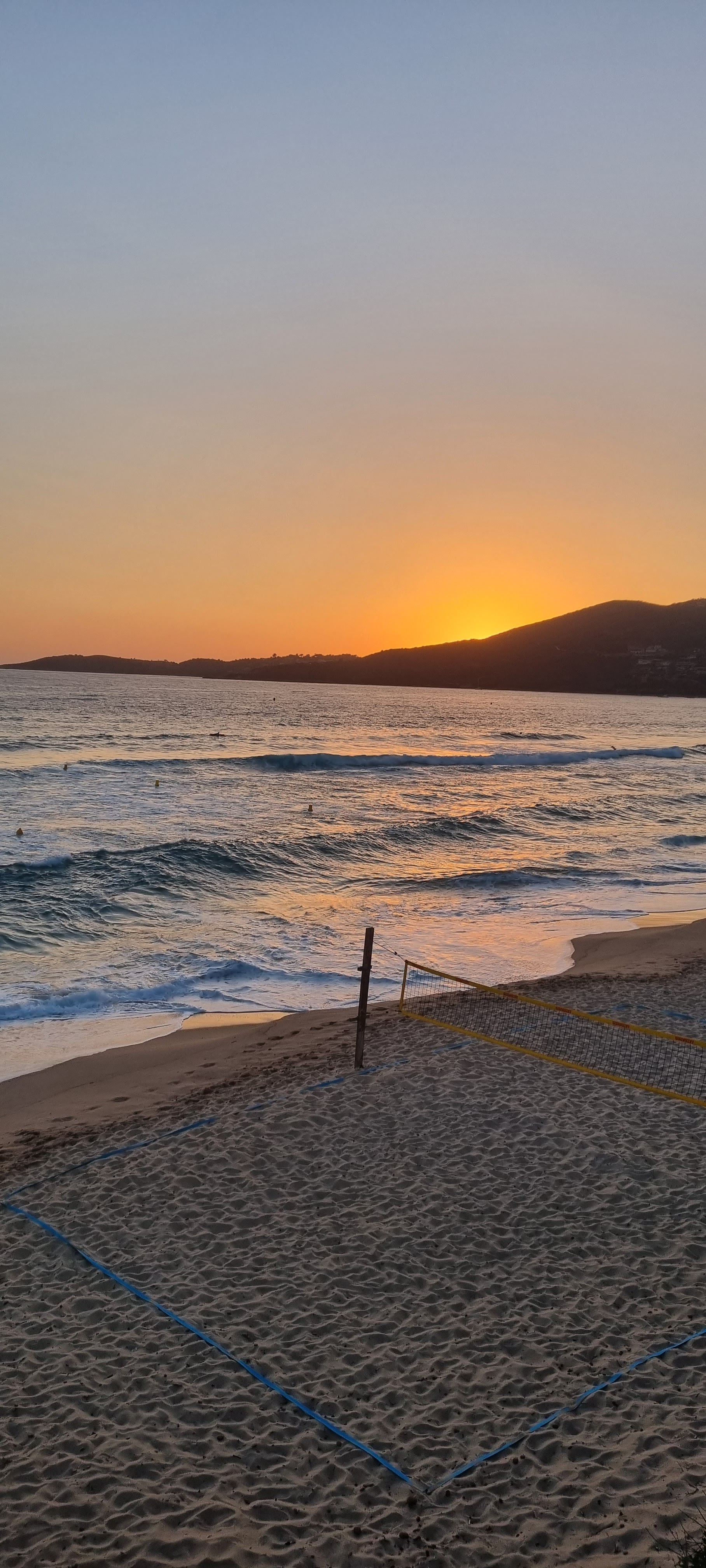 Cadre agréable sur la plage avc en.prime un beau coucher de soleil. Et non la bière n est pas à 9€🤔😁