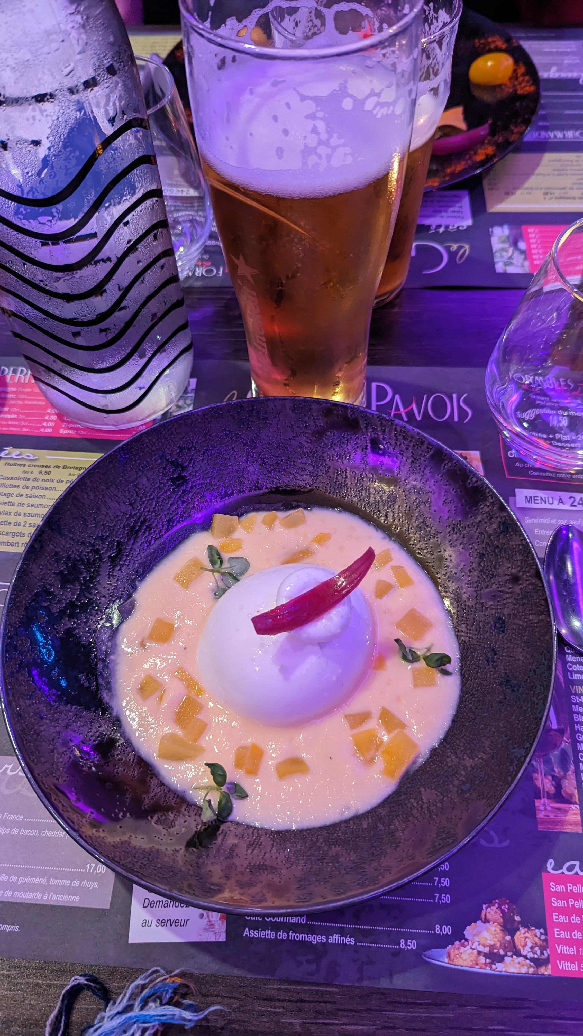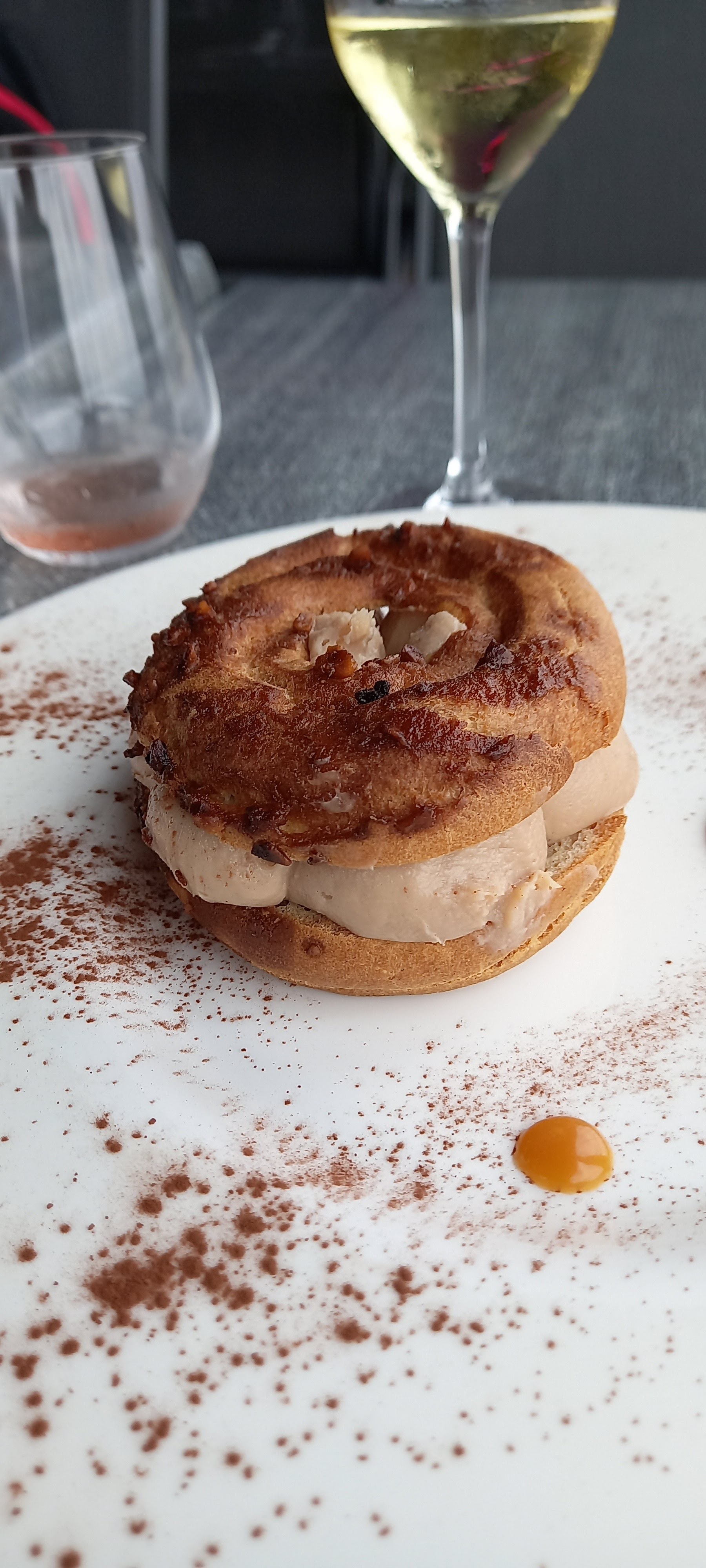 Pas de far noir comme prévu avec le poisson (souci d'approvisionnement... 🤣), même pas eu la délicatesse de prévenir les clients que l'accompagnement avait changé, mauvaise cuisson du poisson. Dame blanche en dessert (attention, boule de glace au chocolat 🤣🤣). Point positif, l'entrée, duo de saumon et la vue.