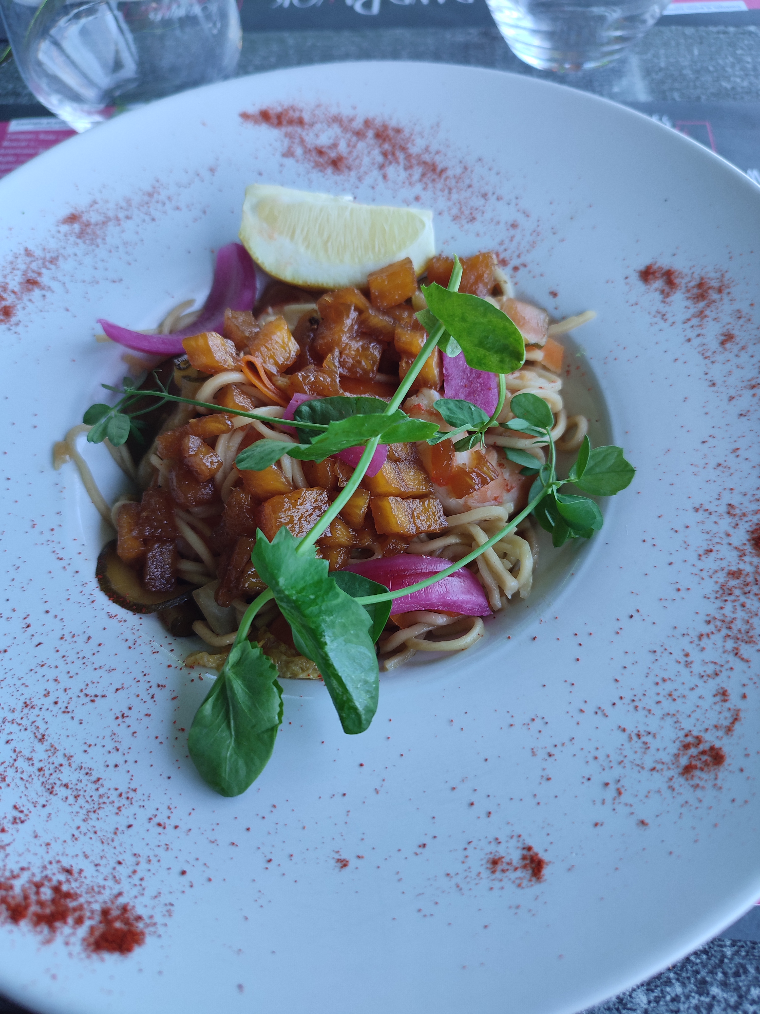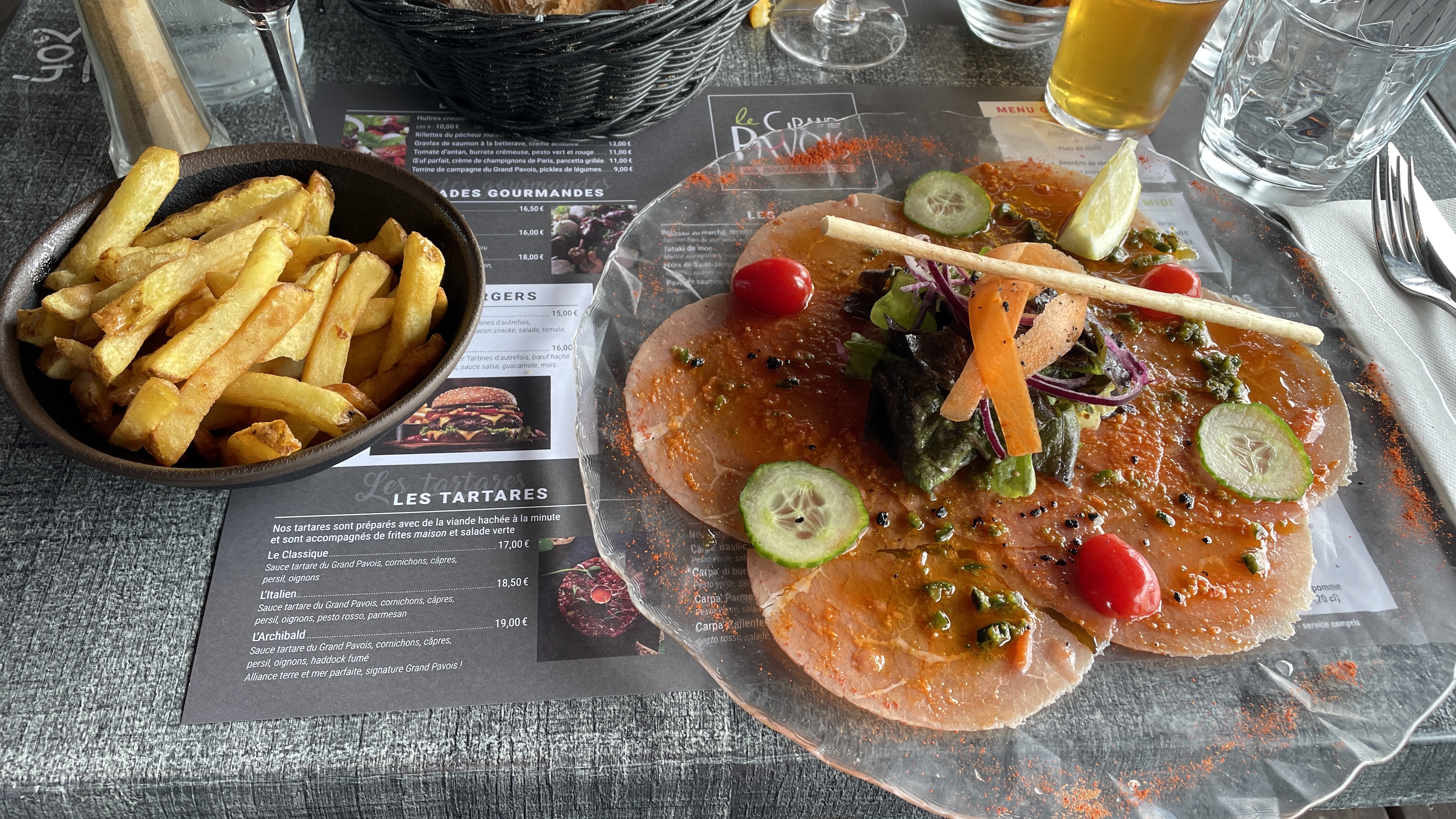 Restaurant très bien situé mais dommage je venais pour l assiette terre et mer qui n existe plus et le plat a été servi trop vite après avoir attendu l apéritif ; sinon le carpe bio était à tomber mais la soupe de fraise peu goûteuse …
