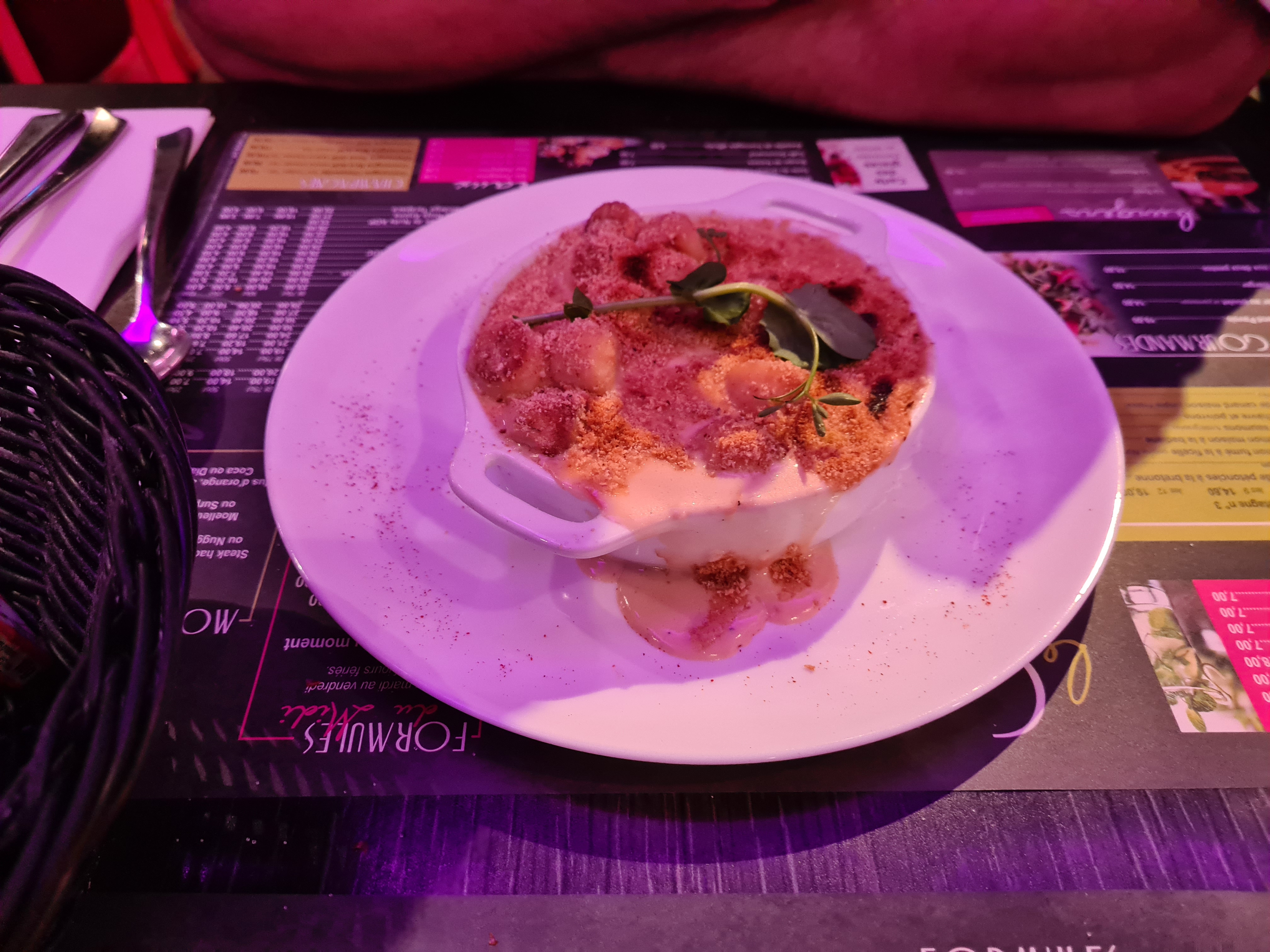 L'accueil n'est pas désagréable mais sans plus. Cafouillage dans les 8 apéros, avec des verres intervertis (blanc sec et liquoreux). N'y allez pas si vous ne mangez ni viande ni poisson. Le seul plat végé n'est pas à la hauteur de son prix, sauce pâteuse sur des pâtes sans qualité , 3 bouts de parmesan, les tomates séchées gâchent le peu de valeurs gustatives. Les profiteroles n'en sont pas, cachées sous de la sauce chocolat trop sucrée et une chantilly bas de gamme, en plus la matière de l'assiette est très désagréable. .l'endroit est bruyant mais ils trouvent le moyen de mettre un fond musical. J'étais invité, je n'y retournerai pas.