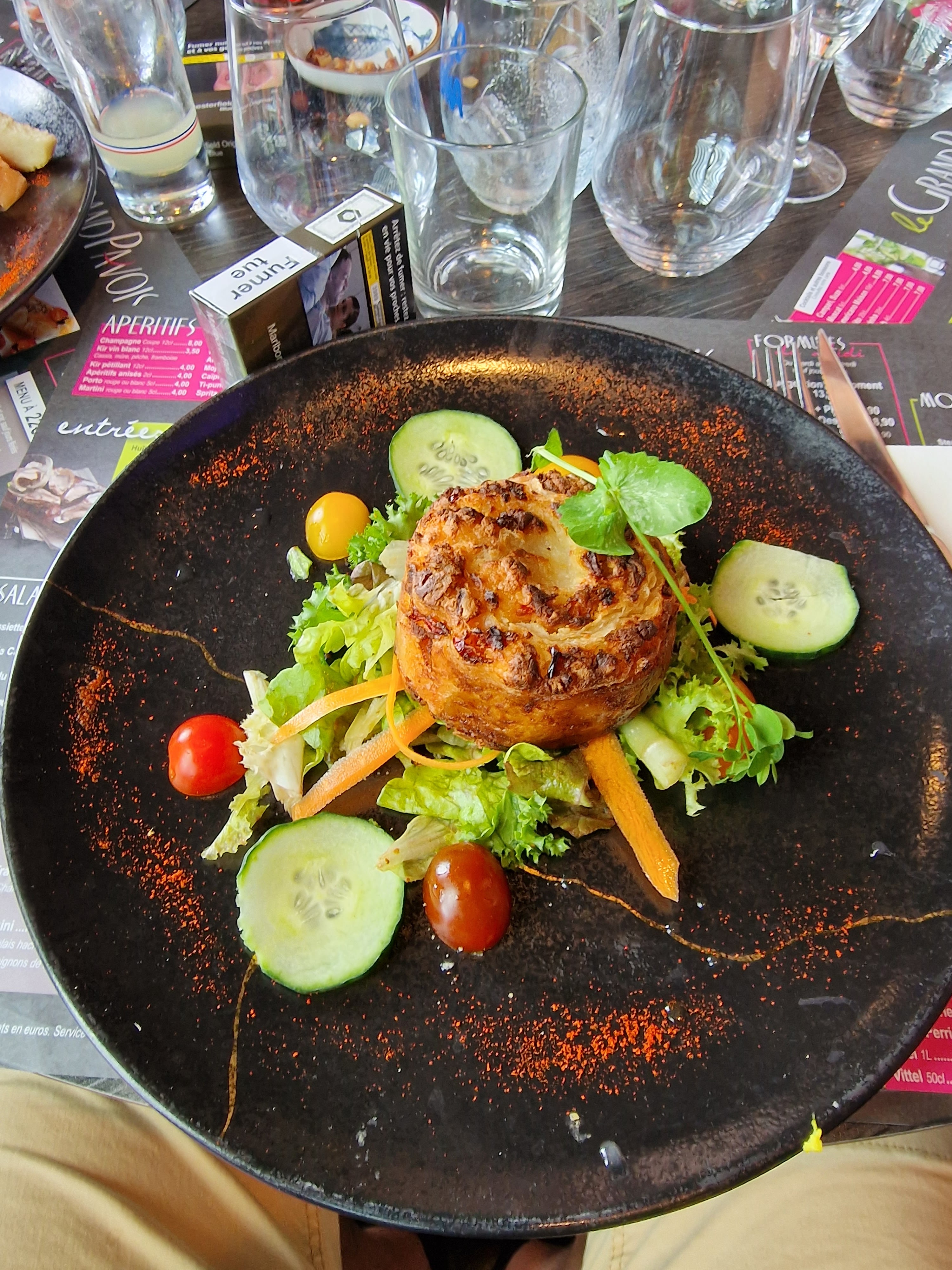Il est vrai que nous sommes arrivés à 22h mais le patron nous a dit que nous pouvions manger. Petit apéritif en amoureux ( sans enfants pour une fois) donc on vient prendre notre commande et nous voulions tout les deux le menus à 28 euros car il nous plais et que l'autre menu ne se sert pas après 20h sans réservation.... et bien sûr du vin pour accompagner ça. Sauf que la la serveuse nous dit non pas les menus car ils vont fermer la cuisine donc vous pouvez prendre ce qu Il y a sur la carte..... alors la on m'explique on ne peut pas me faire le menu par contre on peut me servire les même plats mais a la carte????? Au final nous avons pris juste un plat simple et un dessert pour le coup service ultra rapide 🤨 et en plus de sa nous étions sur la terrasse et le temp de notre repas ils fermés les volets de la terrasse et tout..... 🤬🤬🤬🤬🤬