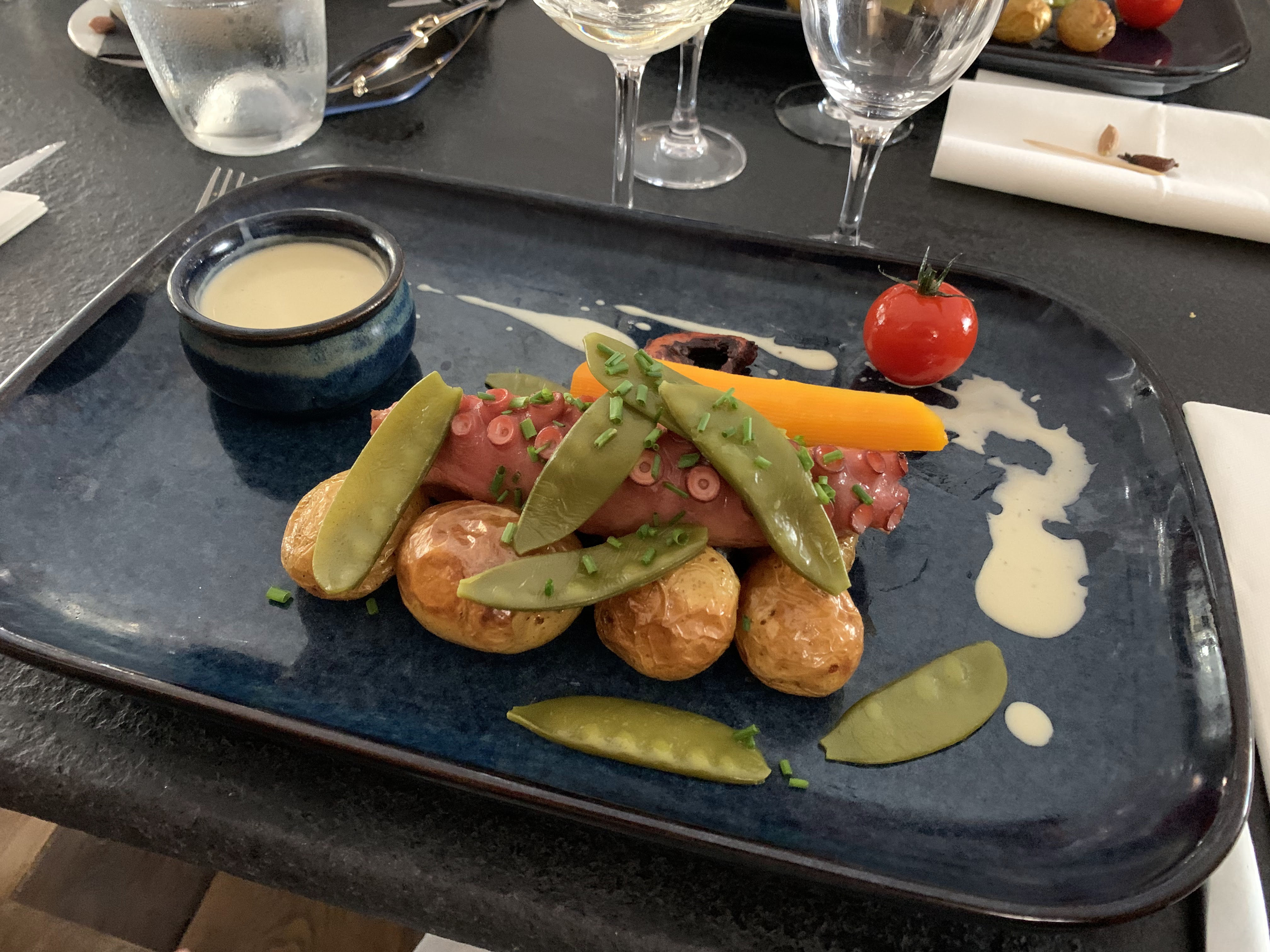 Un superbe cadre dans une petite ruelle de Port Grimaud. Le service a été très professionnel, agréable et pleins de petites attentions pour les enfants. Les plats pour enfants sont fait maison (poulet pané & frites), ce qui est très souvent un gage de qualité. Les plats qui ont suivi ont confirmé. Cuisson du poulpe exécutée à la perfection, le risotto au truffe et gambas était également très bon. Une cuisine plutôt traditionnelle, de qualité avec des ingrédients frais. Une tres bonne adresse.