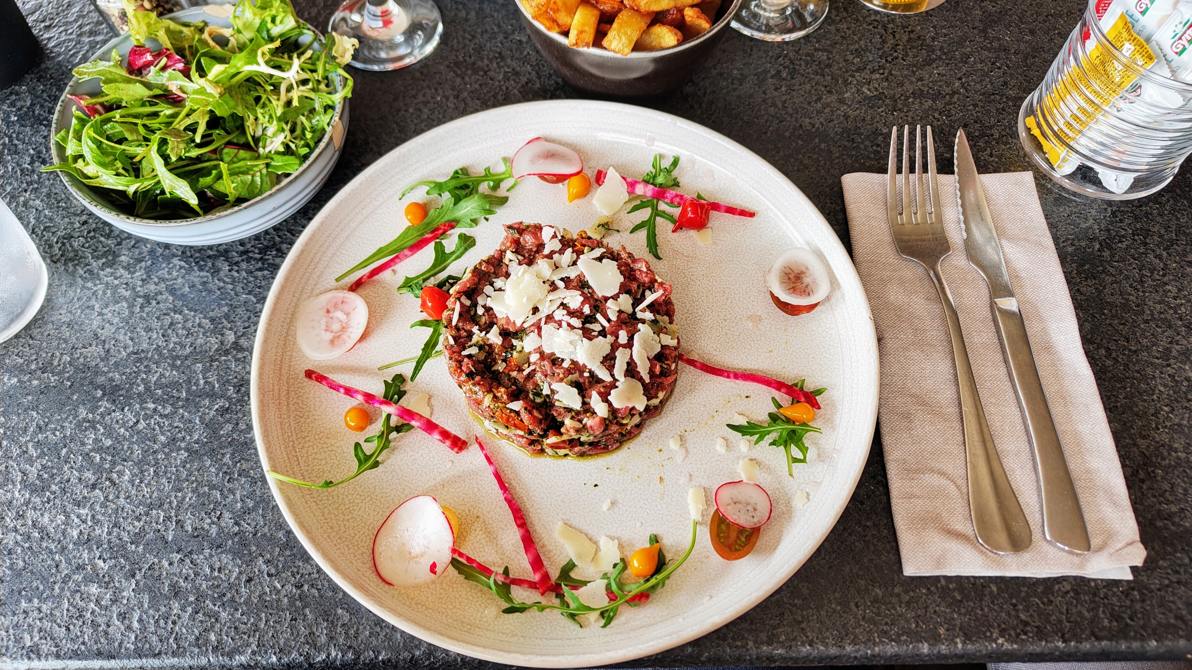 L endroit est sympathique mais le repas pas a la hauteur ( frite pas cuite, tartare fade et salade sans vinaigrette)