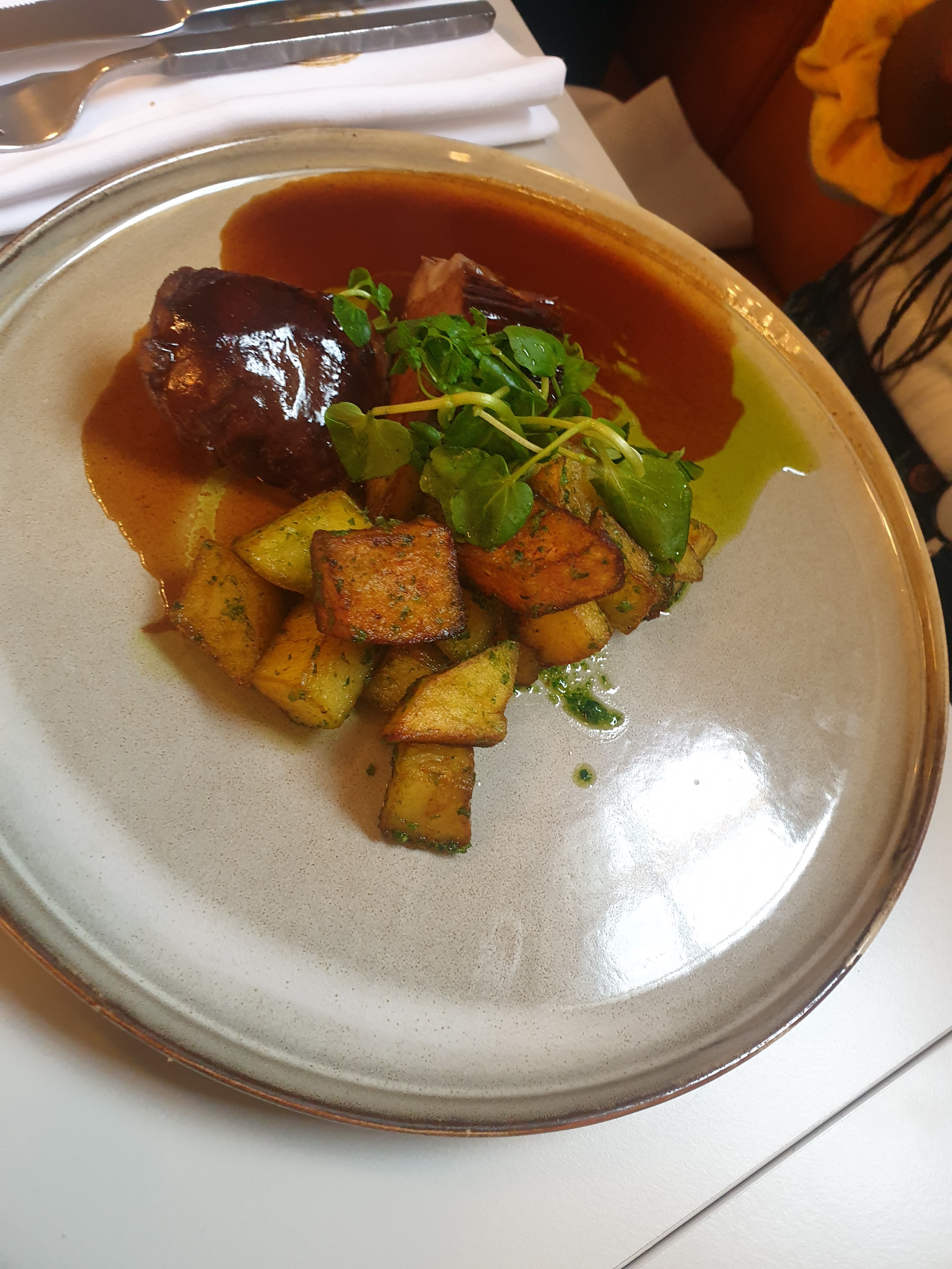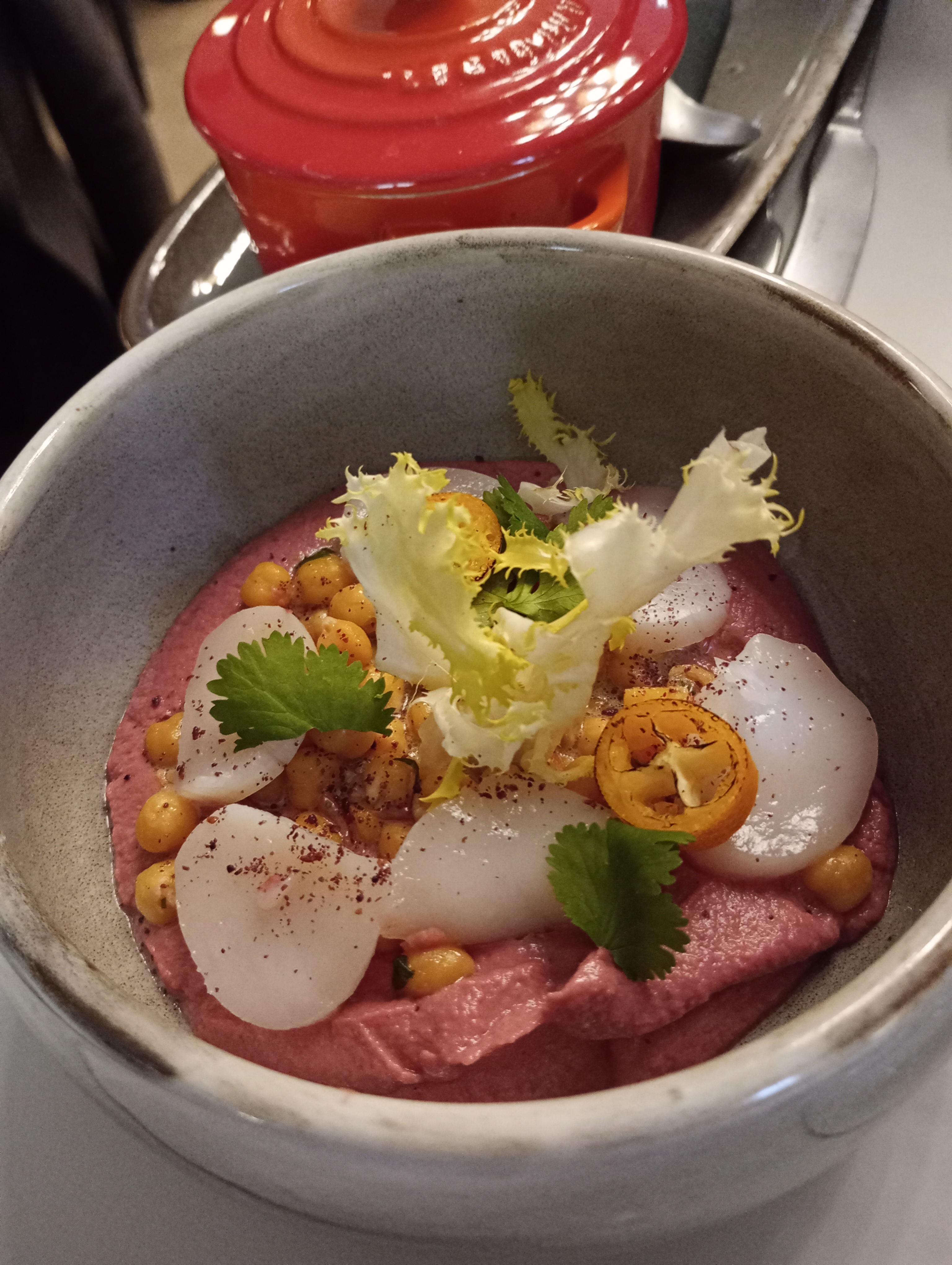 Les lieux sont très beaux et l'ambiance est très agréable. En revanche pour les plats, j'ai malheureusement été déçue, comparé à d'autres bistronomiques de Lyon. L'échine était sèche pour une viande confite et la pavlova manquait d'équilibre dans le gras et le sucre, l'agrume était très peu présent. C'était bon, mais sans plus et, dans un tel lieu et avec le chef derrière le menu, on s'attend à plus d'équilibre et de goût.