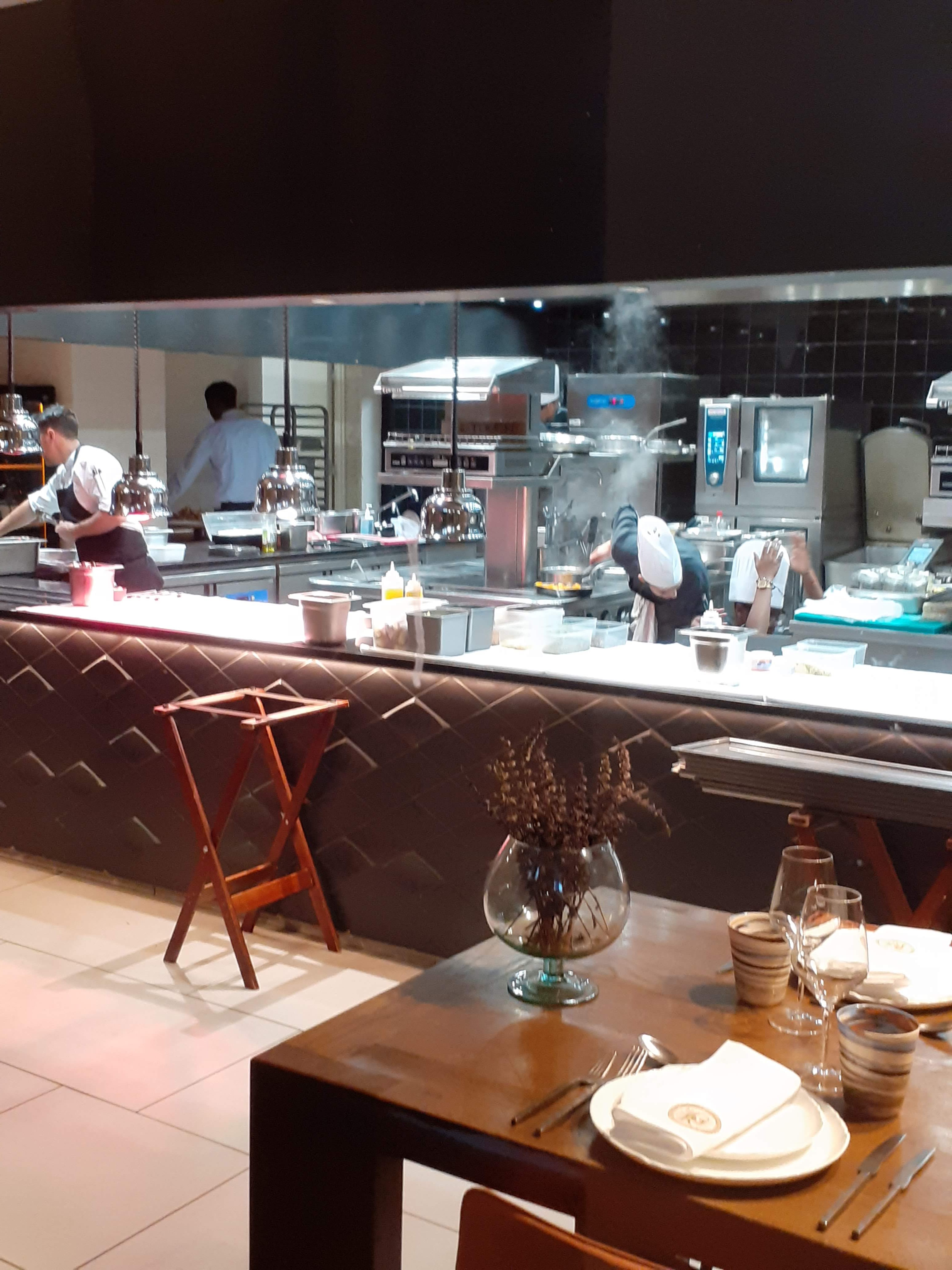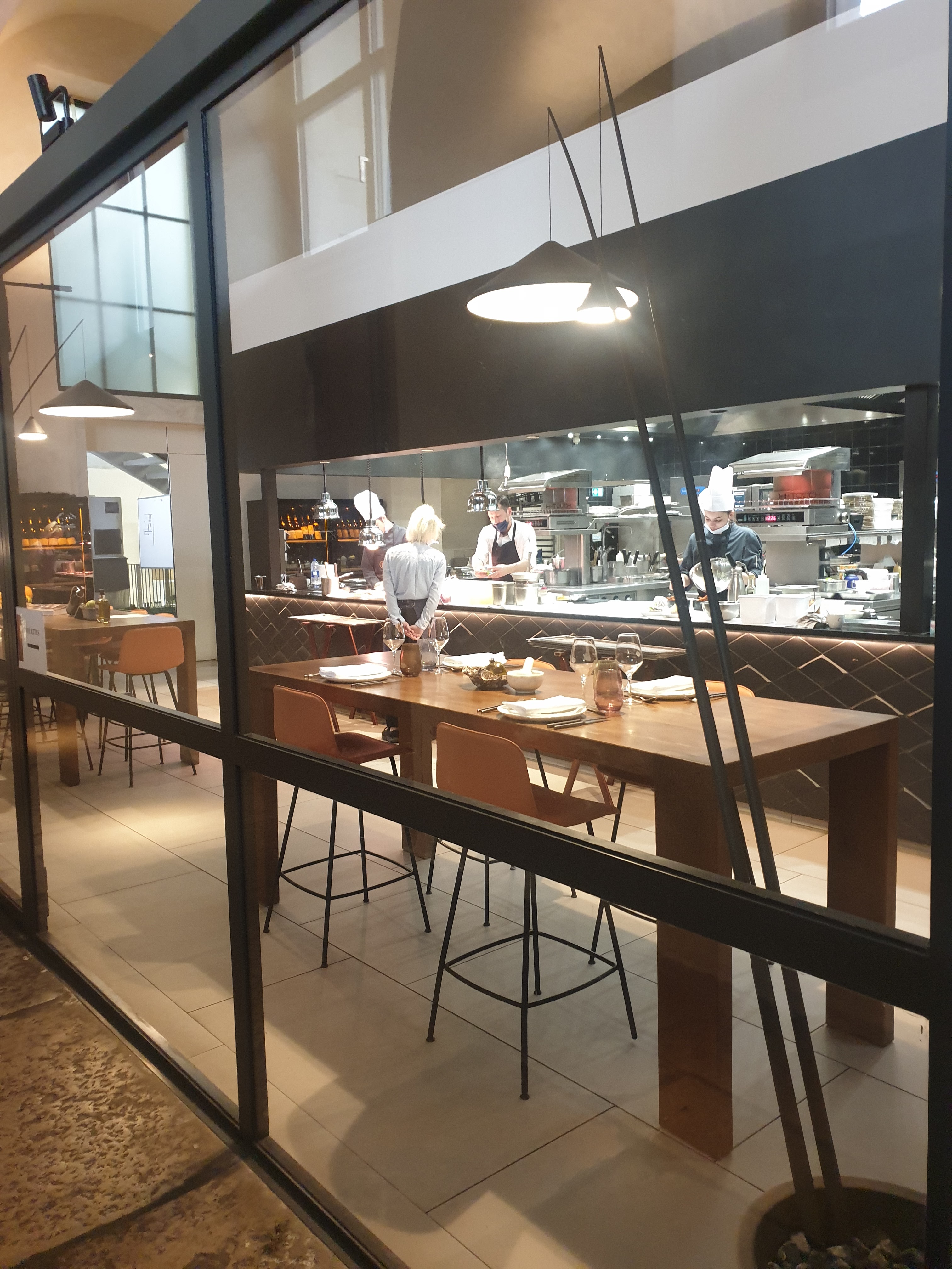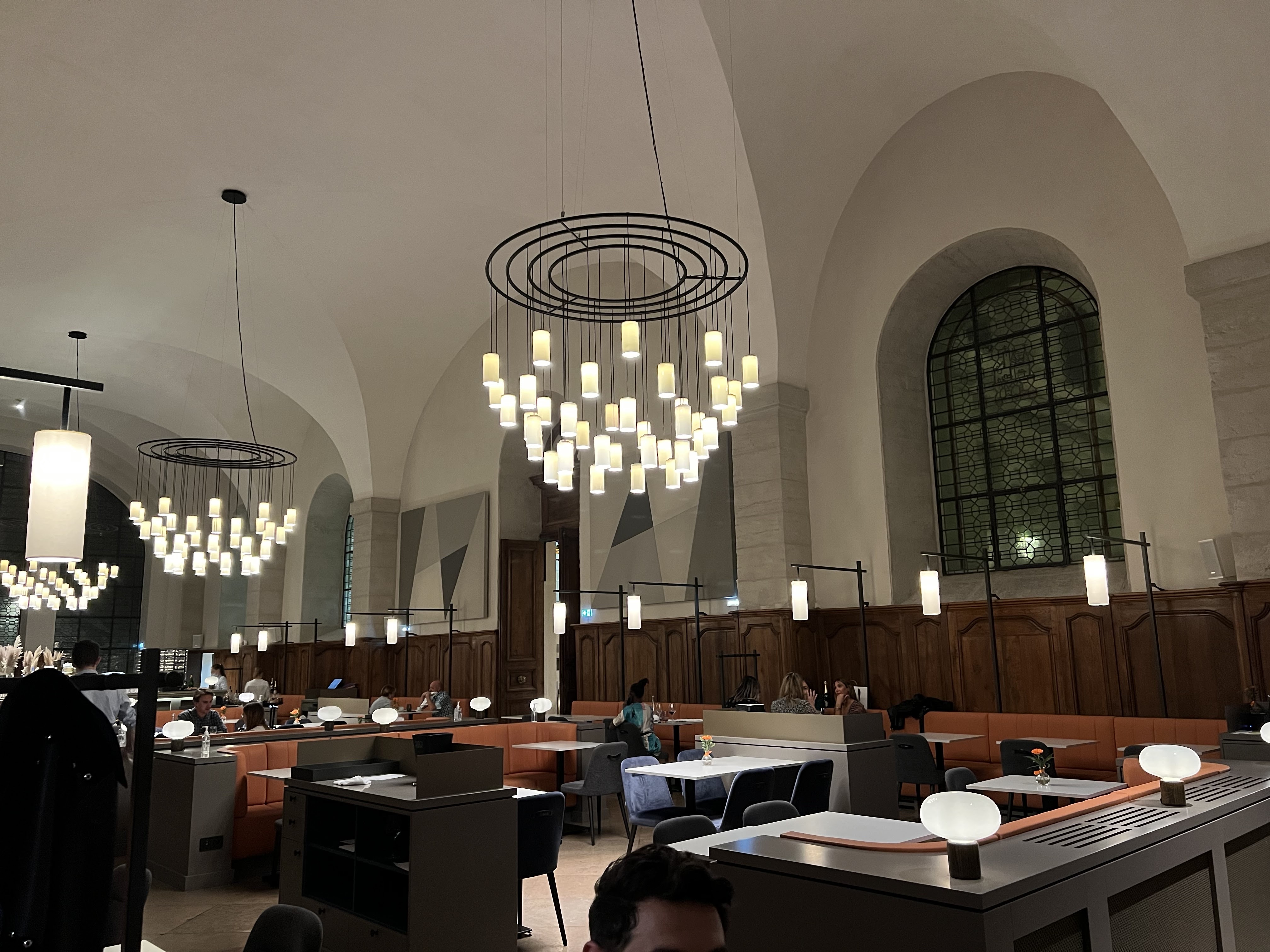 Une grande salle sobre et moderne mais décoré de panneaux acoustiques qui permettent de conserver une ambiance calme avec de jolies banquettes sur le côté où au centre. Un service de qualité avec une équipe motivée qui a le sourire. Dans l’assiette c’est très bon mais les quantités sont chiches… il ne faut pas avoir trop faim si on prend la salade lentilles en entrée et les 3 pauvres noix de saint Jacques en plat. C’est bien cuisiné mais peu copieux. La pavlova était bonne mais encore très simple. Je ne sais pas si je reviendrais malgré la beauté du lieu et le cadre chic. On peut finir la soirée dans le bar chic et branché qui se trouve au dessus. J’ai néanmoins beaucoup apprécié le service et l’accueil dans ce restaurant.