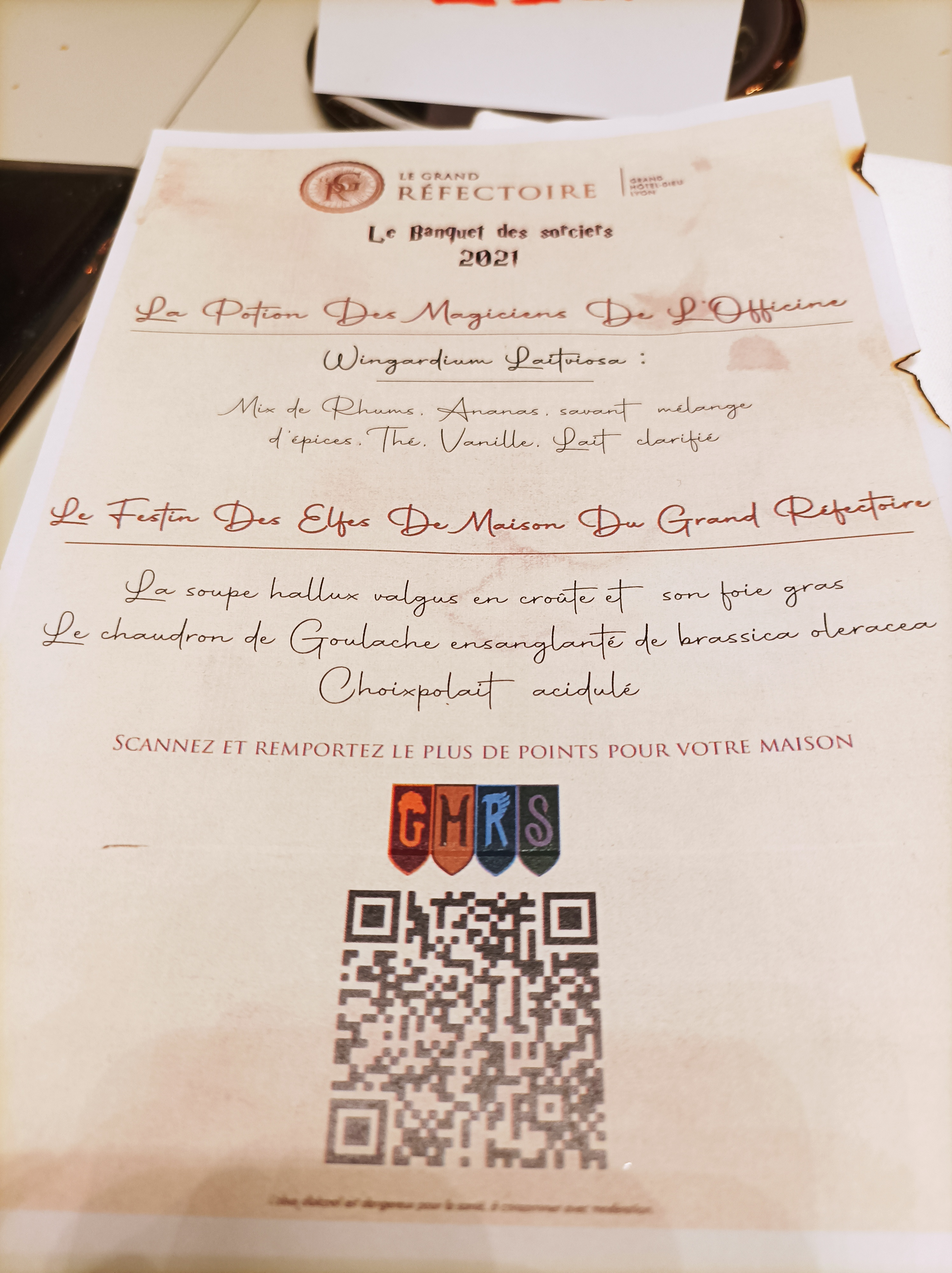 A chaque fois que nous allons manger au grand réfectoire, on en reparle avec les ventre plein et des paillettes dans les yeux! La soirée de vendredi 29/10/2021 sur le thème de Harry Potter n'a certainement pas créé d'exception ! Le menu était concis mais relativement clair, le repas en lui même était très bon et le spectacle était très bien réalisé et beau à voir! L'ambiance était au beau fixe dans la salle et les serveuses/serveurs étaient très agréables, comme d'habitude ! En bref, une très bonne expérience aussi bien culinaire que visuelle qui donne envie de revenir!