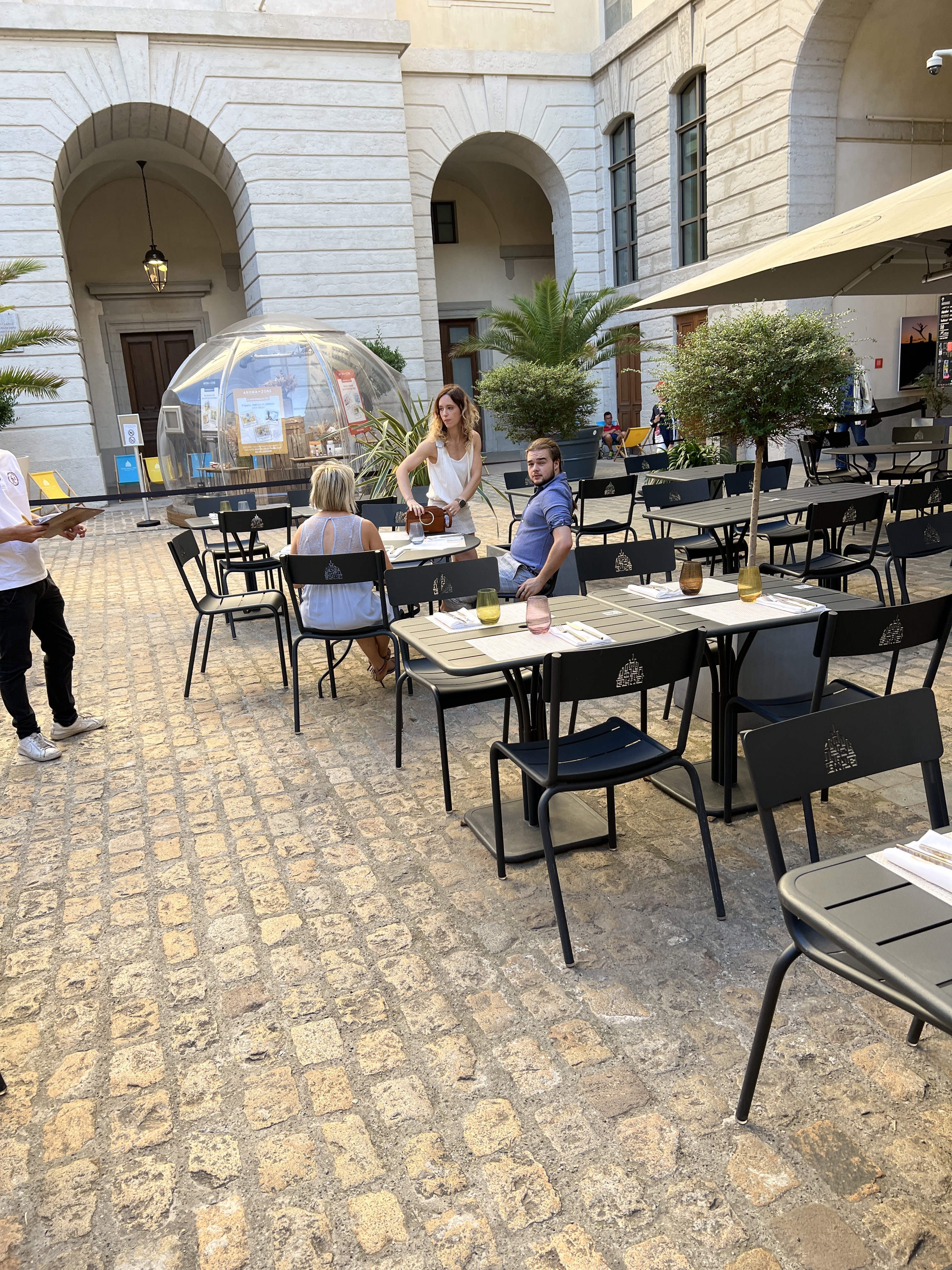 Très beau cadre, mais très déçu par l’entrée servie en plat autour de la buratta!! Aucune saveur du butternut servi froid. Cela a été constaté par mon épouse et moi même et rapporté à la serveuse. Pas de visite du chef, ni de geste commercial quand l’assiette a été renvoyée pleine. Bref, on peut rater un plat, mais venir en discuter ou réfléchir spontanément à un geste commercial!!! Du coup, le rapport qualité prix (environ 50 euros par personne pour 2 plats et 2 coupes de champagne et un verre de vin) est parfaitement exagéré. On ne renouvellera pas l’expérience.