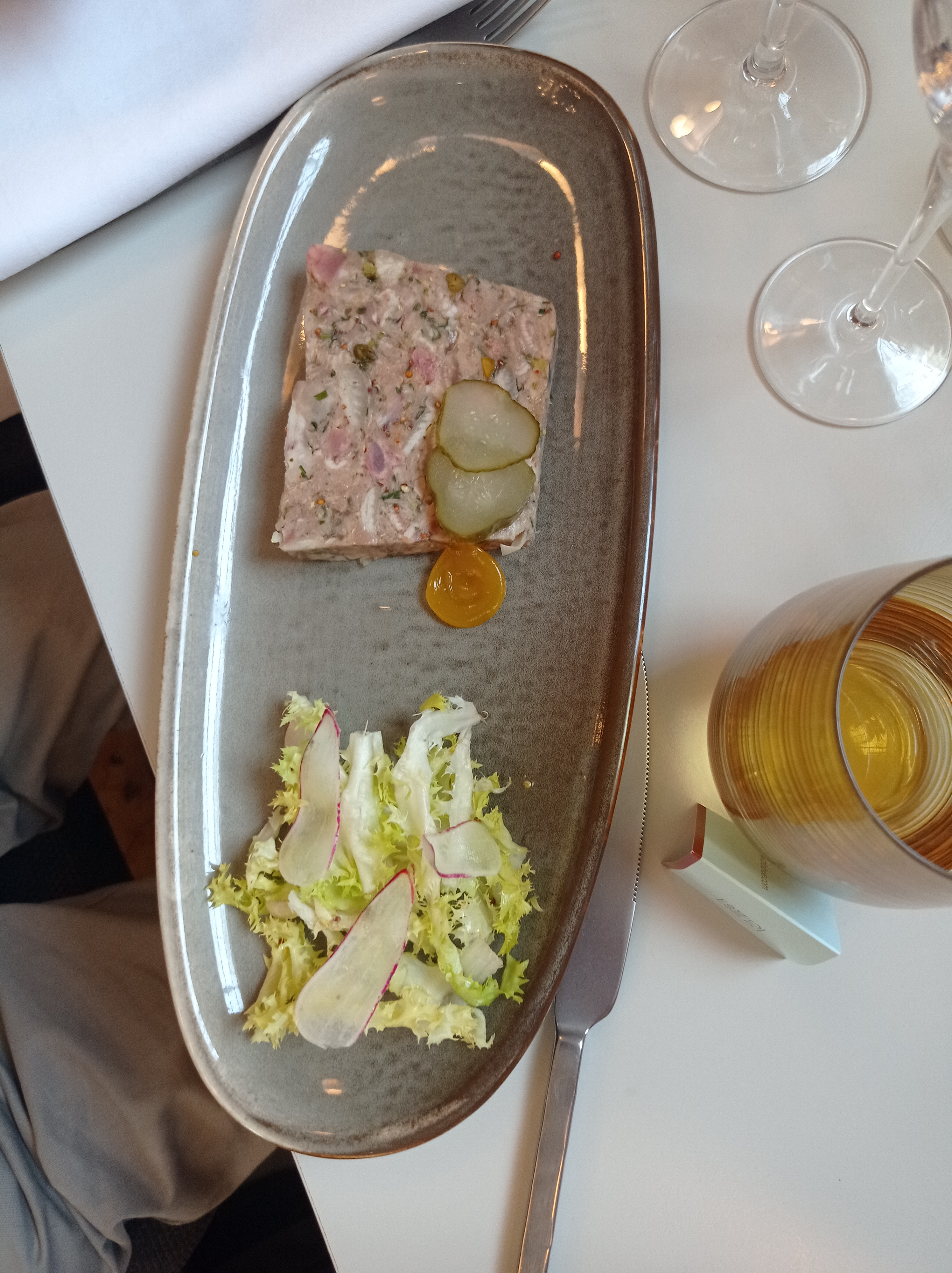 L endroit est vraiment exceptionnel et le service correct. Par contre, la terrine de cochon était totalement fade et le poulet au vinaigre était dur et sec. Le tataki de thon était correct mais manquait de saveurs. Quant aux desserts, ils étaient corrects sans plus. C est vraiment dommage car l on s attendait vraiment à une farandole de saveurs et nous avons malheureusement été tres déçu. La note, elle, est très salée et ne se justifie pas.