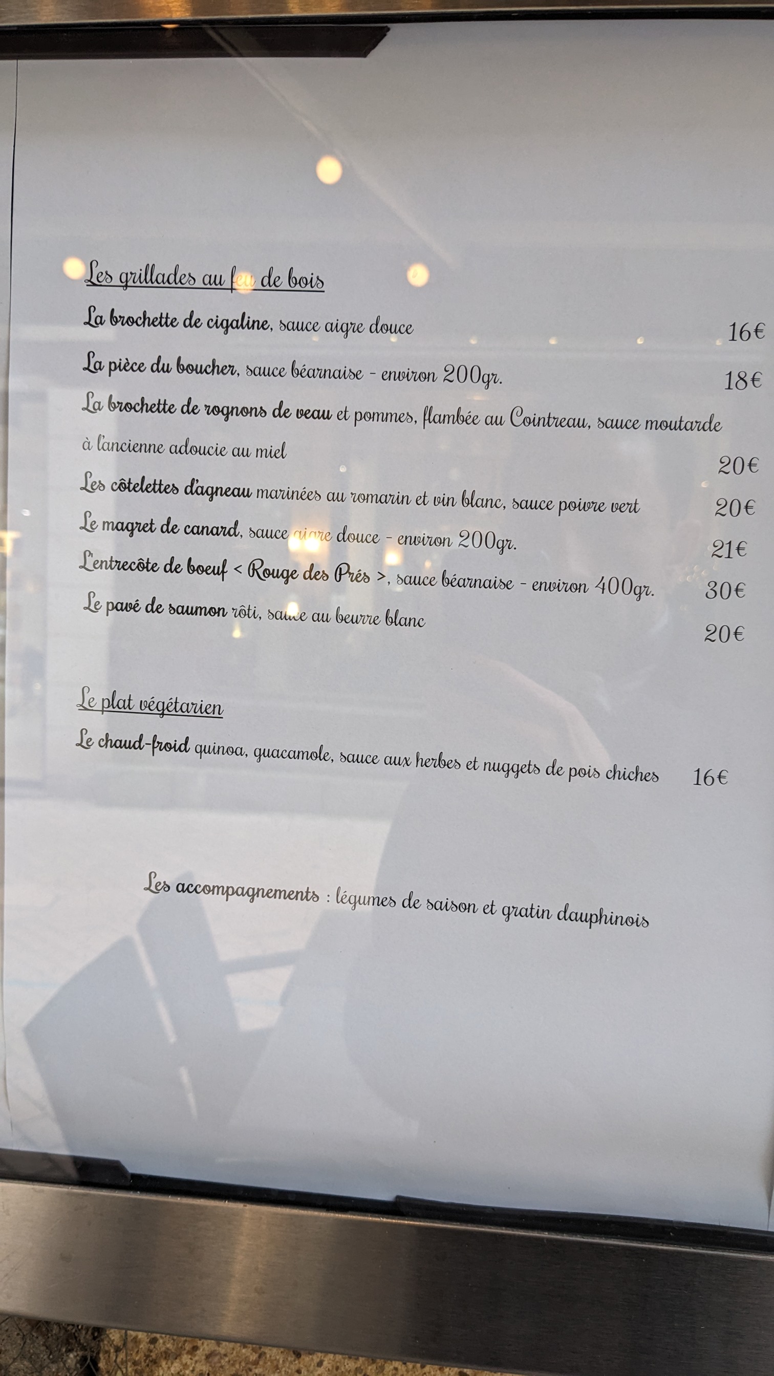 Très agréablement surpris. Restaurant chaleureux. Très bonne Entrecôte 400g cuite au feu de bois dans une cheminée à côté des tables. Légumes à volonté. Bon choix en vin. Je recommande.