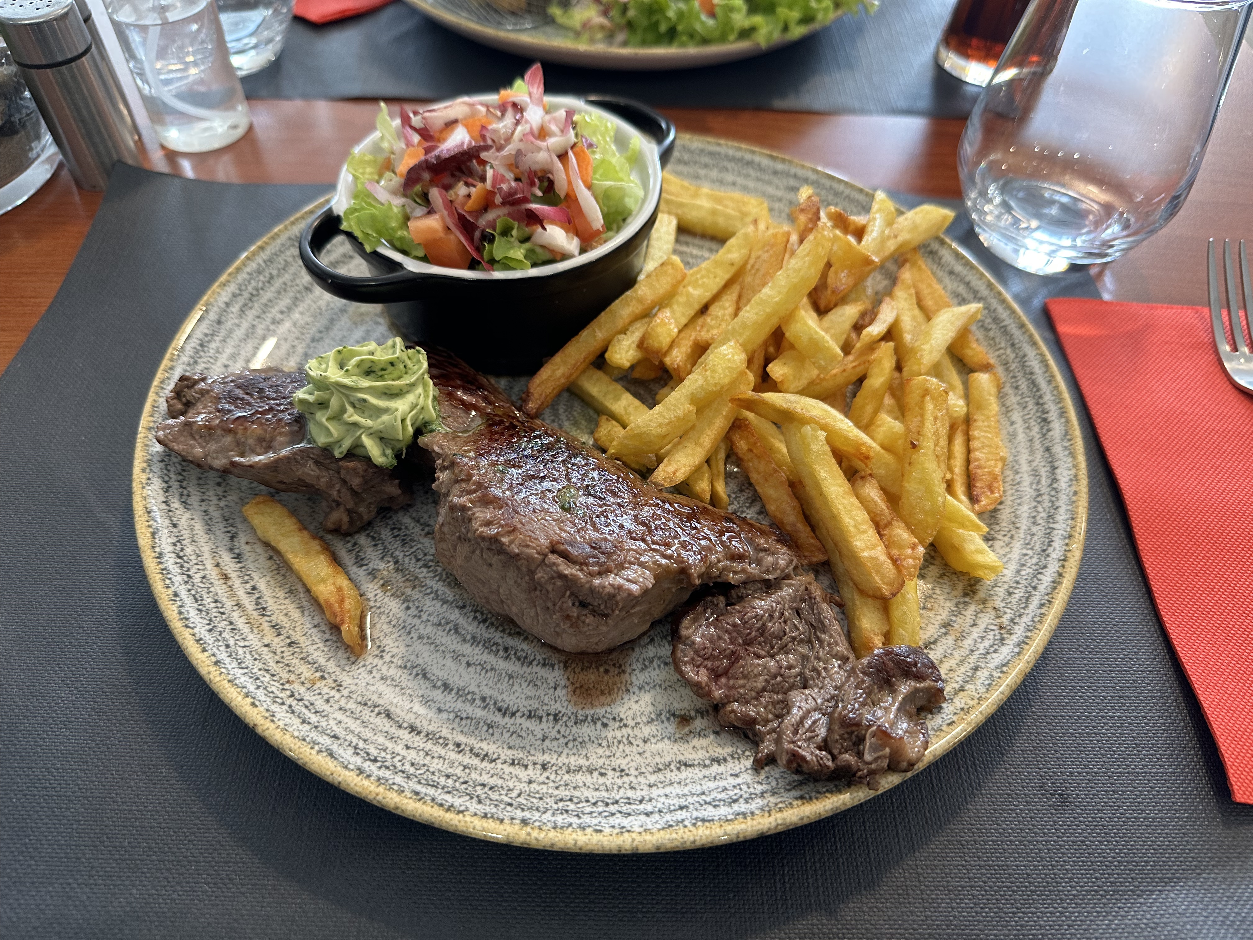Juste parfait: succulente touche perso dans la sauce d accompagnement de la salade , plats très bons et belle présentation, je recommande même le café gourmand, très gourmand. Service qui se démène pour satisfaire la clientèle, très aimable, rapide et aux petits soins... Les hôtes de ce ce lieu méritent vraiment qu on s y attarde...