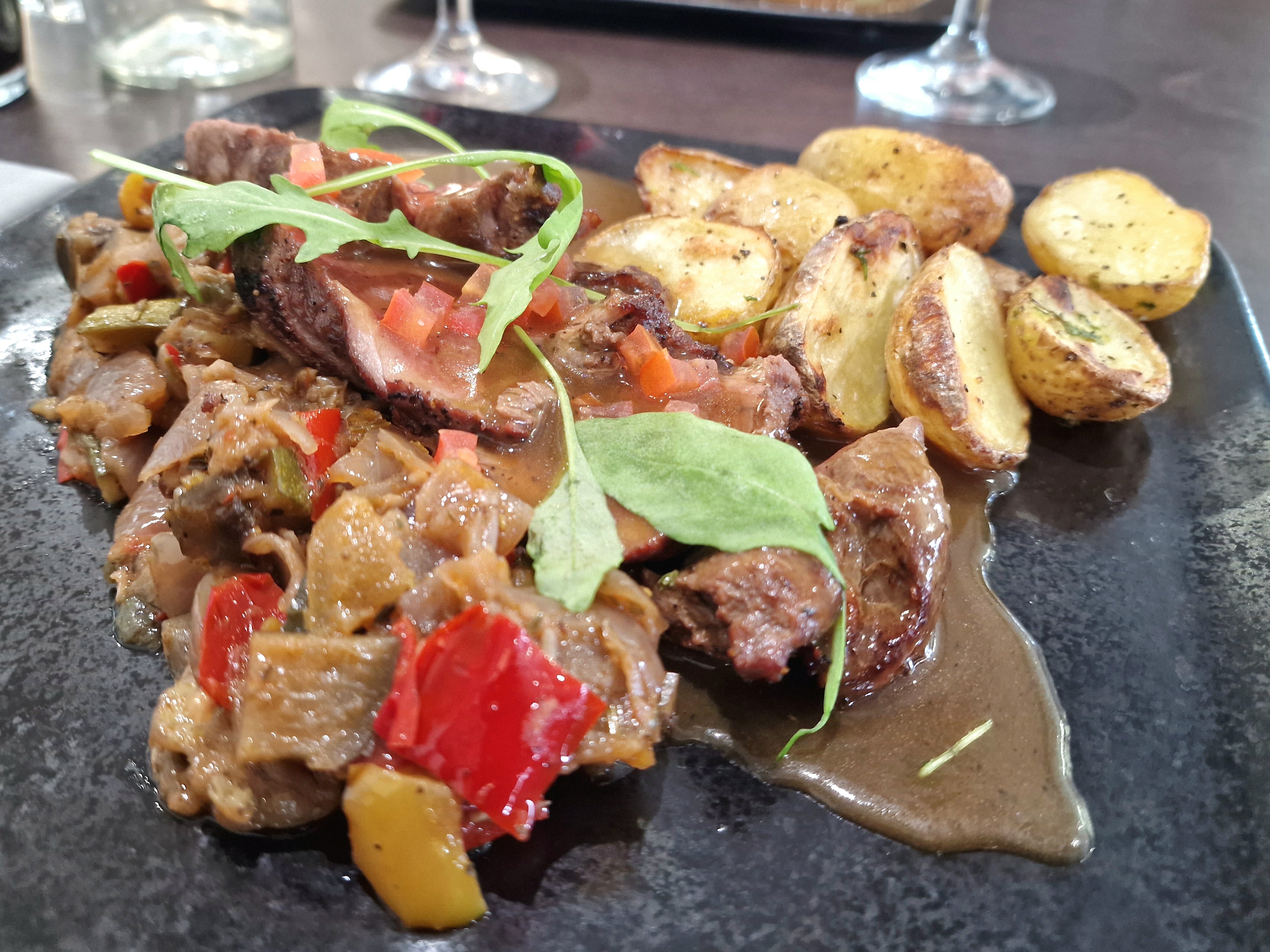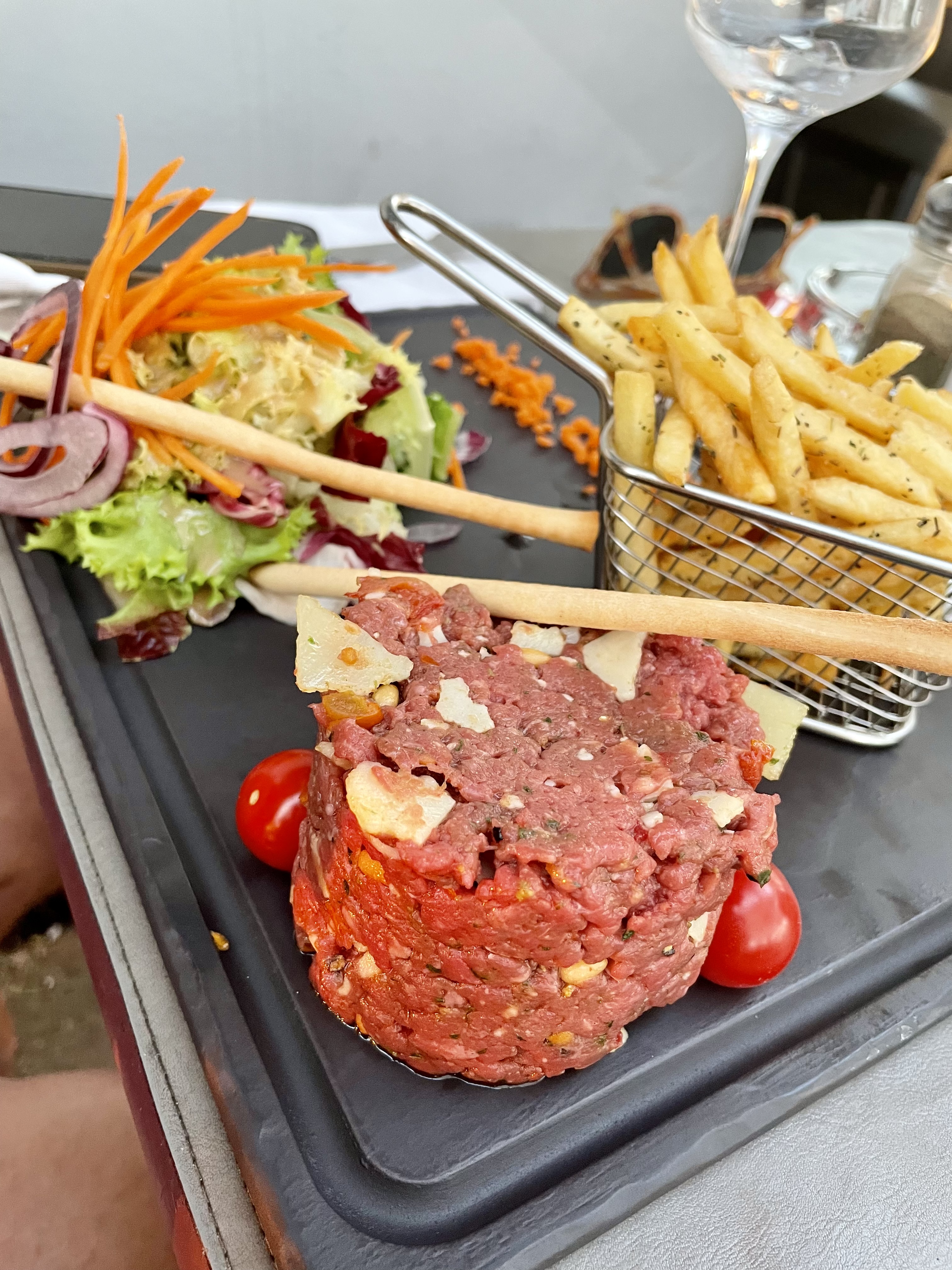 Avant tous le restaurant reste relativement cher ca ressemble de loin a un attrape touriste mais l'on y mange très bien. Cuisine copieuse et diverses. Les entrées sont variées on peux y manger léger comme se casser le ventre. Le plateau de fromages est magique et les desserts aussi. Ne pas écouter les mauvais ragots et prenez votre temps 😊