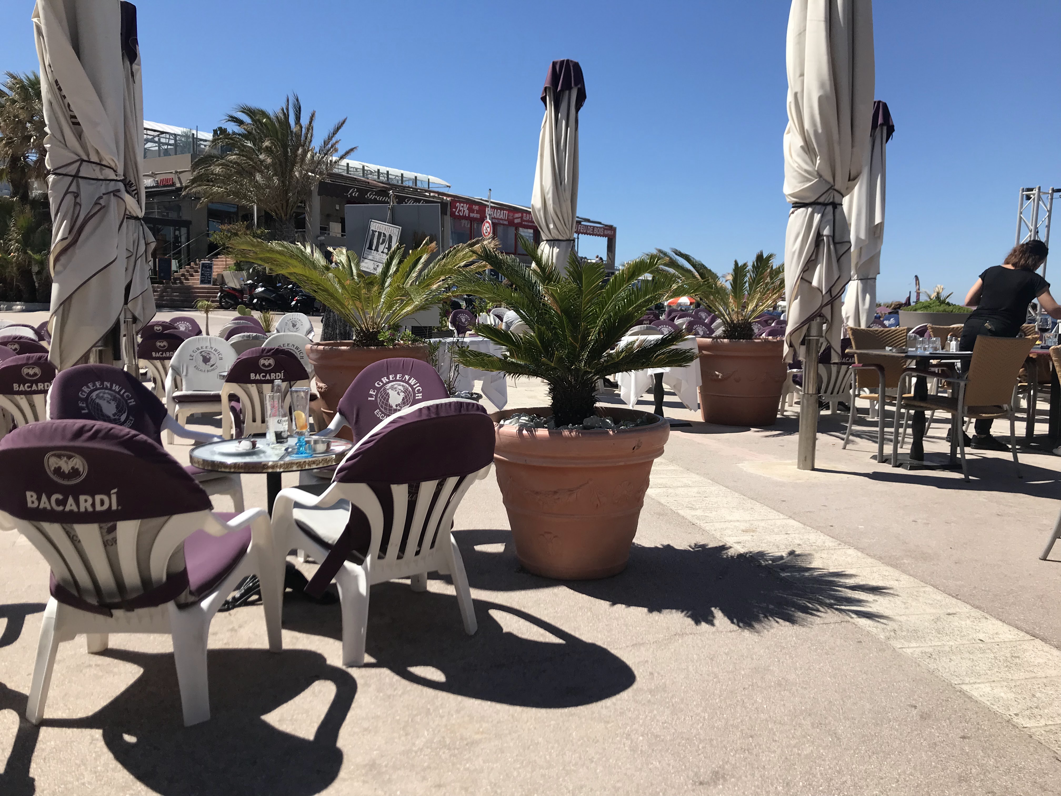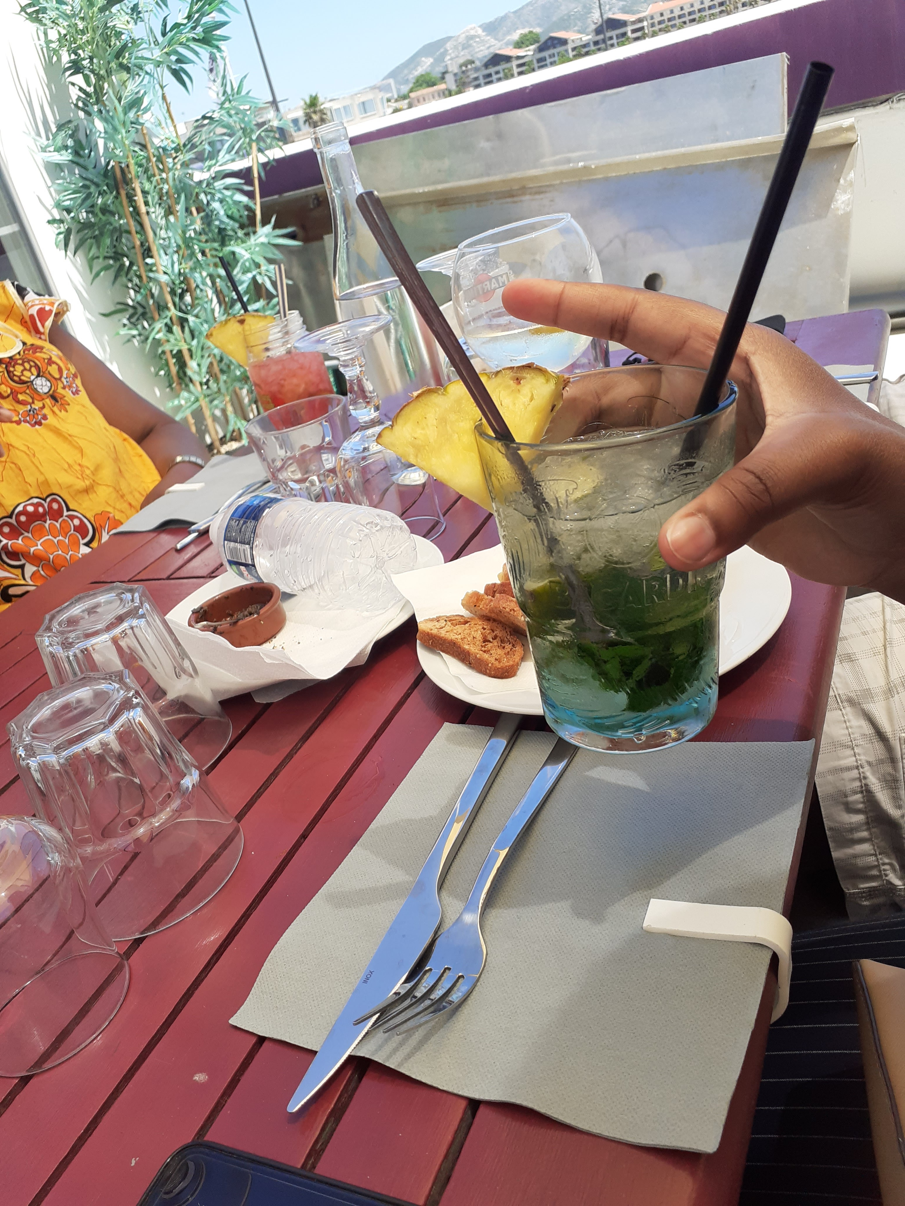 soleil terrasse spacieuse nous décidons de nous y installer pour déjeuner bon acceuil nous commandons mojitos plat du jour tranches de gigot bien servie et hamburger a peine goûté les cocktails face au soleil que les 2 plats arrivent nous le disons au ptit serveur qui rit et repart donc nous avons mangé chaud et bu notre mojito en dessert c est nouvelle expérience