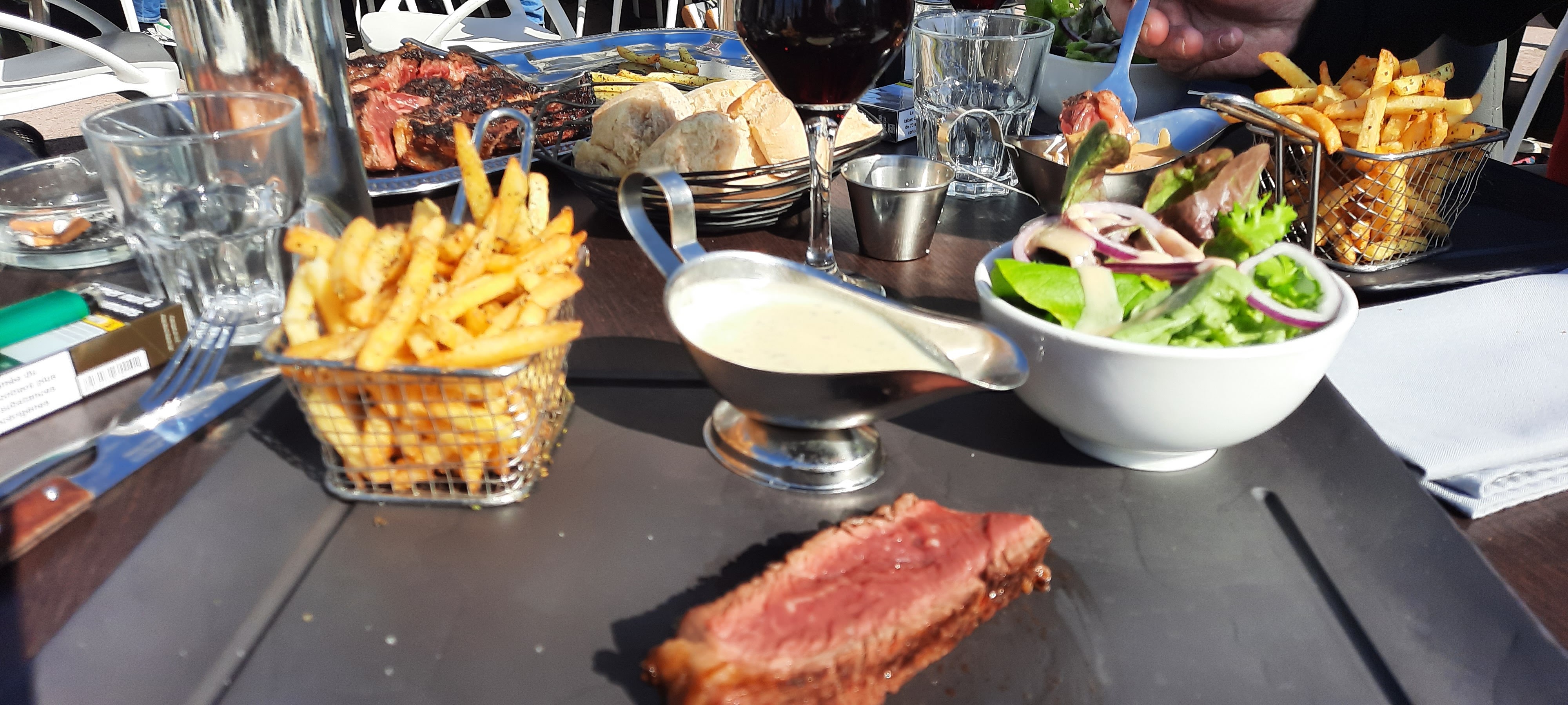 Bonne ambiance, repas copieux et bons, personnel aimable. Terrasse avec brumisateur, un vrai plus. Seul bête noir… la propreté des toilettes.. tout le papier au sol donc inutilisable, cuvette sale etc, c’est dommage car ça ne reflète pas le reste du restaurant.