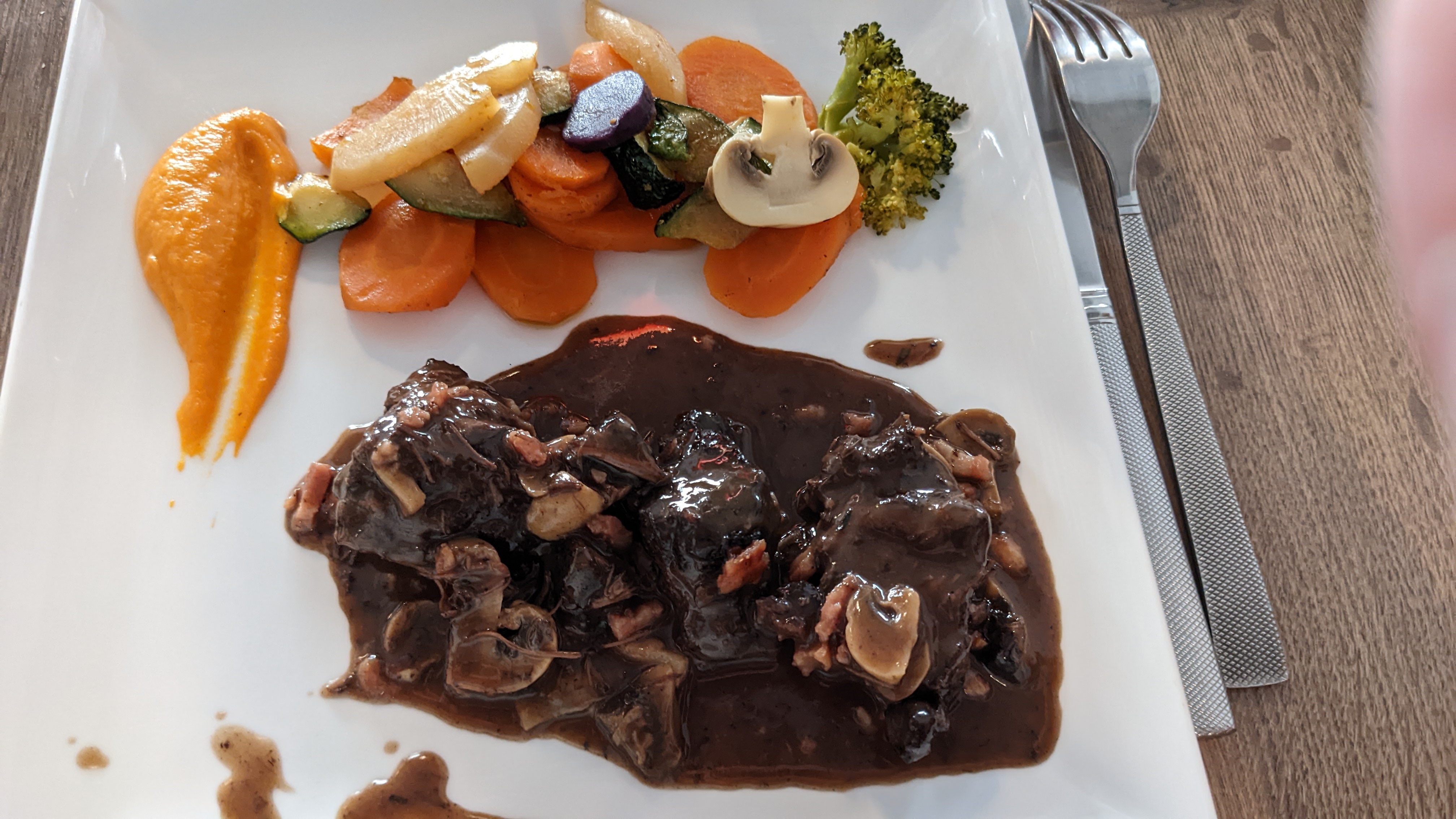 La nourriture est correcte, j'ai particulièrement aimé les œufs à la sauce époisse. le bœuf bourguignon et la joue de porc où rien de spécial j'ai d'ailleurs préféré celui que je fais moi-même. Le service est super sympa, la dame est très sympathique. L'ambiance est sympa, beaucoup d'espace entre les tables.