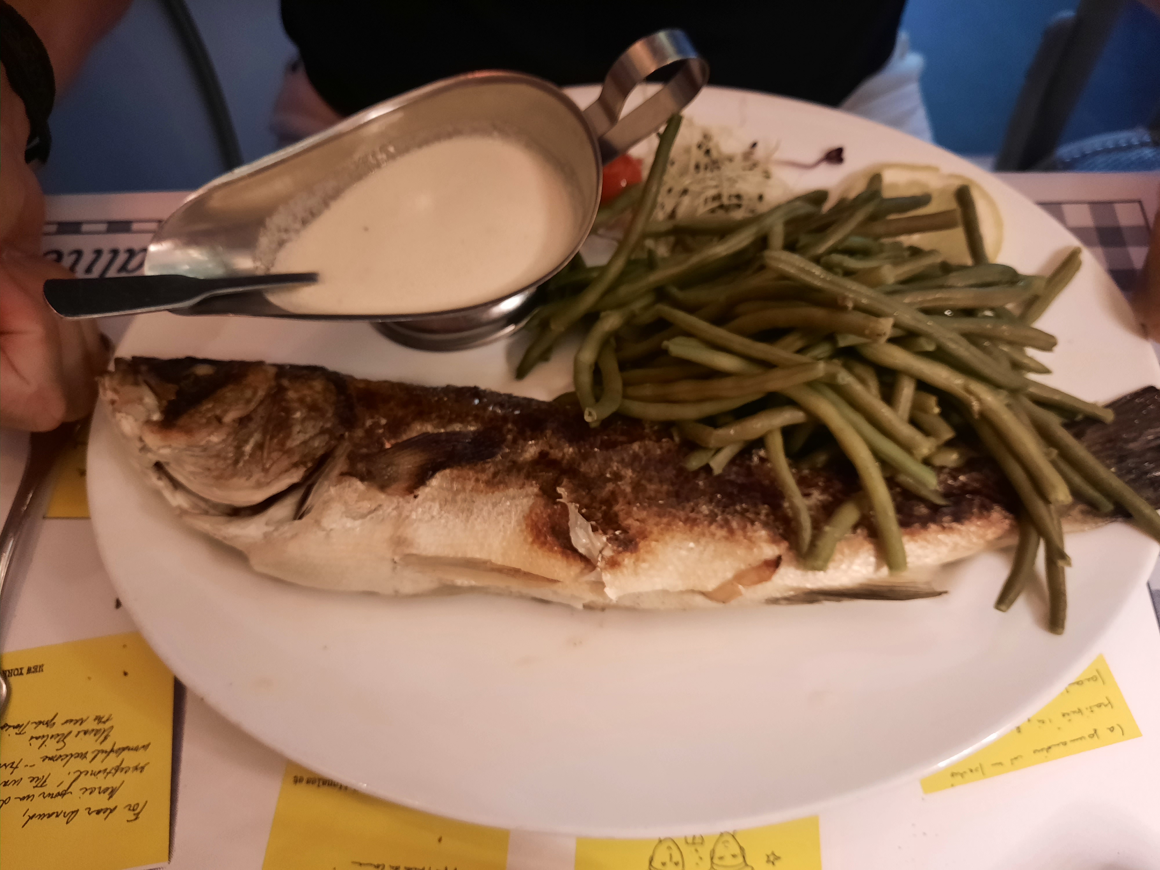 Dîner à deux. Cadre sympa mais tout simplement pas bon. Une aile de raie avec une sauce liquide ++++ (trop d’eau). Tagliatelles au saumon : Les pâtes n’ont pas de goût et beaucoup trop de sauce pleine d’herbe.