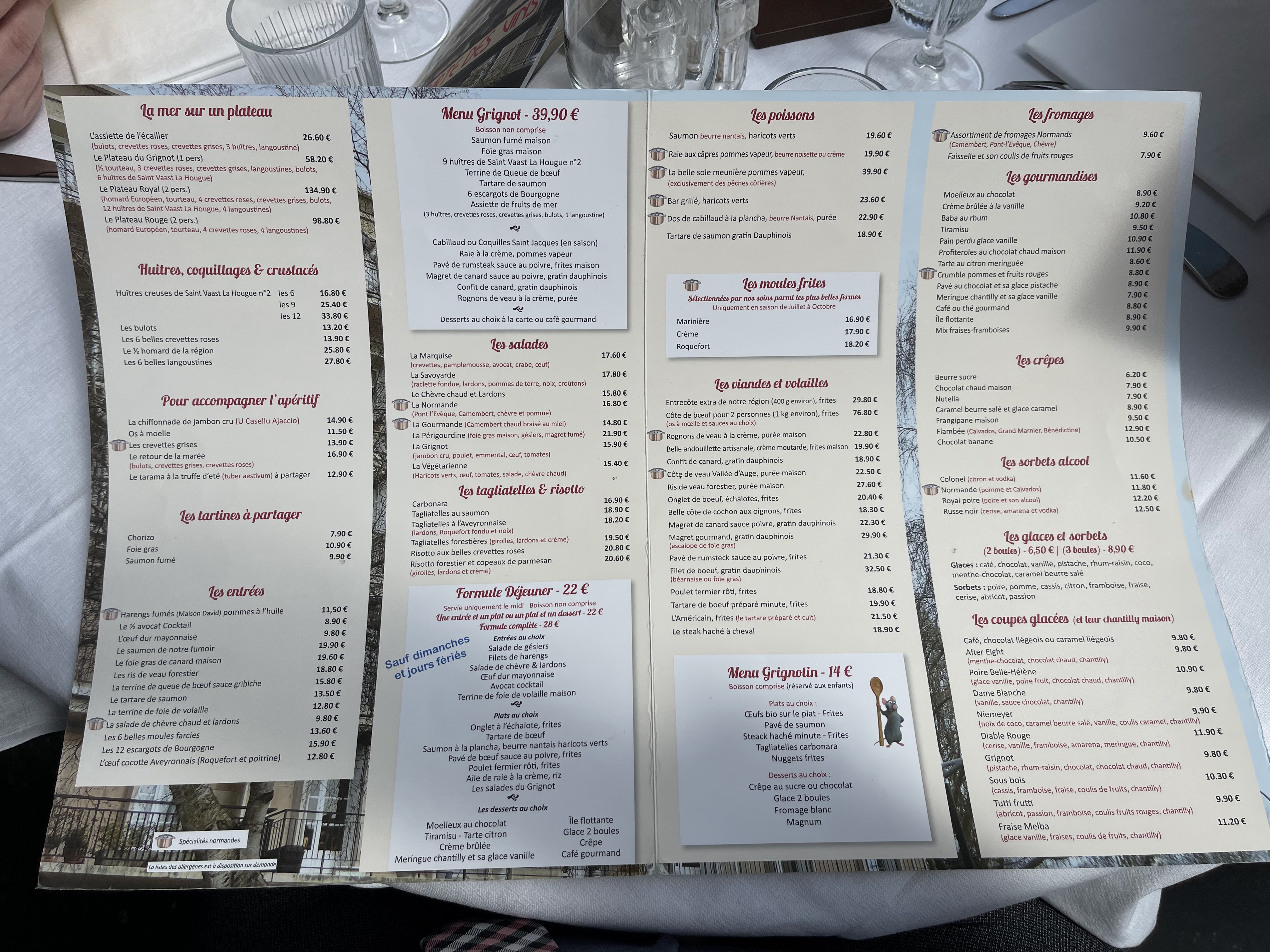 Mardi soir , pas beaucoup de restaurant ouvert, on est tombé sur Grignot, le midi on a mangé à deauville , c'est cher là-bas, mais chez le Grignot , les mêmes plats mais plus frais et plus de choses, à essayer leur menu Grignot J'ai été surpris de la quantité de leur profiteroles au chocolat chaud 👀