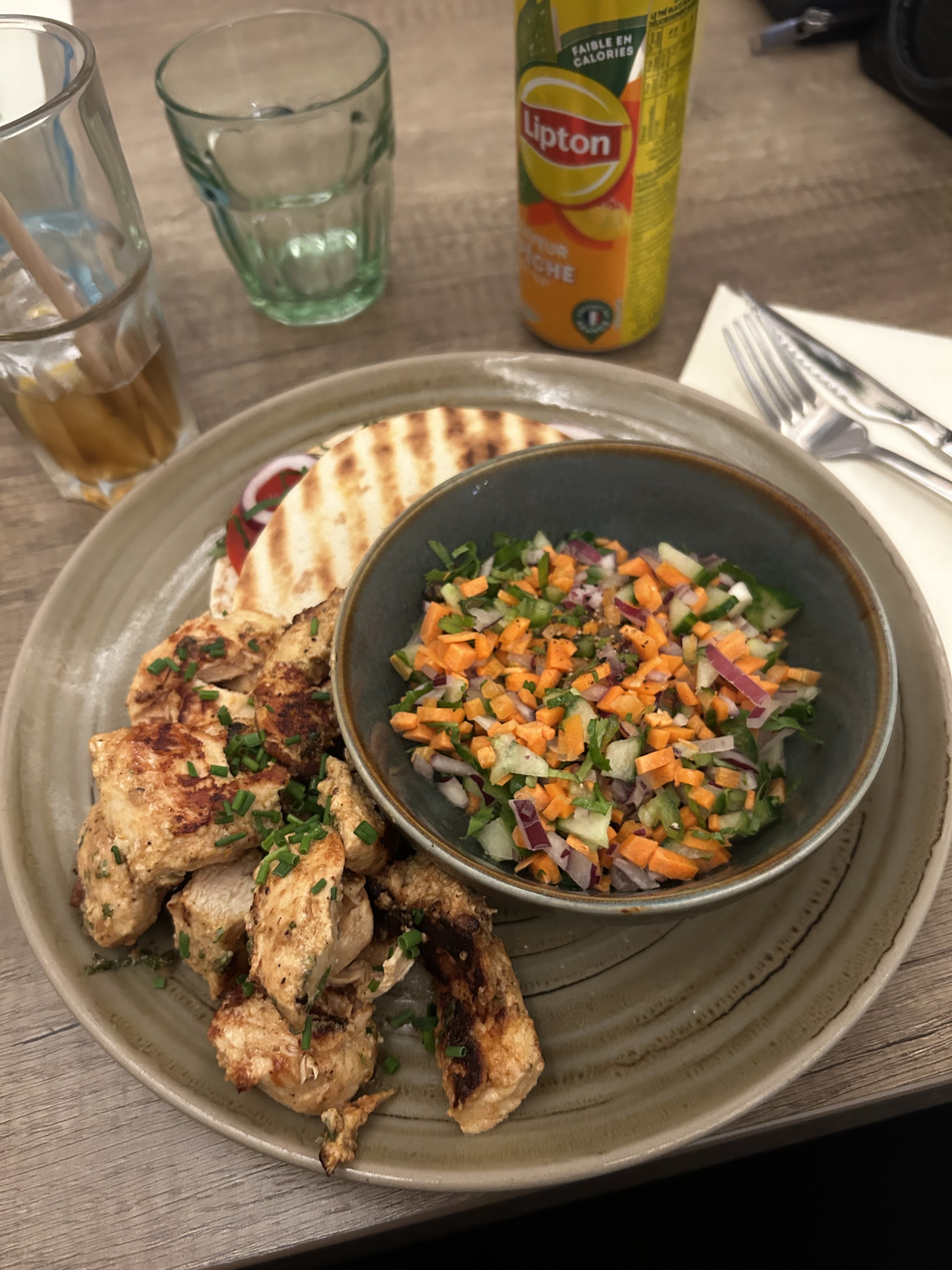 16€ le taboulé!!! 14€ la salade de chèvre chaud (c’est du chèvre en pâte donc pas du fromage normal)... pas de goût!!! Rien d’exceptionnel. Serveuse sympa.