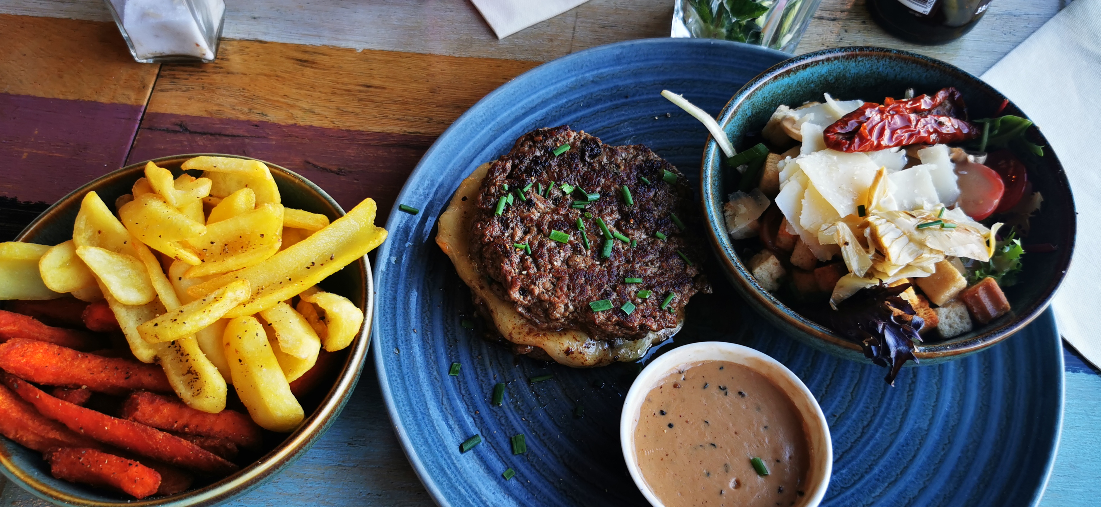Nous avons très très bien mangé et nous avons été très très bien reçud et servis. Les aliments (viande, légumes) sont très frais et de très bonne qualité. Je suis végétarienne et j'avais enfin du choix. J'ai choisi le burger falafel qui était vraiment excellent accompagné de salade fraîche et de frites maison. Mon compagnon a pris le filet de bœuf avec lequel il s'est régalé accompagné de salade fraîche et de frites maisons aux pommes de terre et aux patates douces... Un délice ! Nous avions une très belle vue sur la mer le long de la promenade et les prix restent tout à fait corrects. Le patron et le serveur savent très bien mettre les clients à l'aise. Nous y retournons régulièrement et nous ne sommes jamais déçus. Merci à vous !
