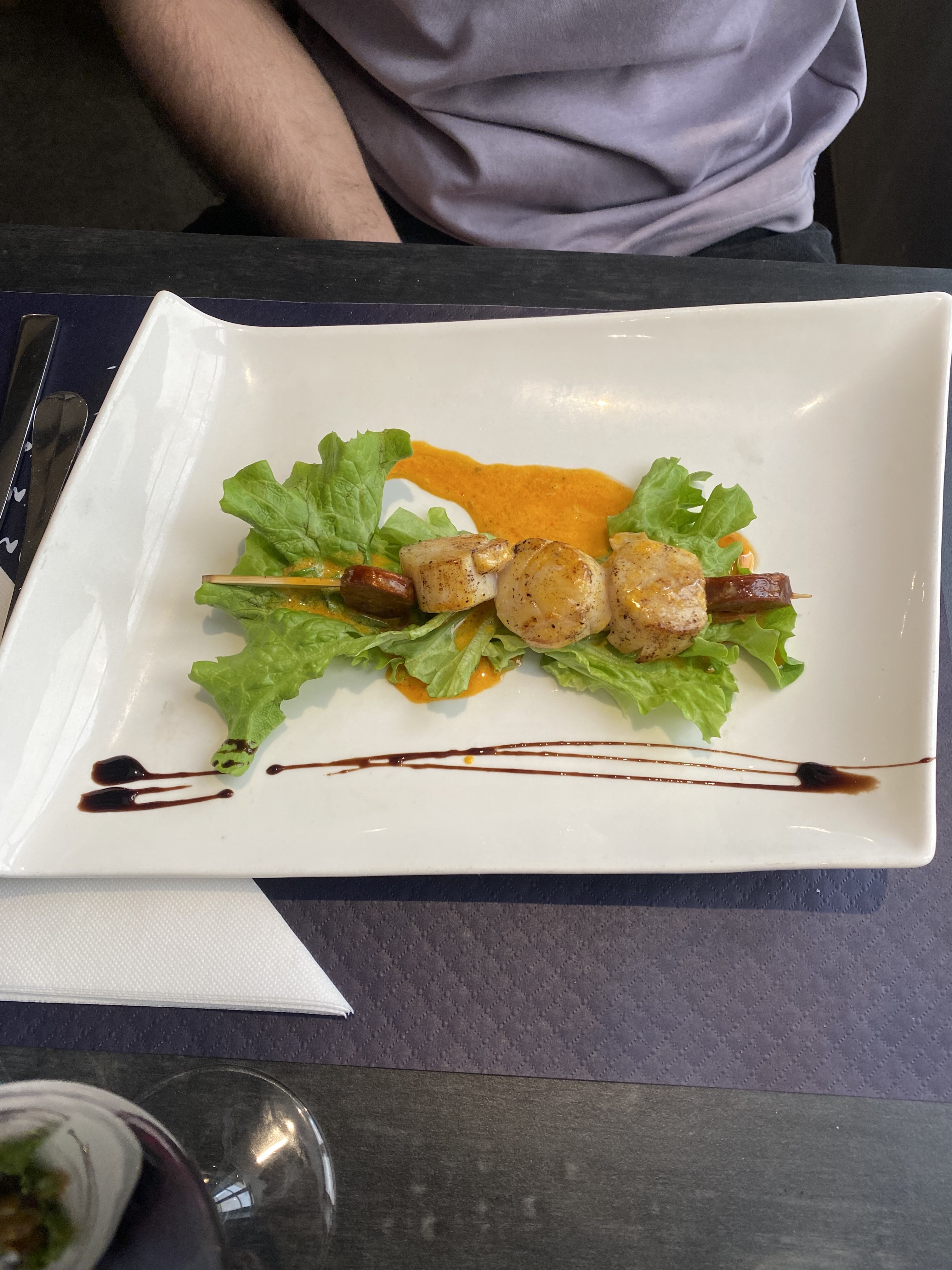 Après avoir vu les avis, nous avons voulu essayer ce restaurant. Intérieur ayant besoin d un rafraîchissement, présence de toiles d araignées. Apéros sans accompagnement, dommage. Salades chèvre chaud,un peu simpliste. Le foie gras bon, mais tranches fines par rapport à d autres restaurants. Une seule brochette de st jacques, ça fait juste. La viande très tendre,le dessert tarte tatin,on en a mangé de meilleure. Deux personnes en service trop juste,trop d attente. Comme quoi les avis faut pas toujours en tenir compte