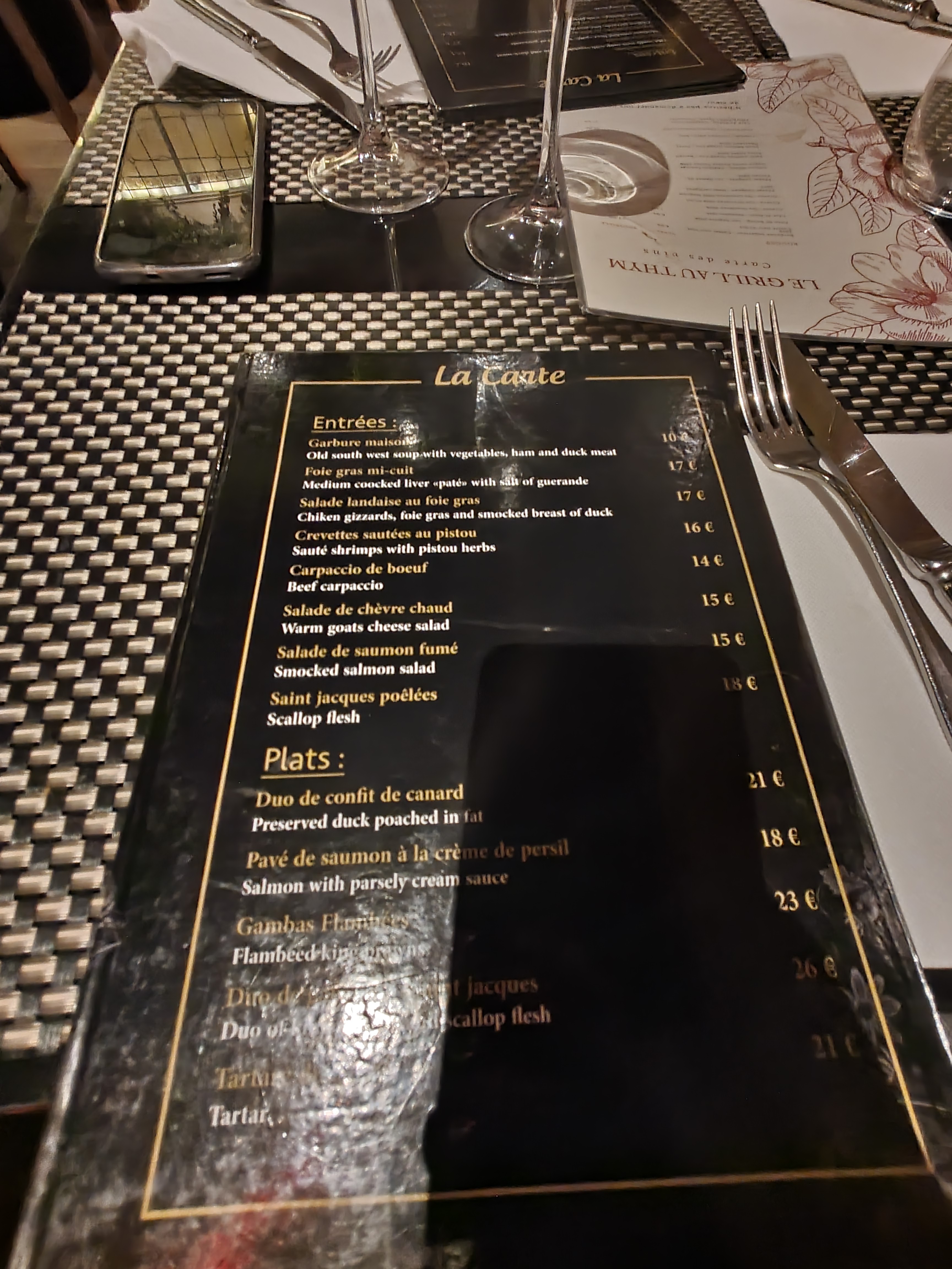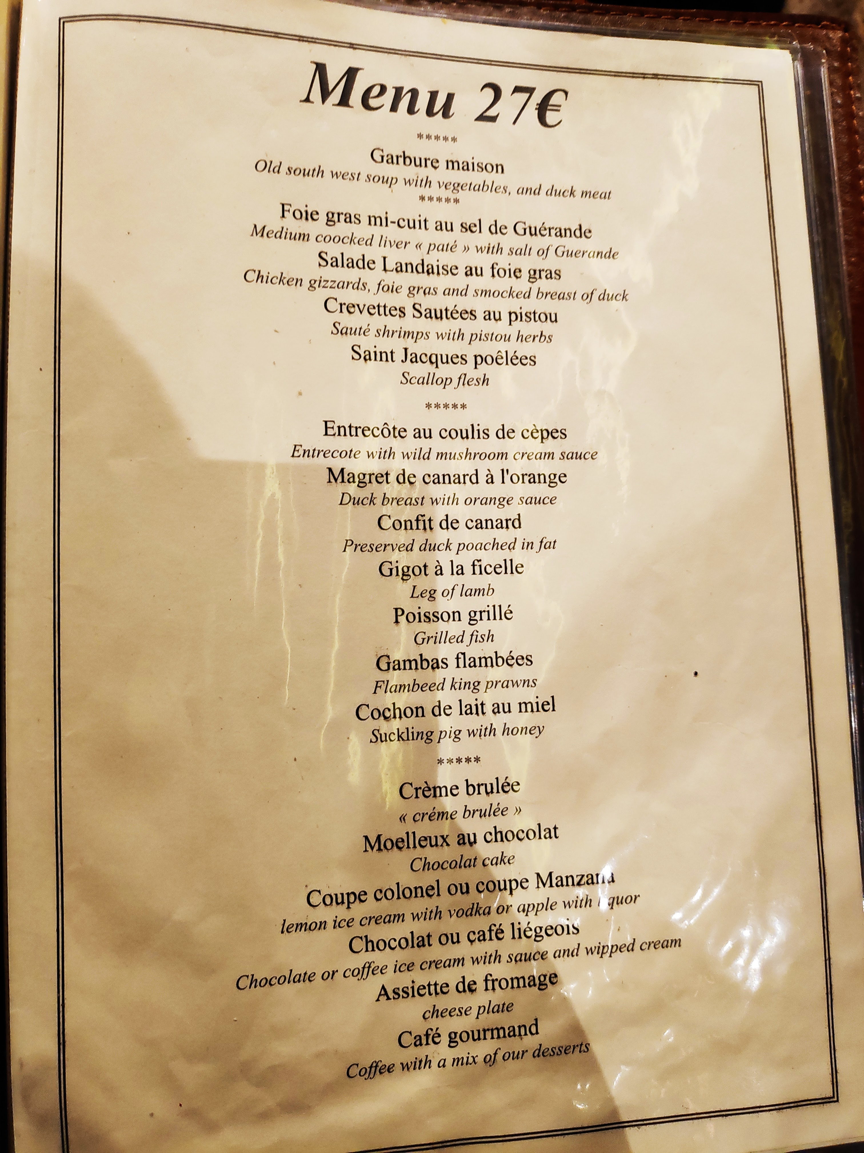 Menu à 27€. Garbure de caractère, foie gras mi-cuit fondant, cochon de lait au miel savoureux ... Bien conseillé pour le vin. Service au petit soin. Agréable soirée.