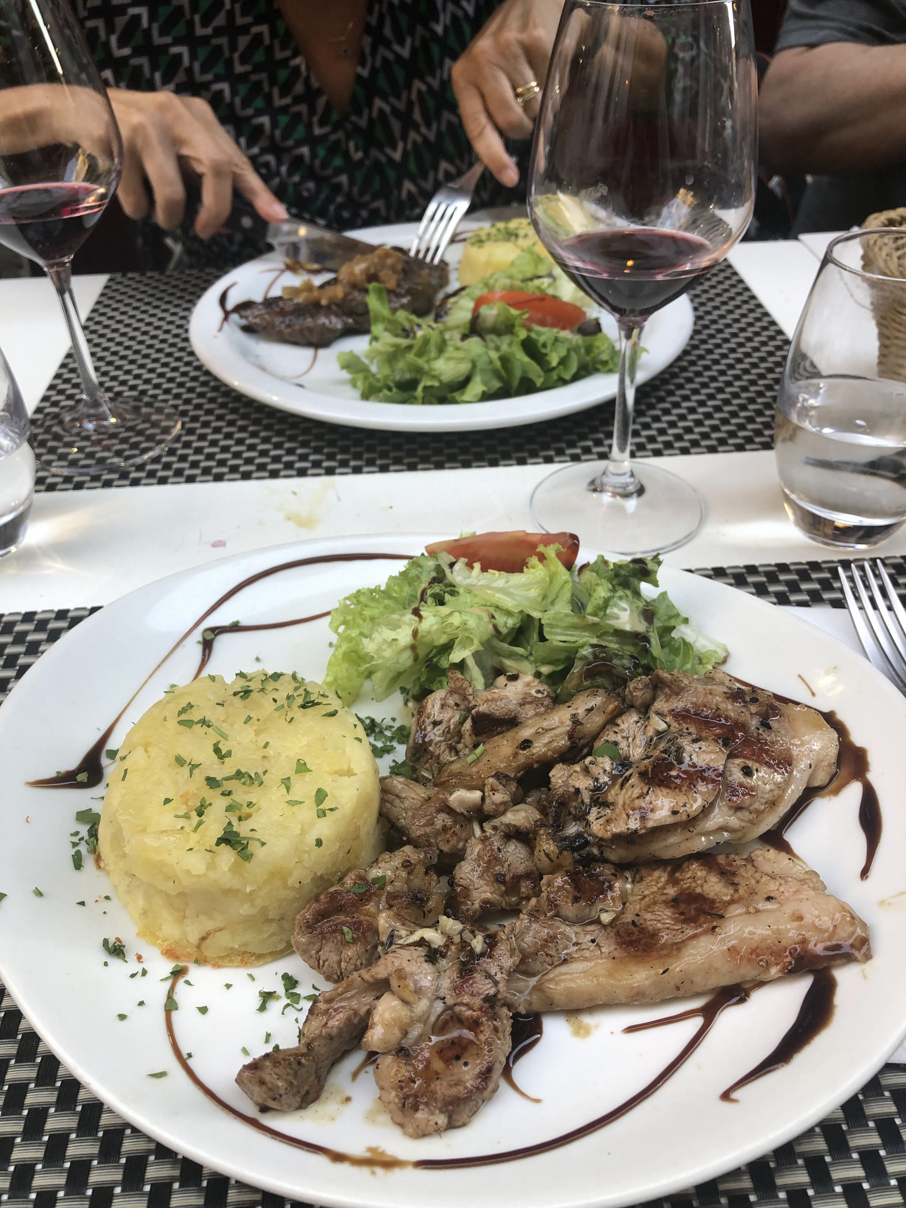 Nous n'avons pas apprécié ce repas. Un lundi soir humide de septembre n’est peut-être pas un bon test : il n’y avait pas beaucoup de monde et le grill n’était pas assez chaud, je dirais. J'ai eu l'agneau : pas savoureux, trop gras par endroits et pas cuit sur un grill assez chaud. Celui-ci et la purée de pommes de terre qui l'accompagnait étaient insipides et seulement chauds. Le canard que mon mari avait était un bon morceau de viande mais pas cuit correctement : pas croustillant, etc., et seulement tiède - pas chaud. La laitue râpée avait une vinaigrette pas très savoureuse. Le personnel était agréable, même si une serveuse semblait en être à sa première nuit et légèrement terrifiée. Pourtant, nous devons tous commencer quelque part. Le vin était bon