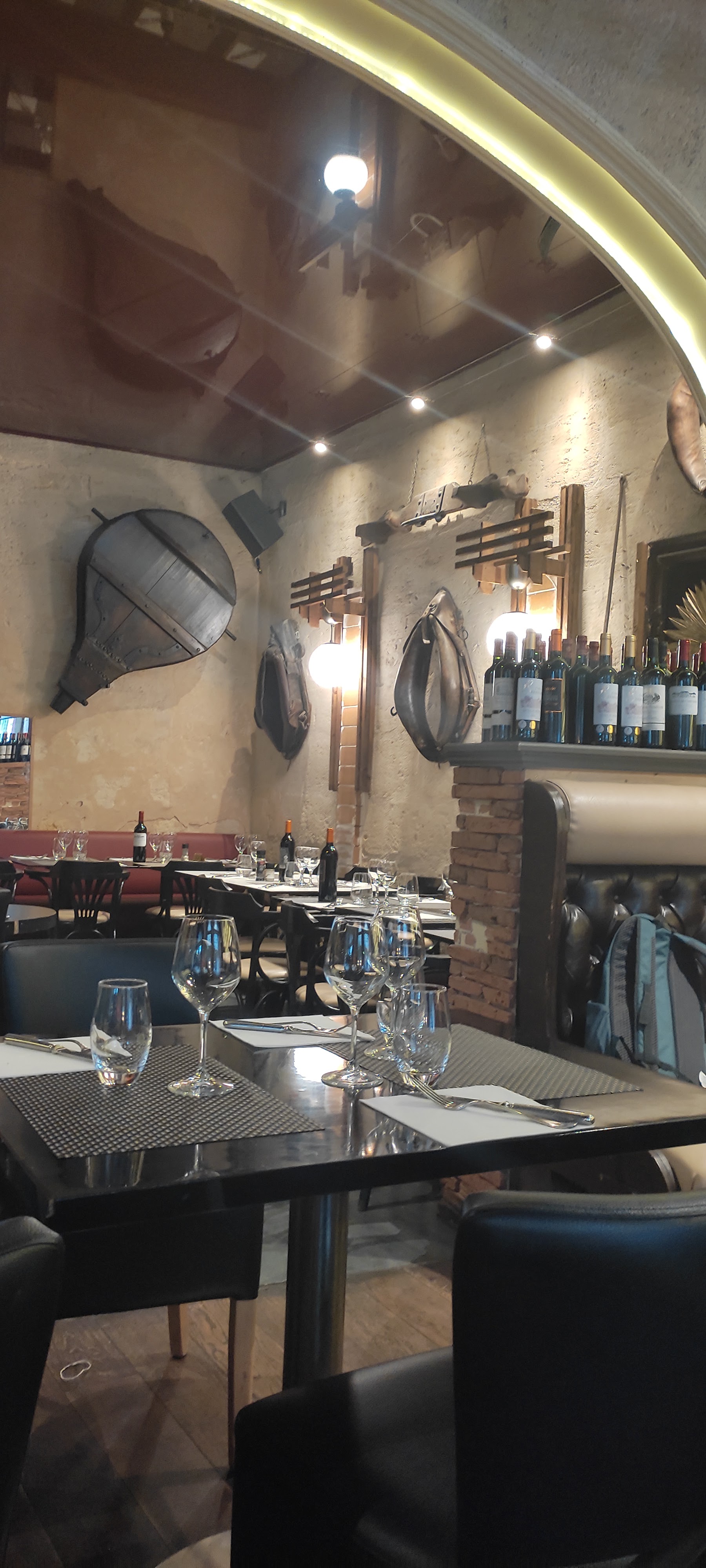 la viande: délicieuse, le champagne également;), et le service impeccable serveur sympathique et jovial tout cela dans un cadre magnifique la déco s’accorde parfaitement avec la nourriture ! foncez !