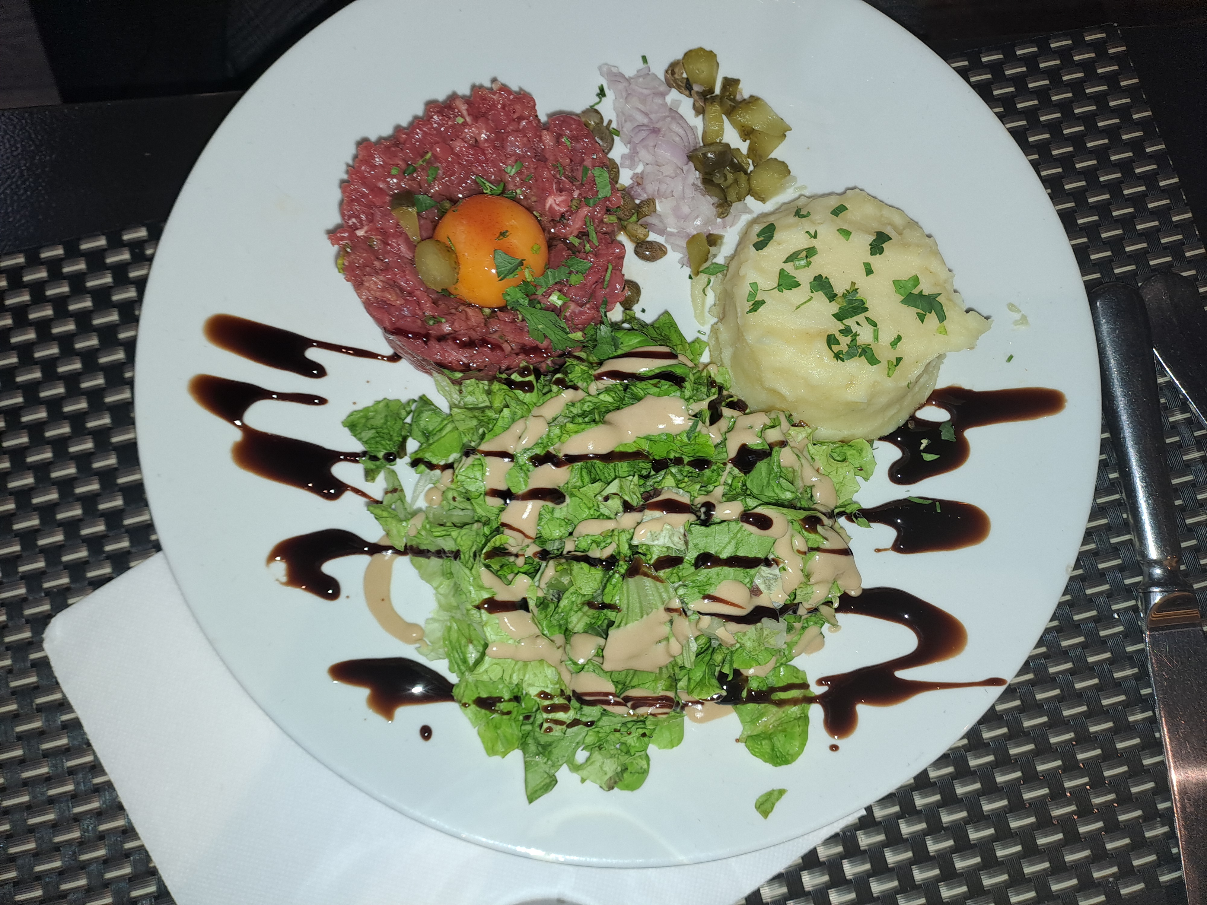 Mon chérie à pris une côté de boeuf à 25€ à la carte. Niveau quantité il y avait ce qu'il fallait. Mais par contre il était sec. Pas de sauce pour accompagner la viande et l'accompagnement est imposé donc pour ceux qui ne sont pas fan de pomme de terre... Mon entrée saumon fumé était bon. Par contre le plat pavé de saumon très douteux la fraîcheur du saumon, il était froid. Niveau ambiance serveur à l'écoute et disponible.