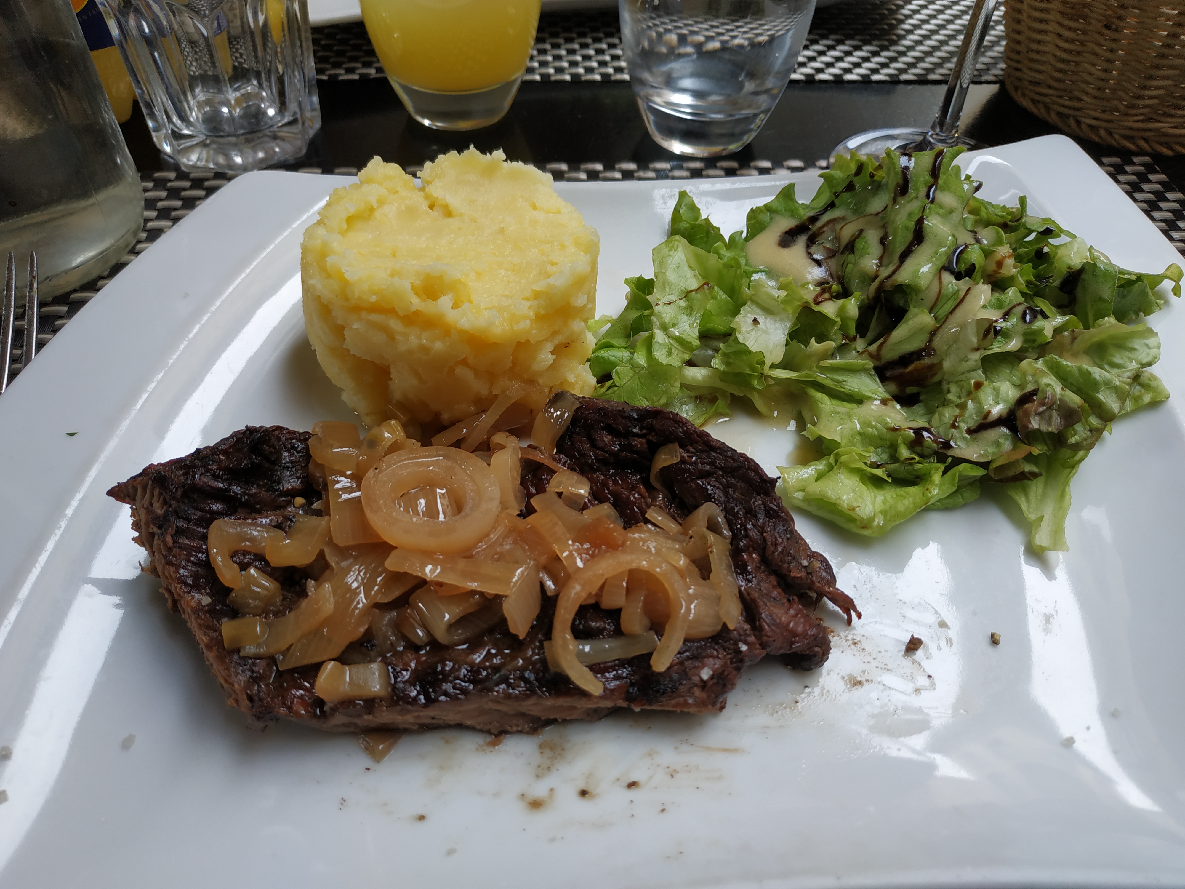 Bonne nourriture. Service amical. J'ai pris le menu à 25 €. 4 plats et eau inclus. Une bonne sélection comprenant un steak joliment cuit pour le plat principal. La serveuse parlait anglais mais était heureuse de me laisser utiliser mon mauvais français et était serviable et patiente. Je le recommanderais certainement